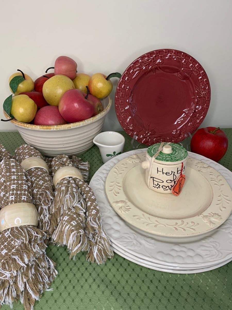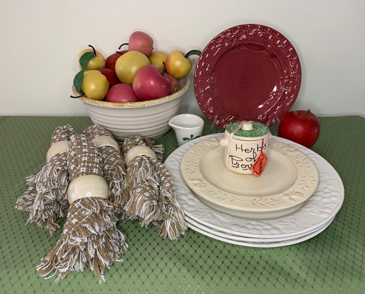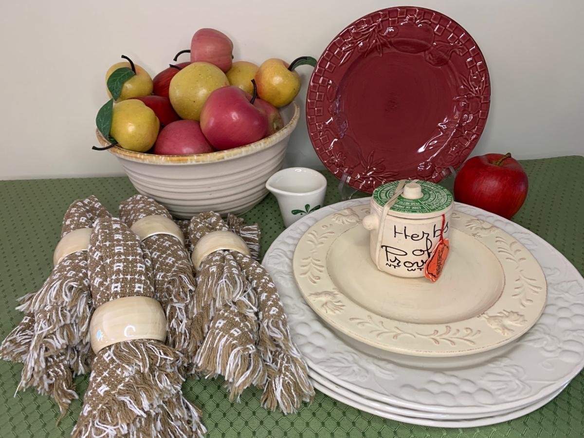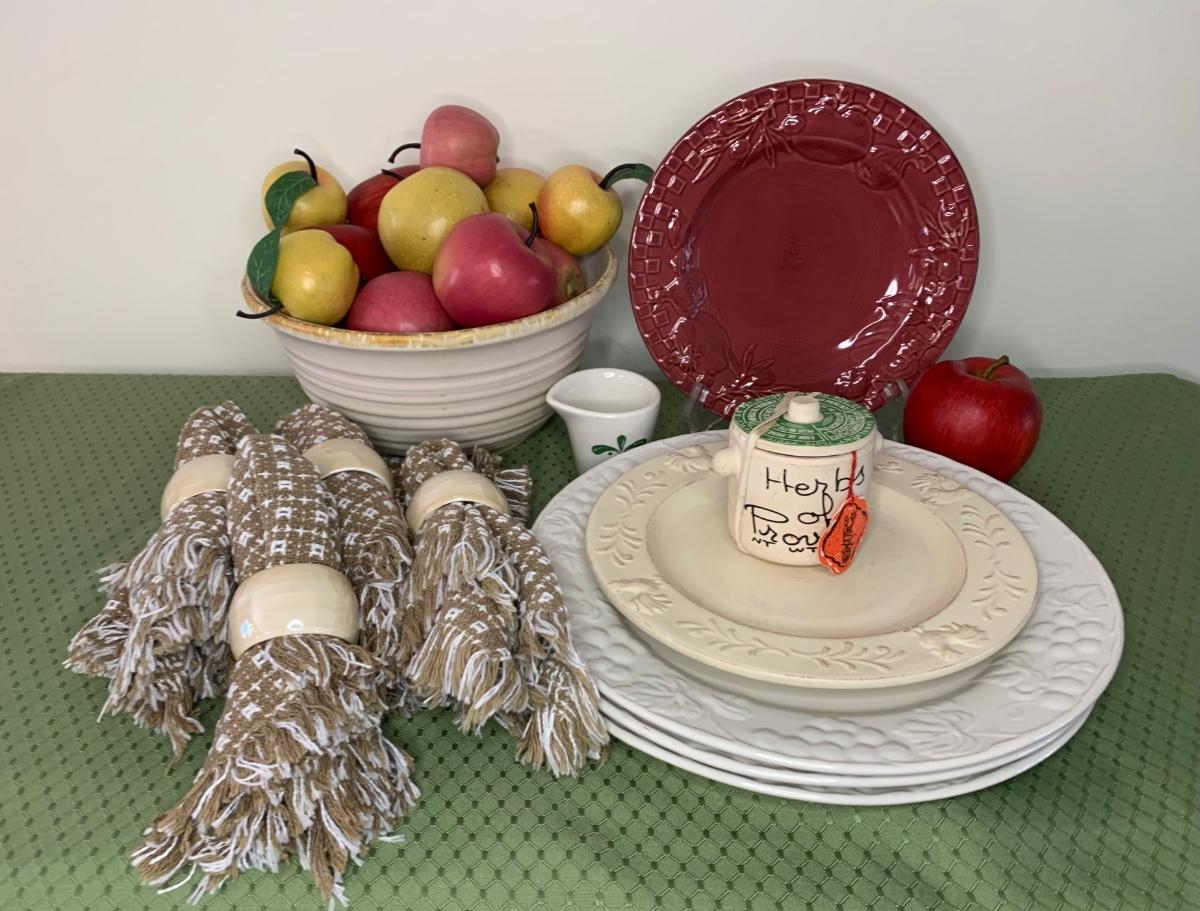 LOT 84R: Home Decor & More: Sonoma Ware Stoneware, Country Cloth Napkins,Bowl w/Faux Fruit & More