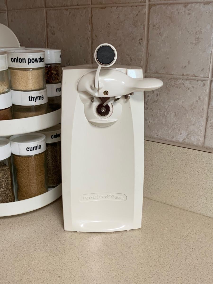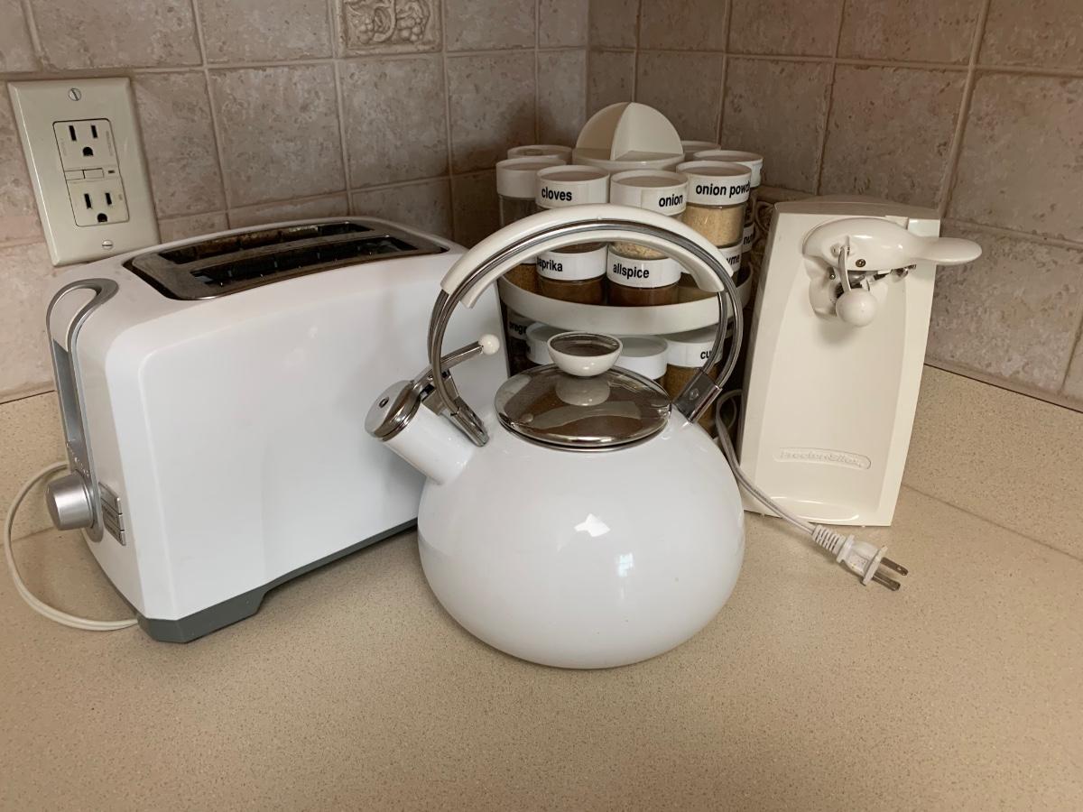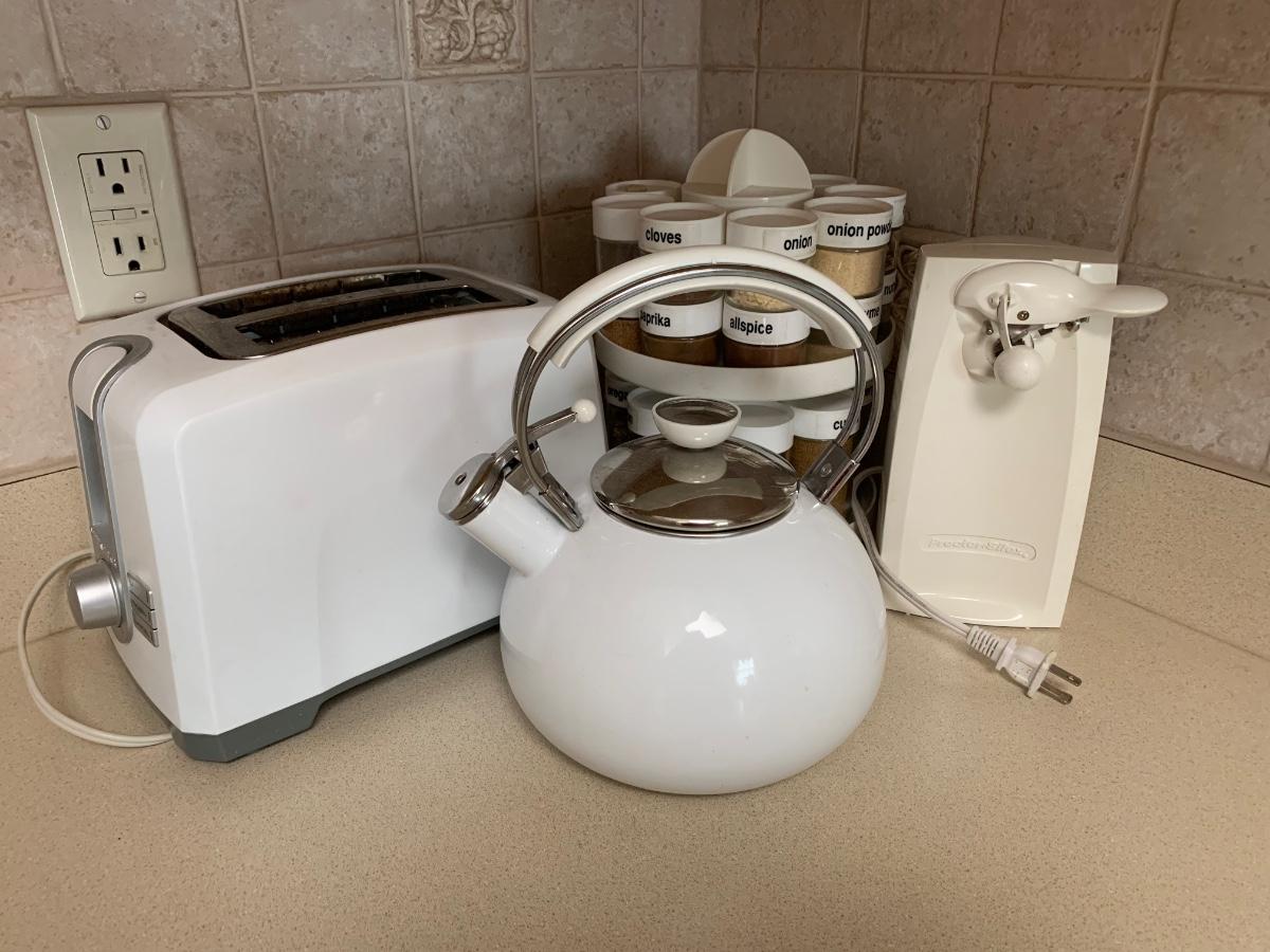LOT 85R: Black & Decker 2-Slice Toaster Proctor-Silex Electric Can Opener, Tea Pot & Spinning Spice Rack