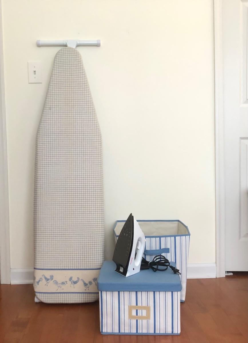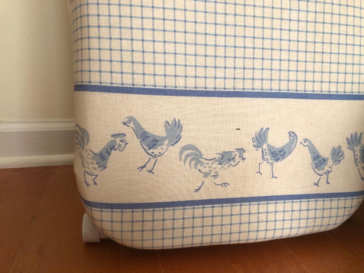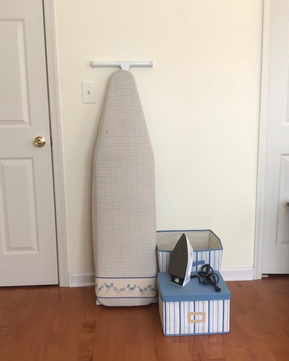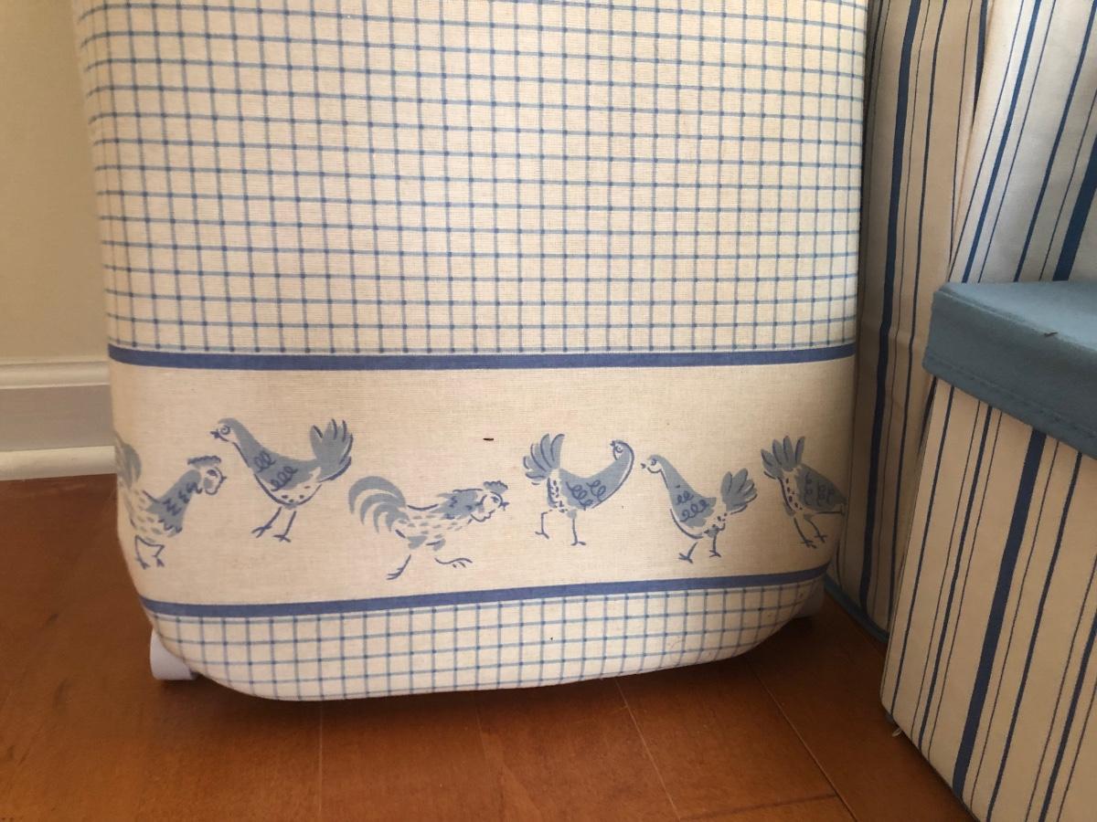 Ironing board with a blue and white plaid cover with rooster details on the bottom. It is used with a stain on it (see photos). Iron is a Sunbeam model 3935. Blue striped baskets included.