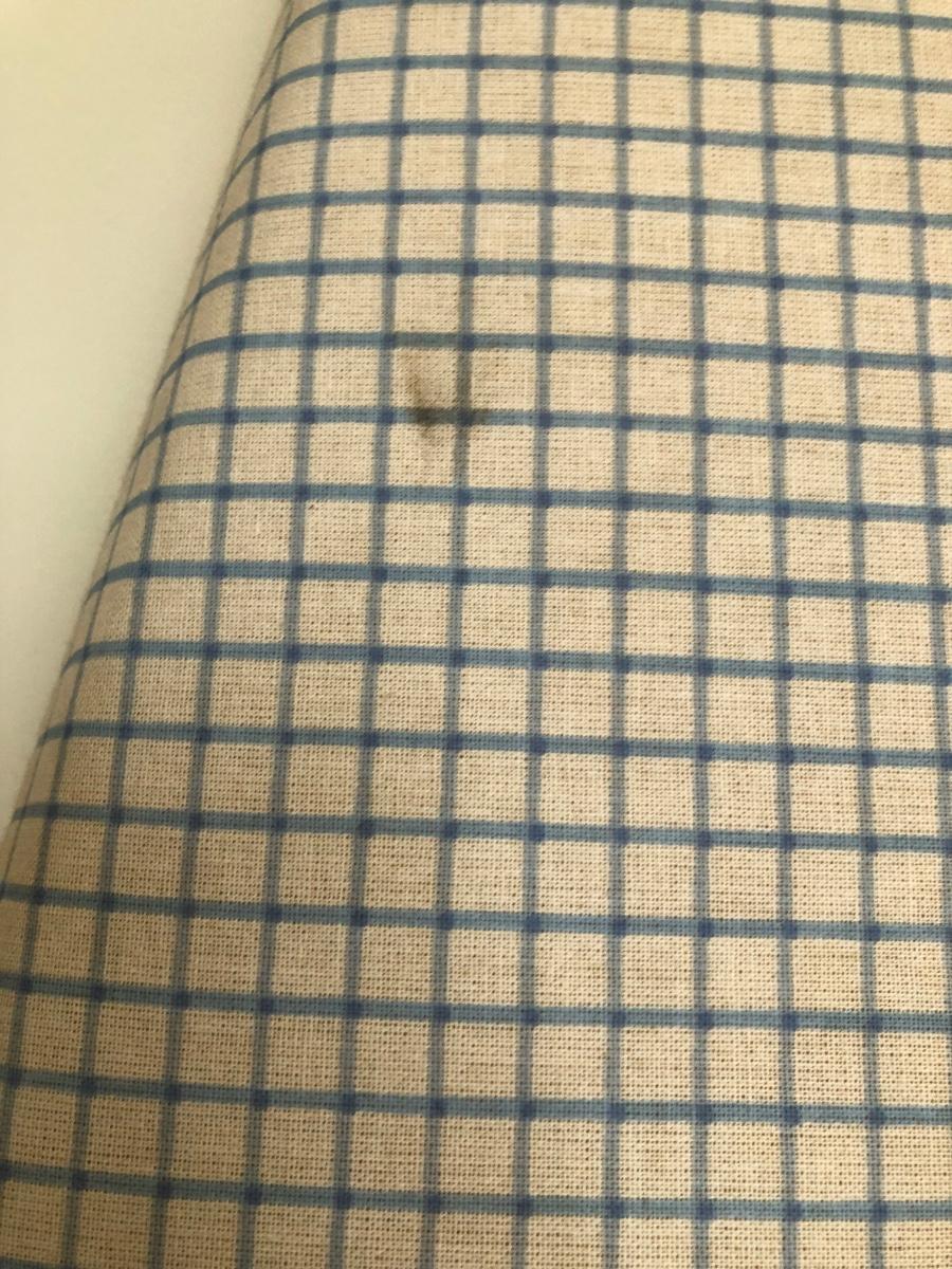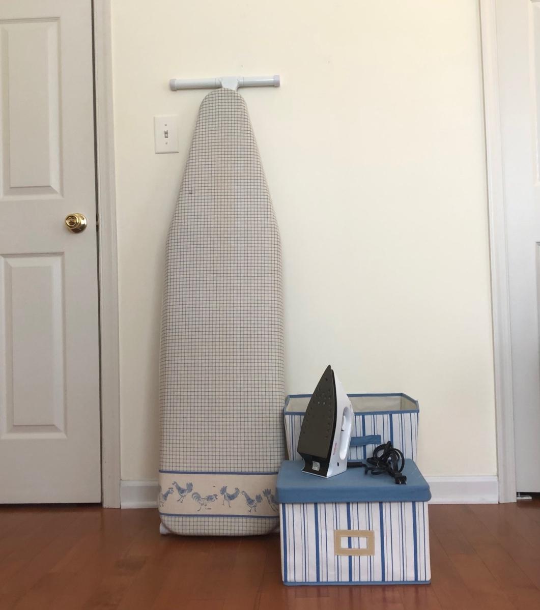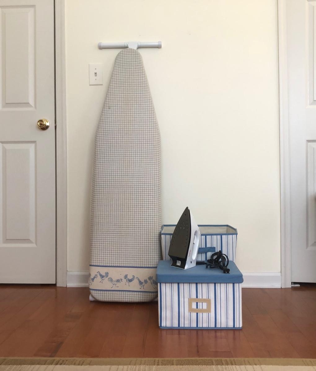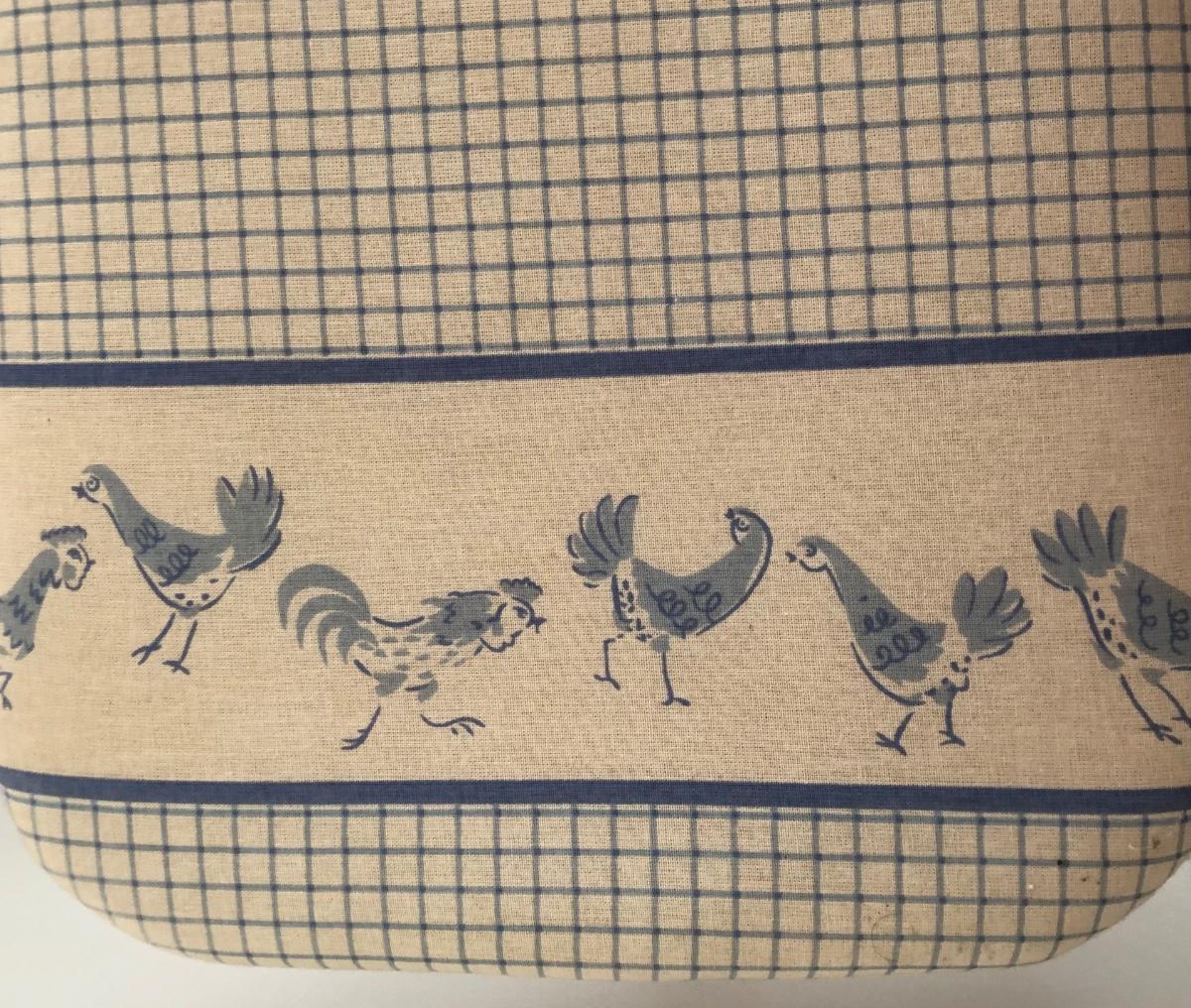 Ironing board with a blue and white plaid cover with rooster details on the bottom. It is used with a stain on it (see photos). Iron is a Sunbeam model 3935. Blue striped baskets included.