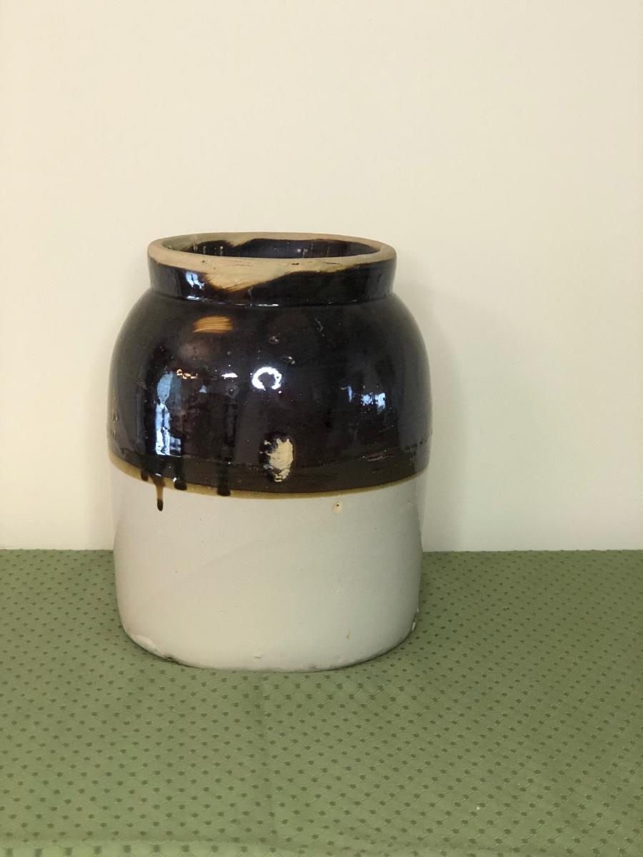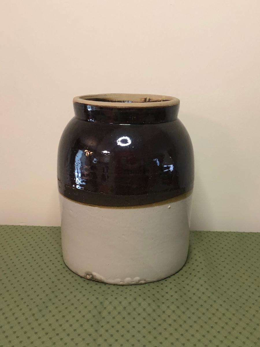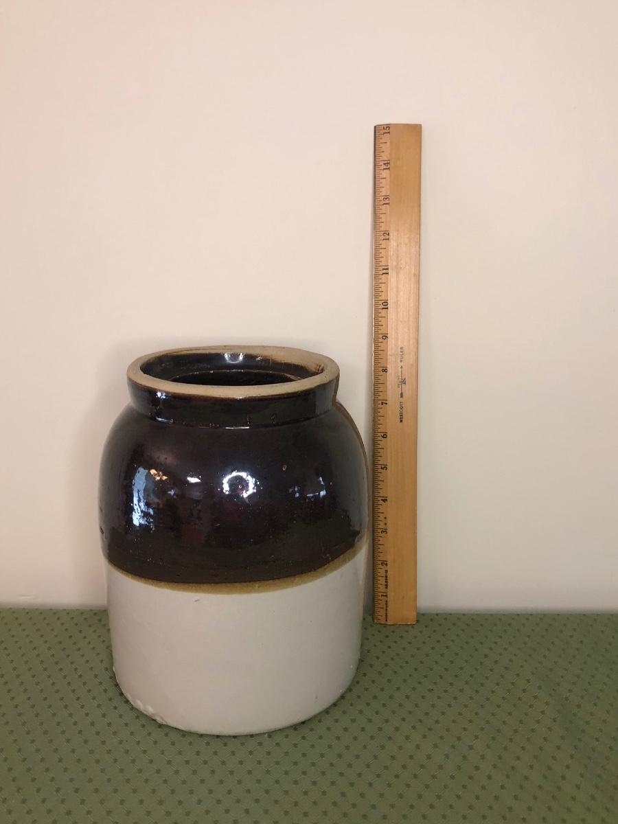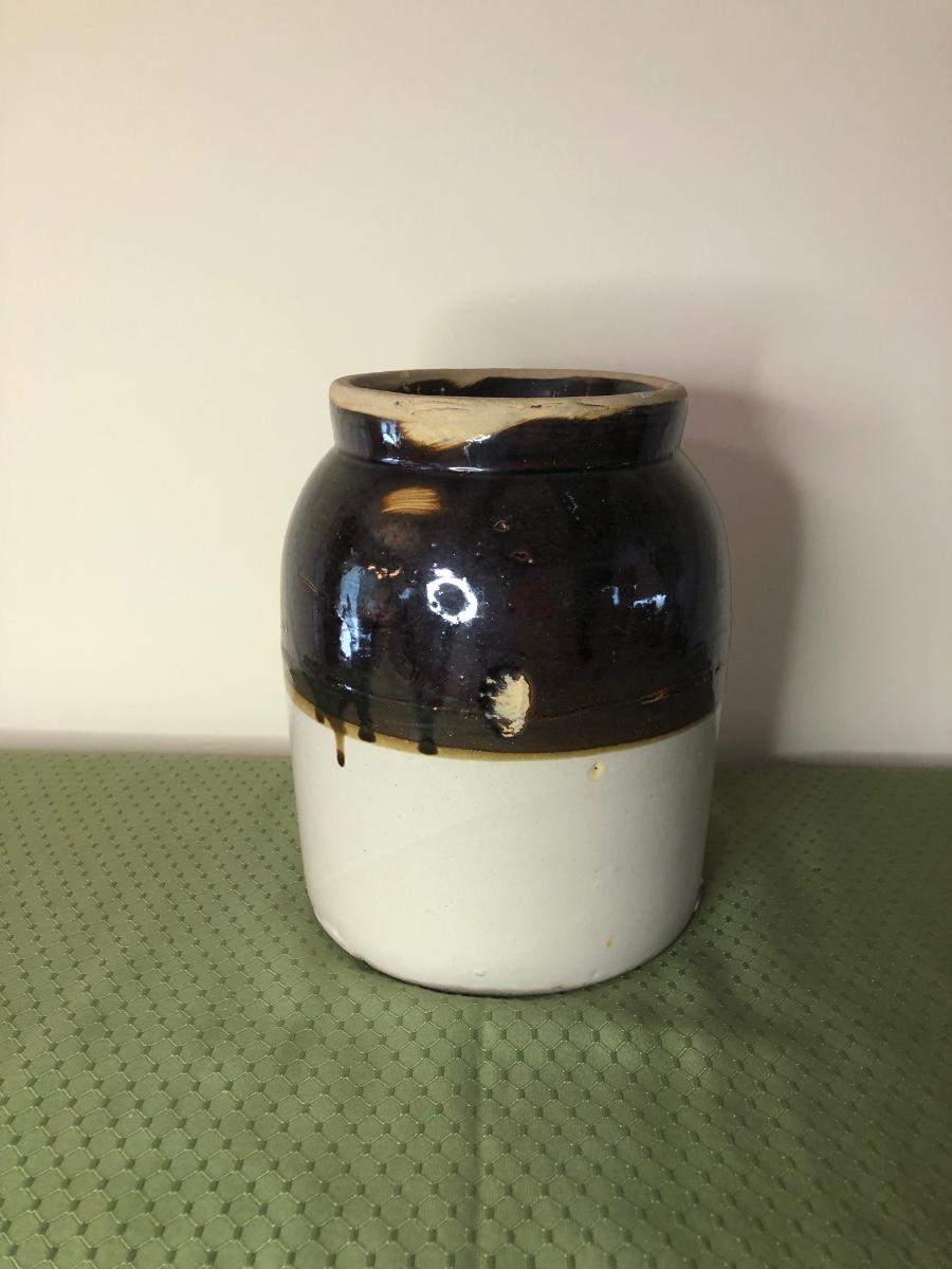 This vintage pottery crock is glazed on top and left raw pottery on the bottom. It has no lid and has some noticable wear and stains (see photos).