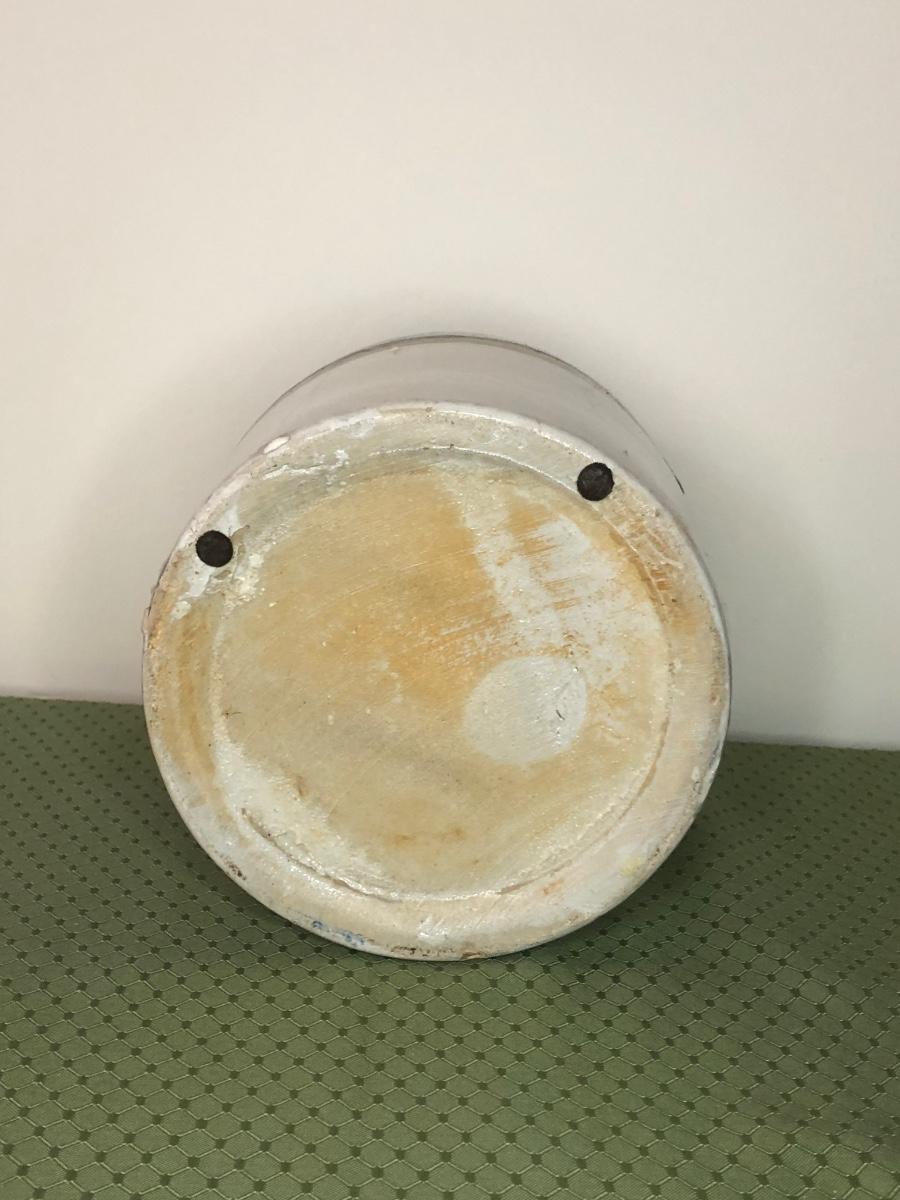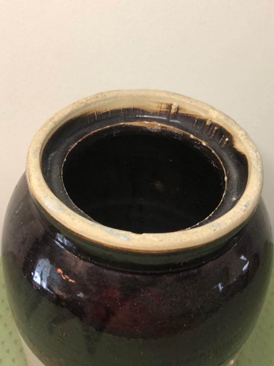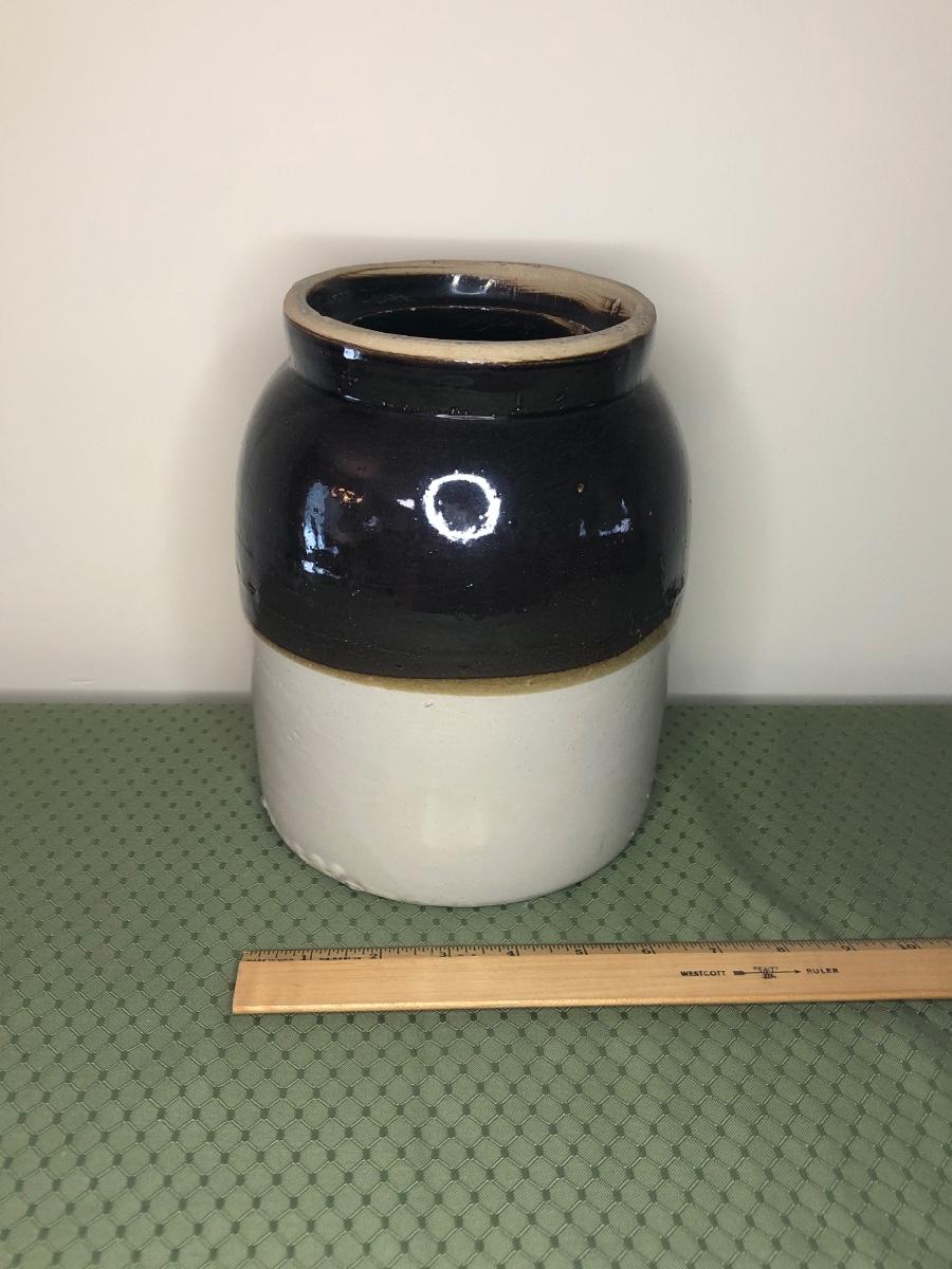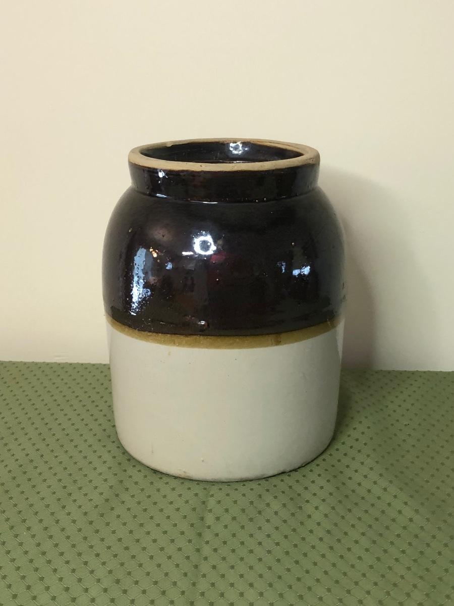 This vintage pottery crock is glazed on top and left raw pottery on the bottom. It has no lid and has some noticable wear and stains (see photos).