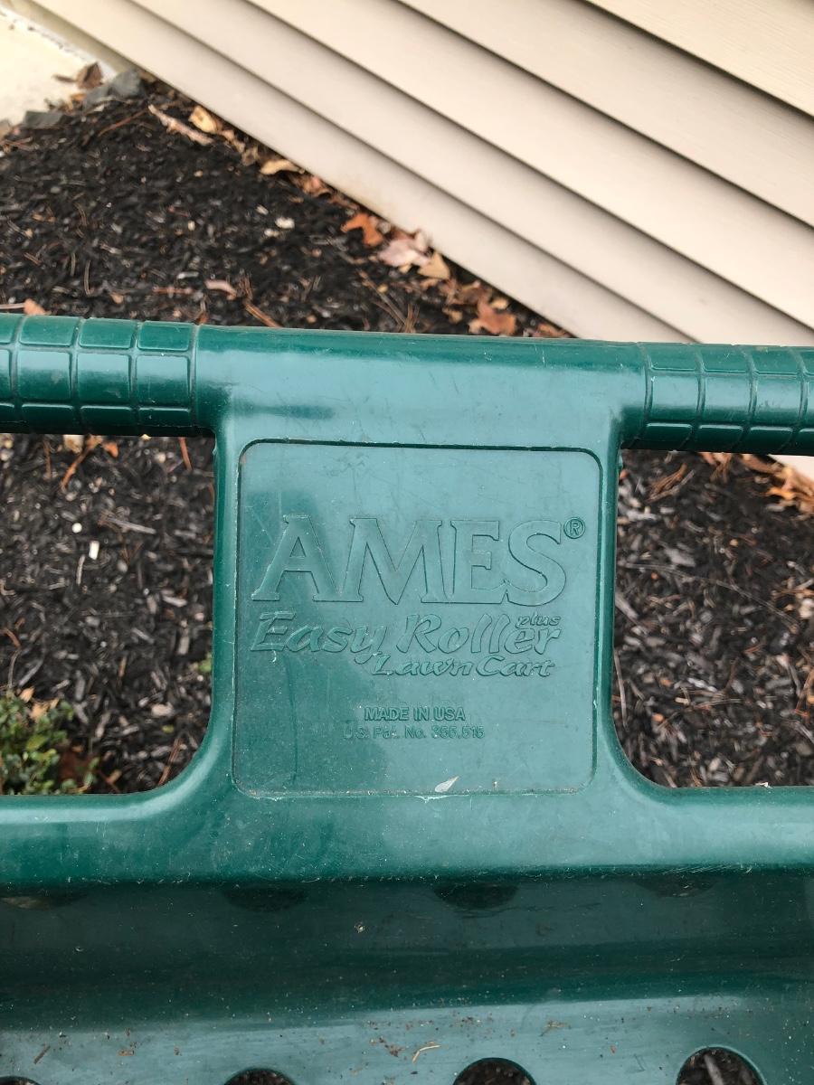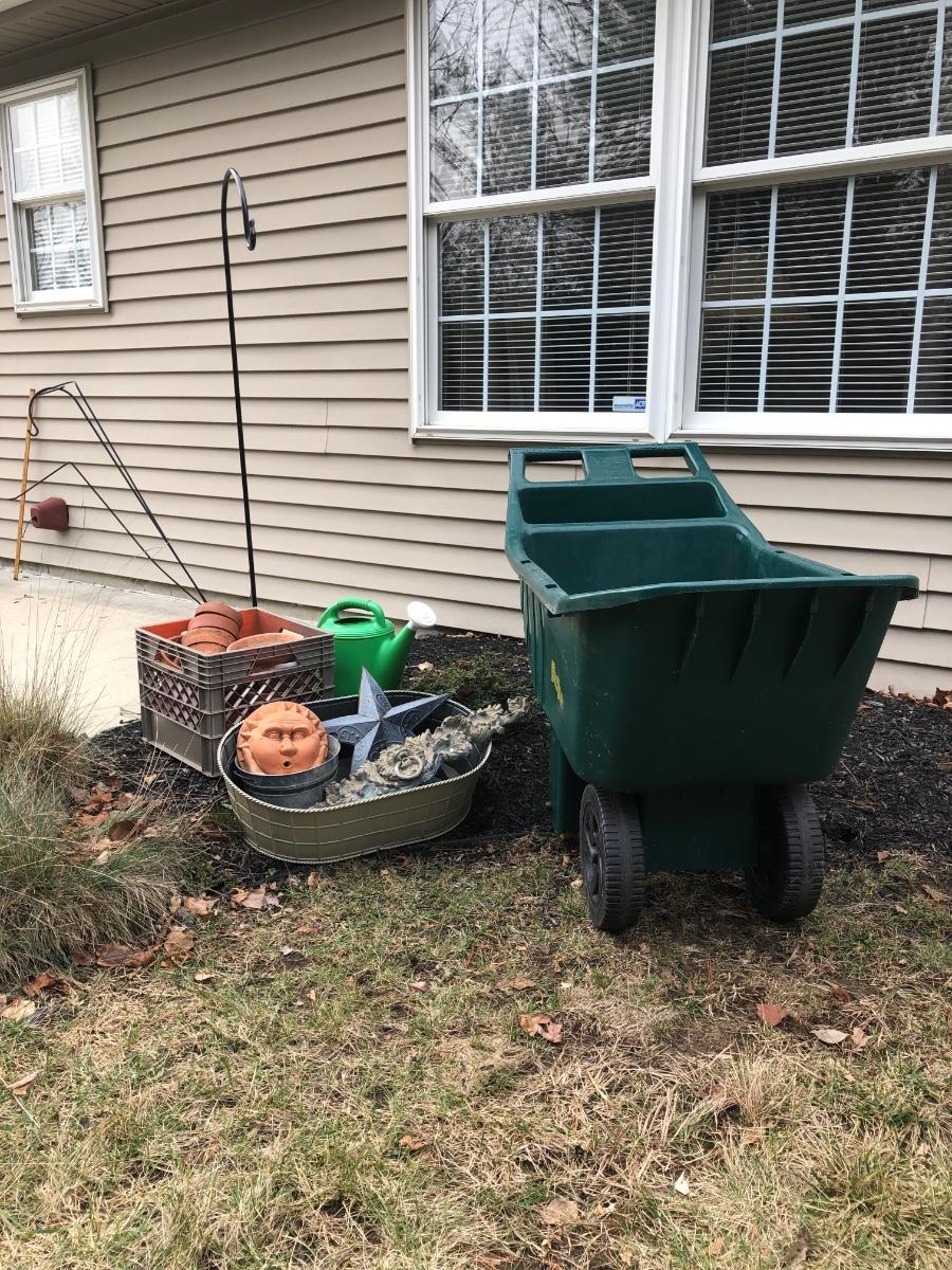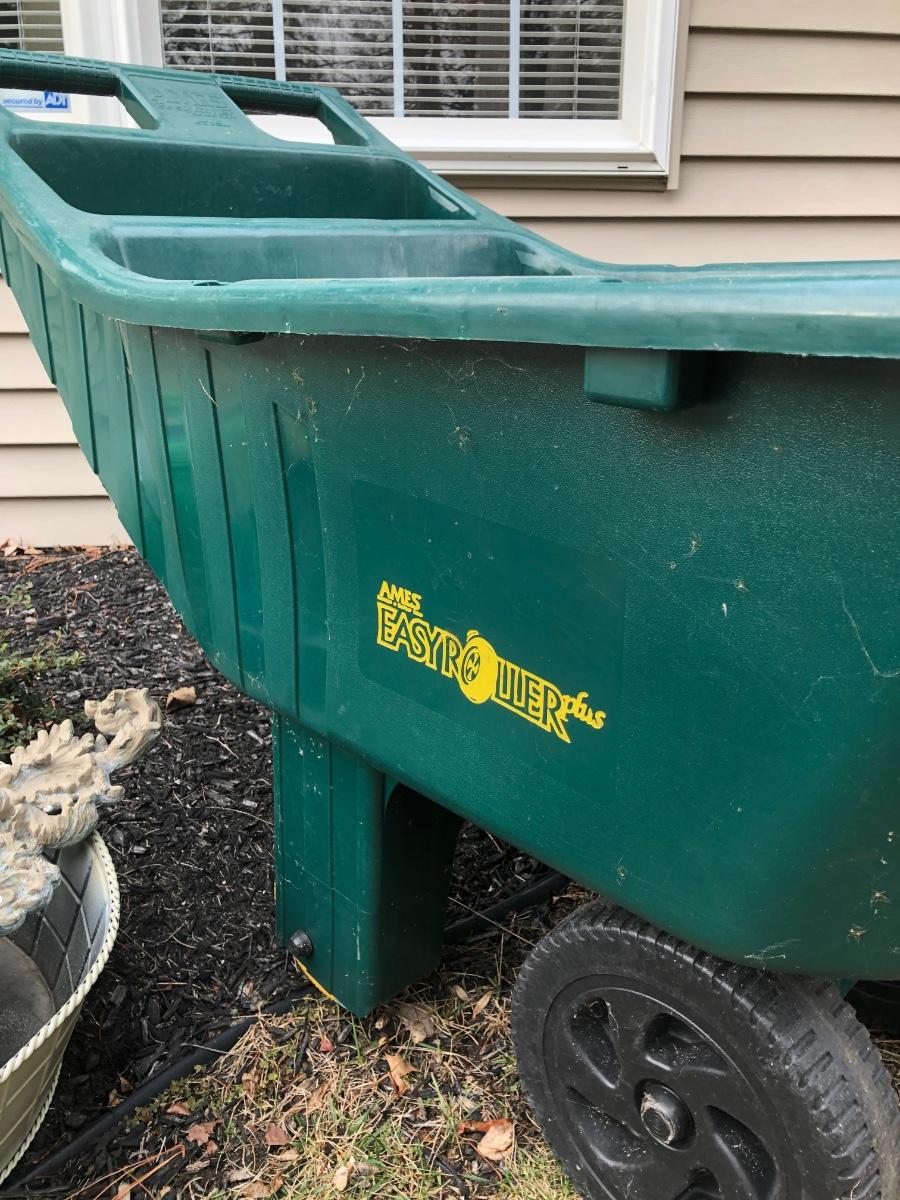 Wheel barrow is a green Ames Easy Rower Plus. It is in good condition and moves easily. Includes crate with pots, metal ground stands, and pictured garden decorations.