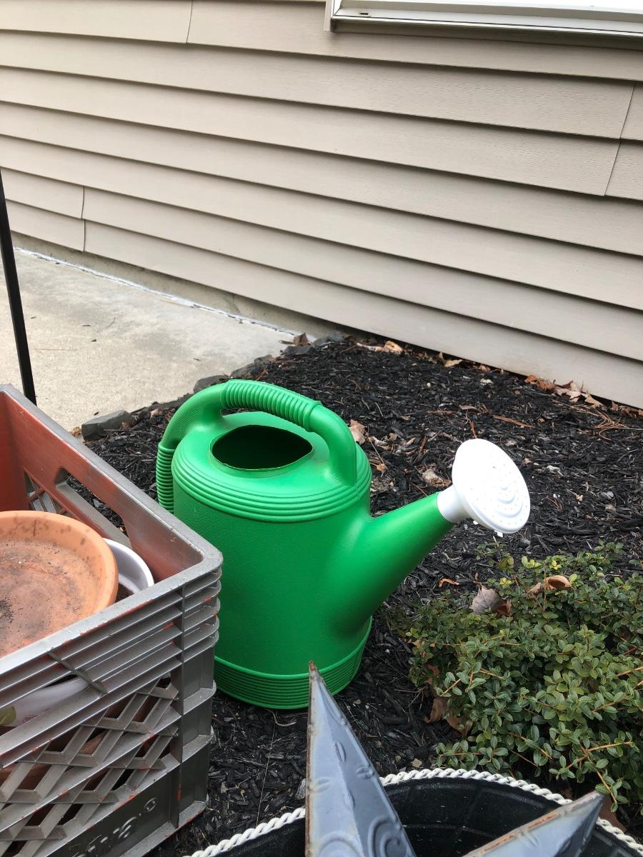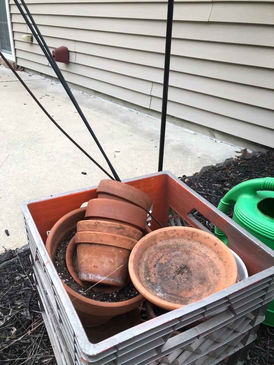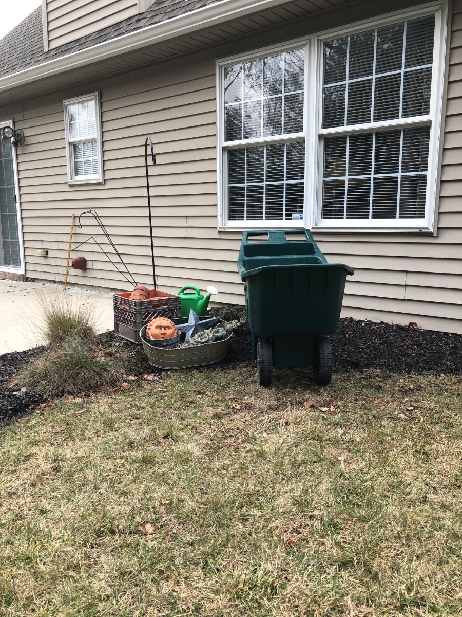 Wheel barrow is a green Ames Easy Rower Plus. It is in good condition and moves easily. Includes crate with pots, metal ground stands, and pictured garden decorations.