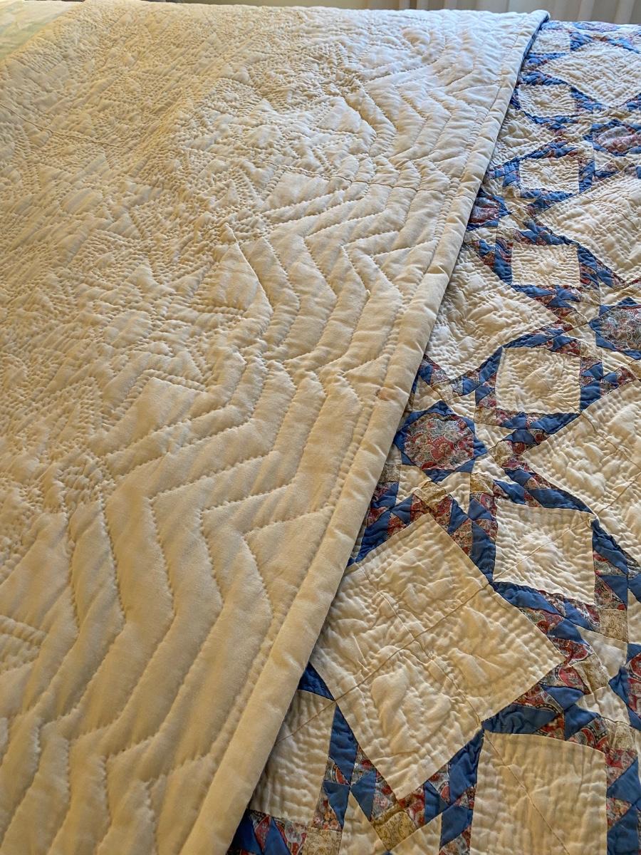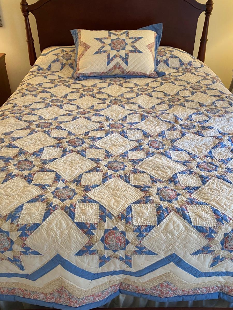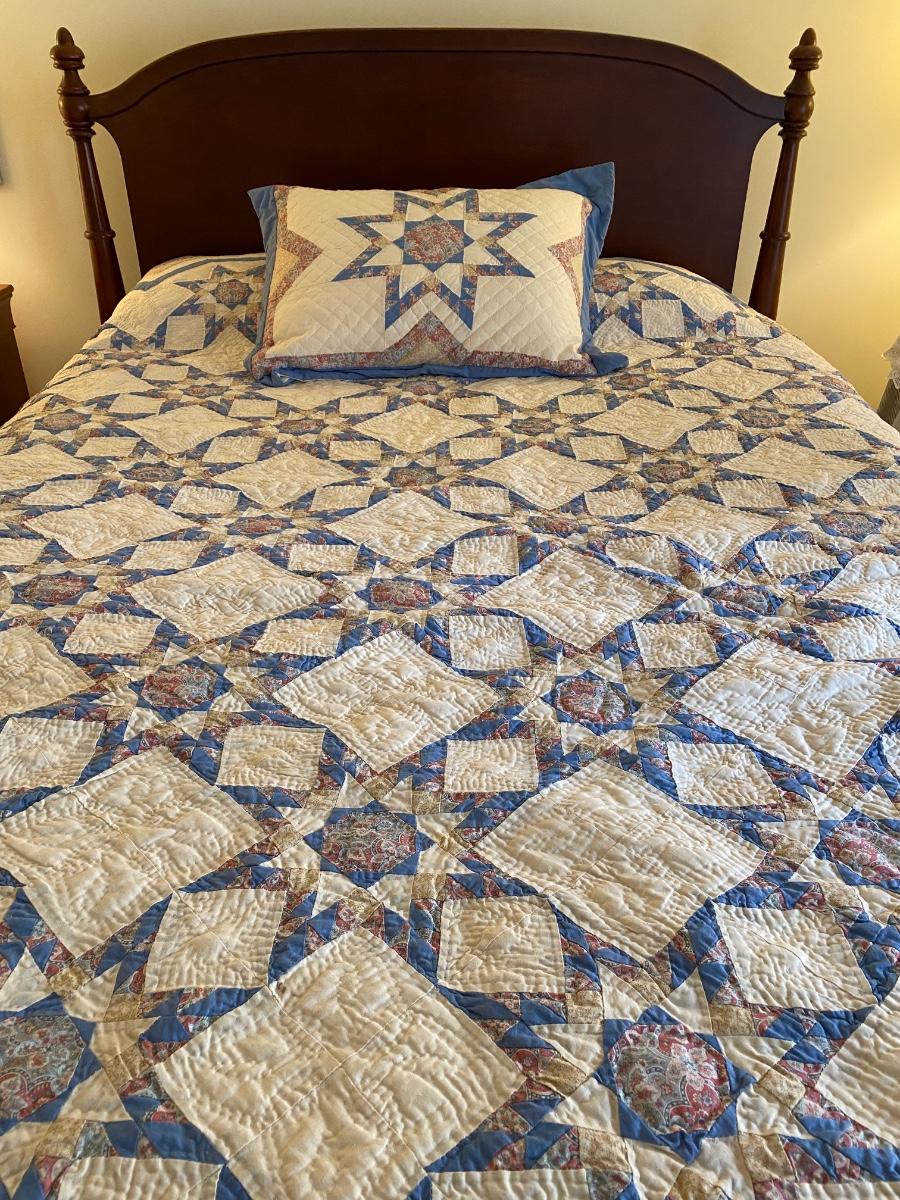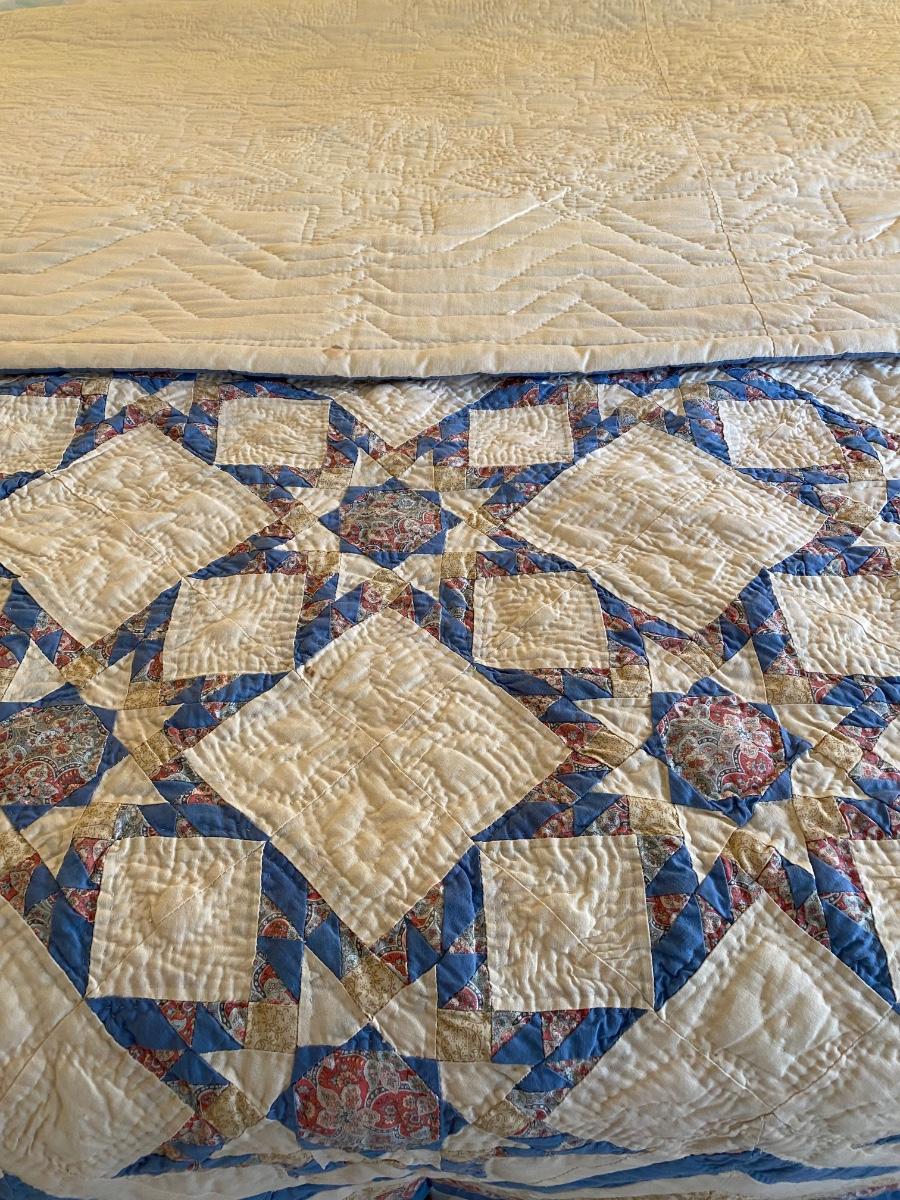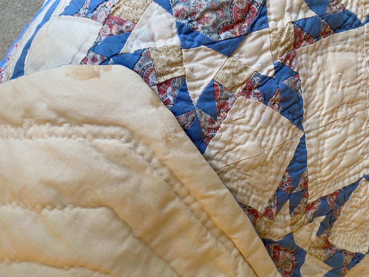 Quilt is in used pre- loved condition. Quilt has marks as pictured. Please see all pictures as they are the best representation of the items. The pictures show condition, measurements if taken, and what is included in the lot. Due to the large amount that we photograph and the time frame, we are not always able to take measurements. All items unless noted, are pre-owned and have been used. If you purchased furniture, you must bring help. We do not allow one person to carry large furniture out on their own. Bring help, tools and a truck for the safety of our client’s homes, and your personal safety. Any damages that result to the property including walls, and floors due to moving of the furniture will be charged to the buyer. Company policy. Thank you.
