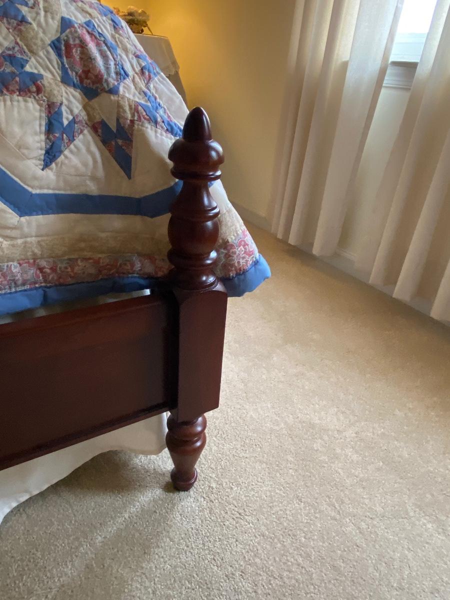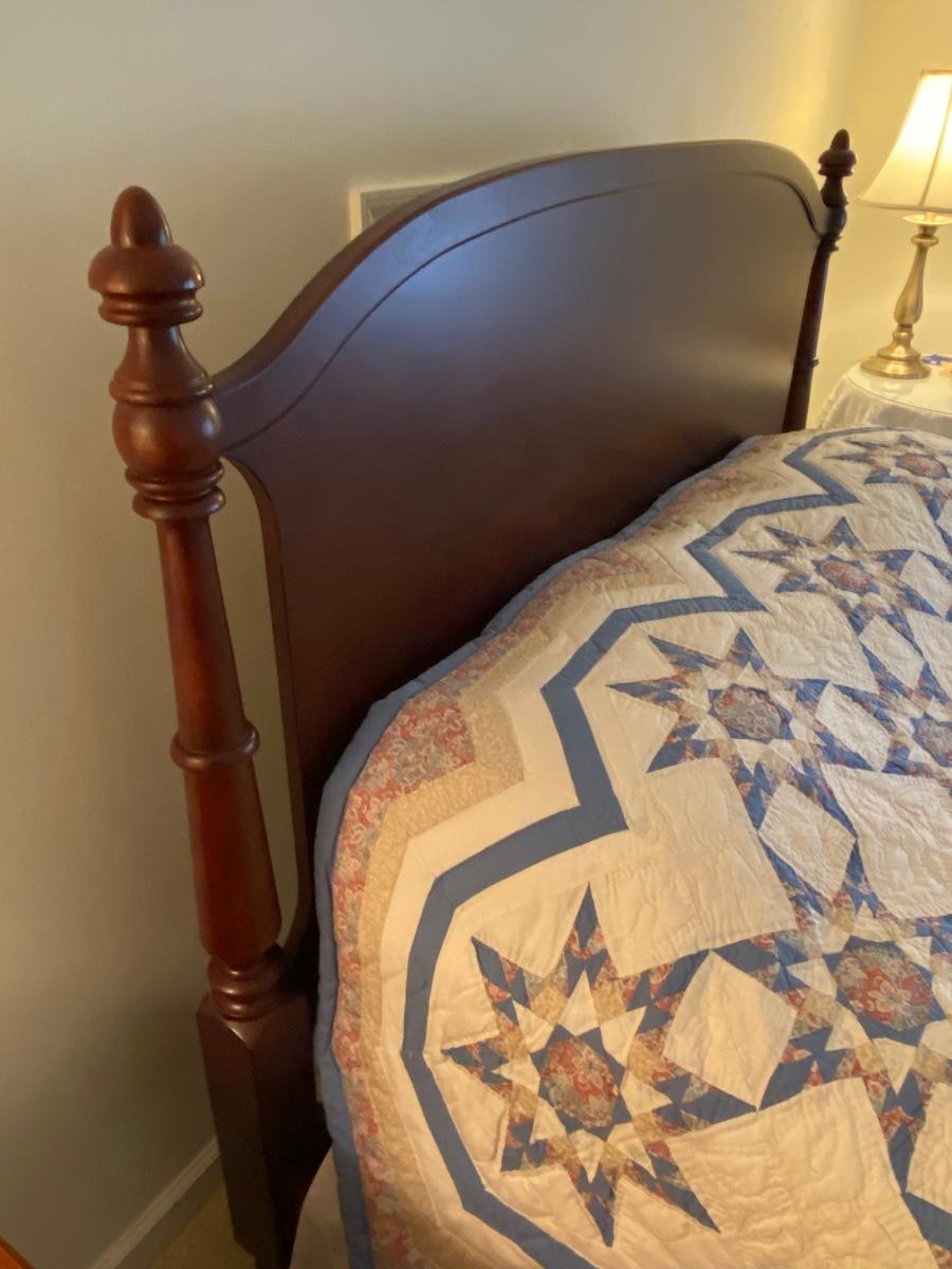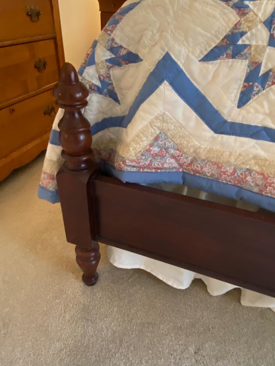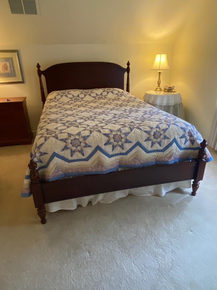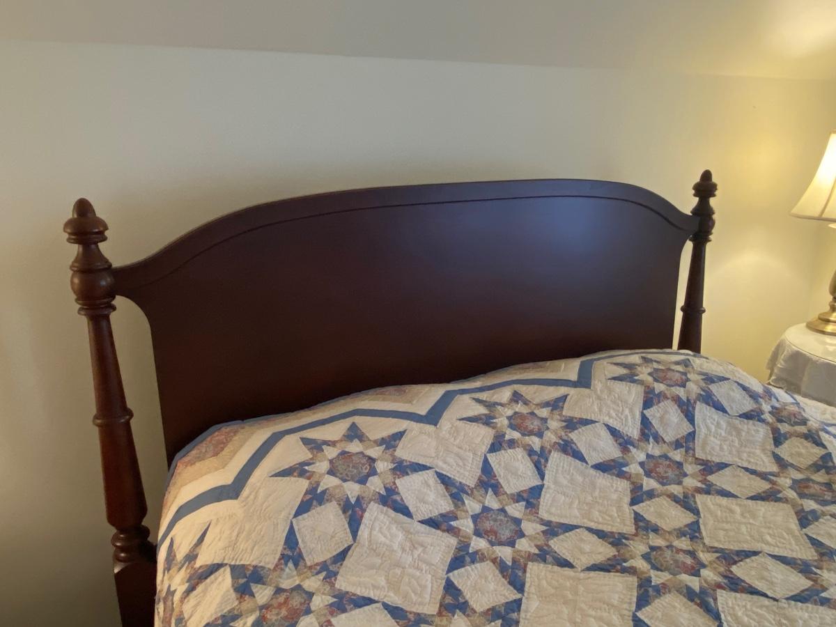 Dark Wood queen bed includes headboard and foot board. Please see all pictures as they are the best representation of the items. The pictures show condition, measurements if taken, and what is included in the lot. Due to the large amount that we photograph and the time frame, we are not always able to take measurements. All items unless noted, are pre-owned and have been used. If you purchased furniture, you must bring help. We do not allow one person to carry large furniture out on their own. Bring help, tools and a truck for the safety of our client’s homes, and your personal safety. Any damages that result to the property including walls, and floors due to moving of the furniture will be charged to the buyer. Company policy. Thank you.