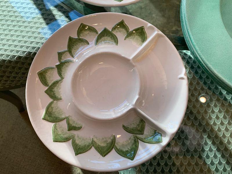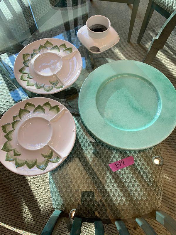 4 metal charger plates, 2 artichoke plates, and 1 frog
