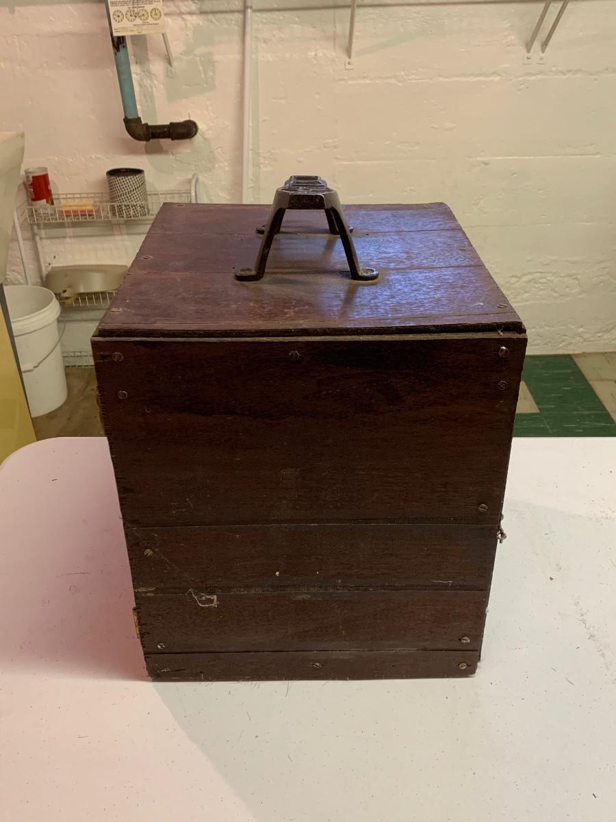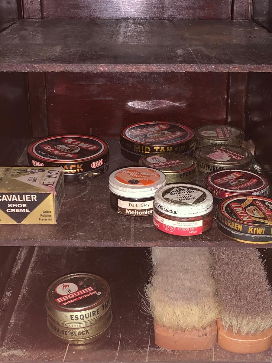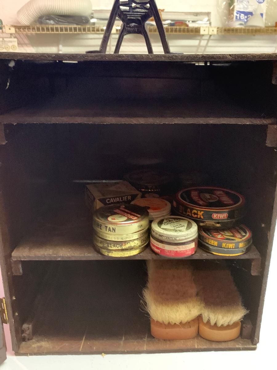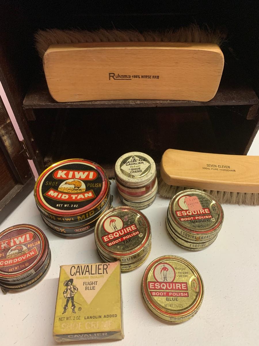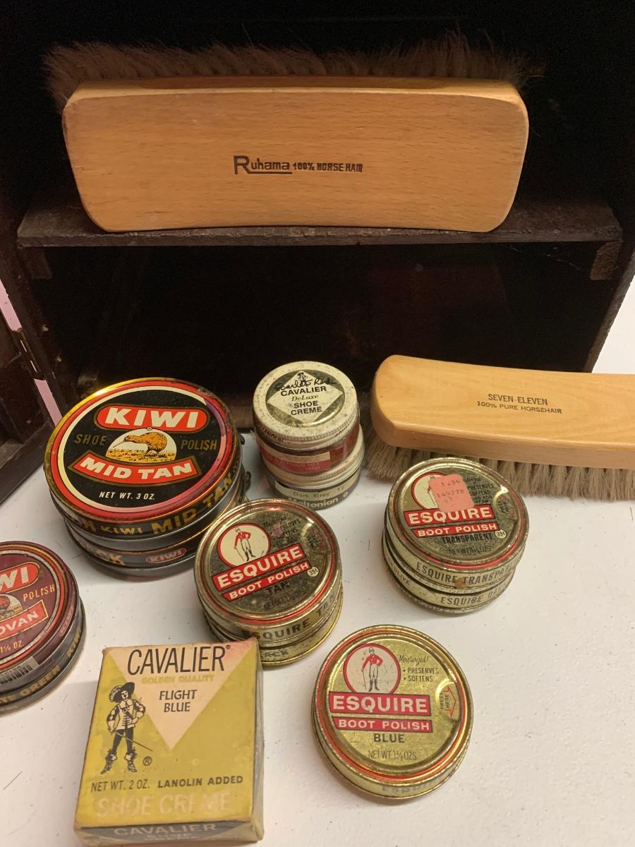 LOT 6R: Vintage Shoe Shine Box, Polishes & Brushes