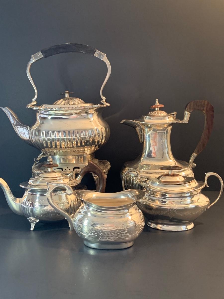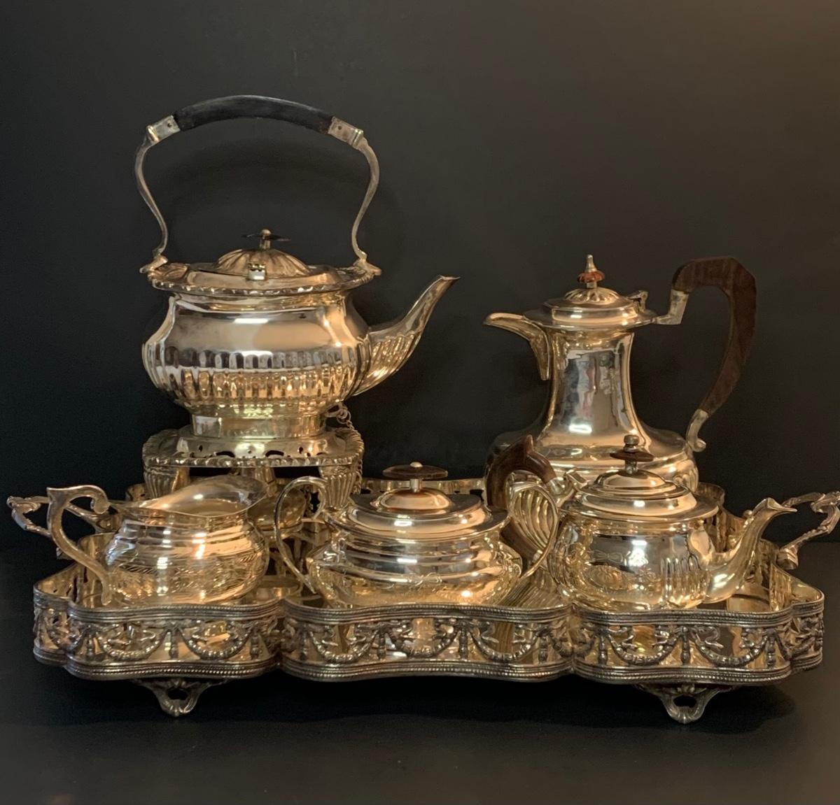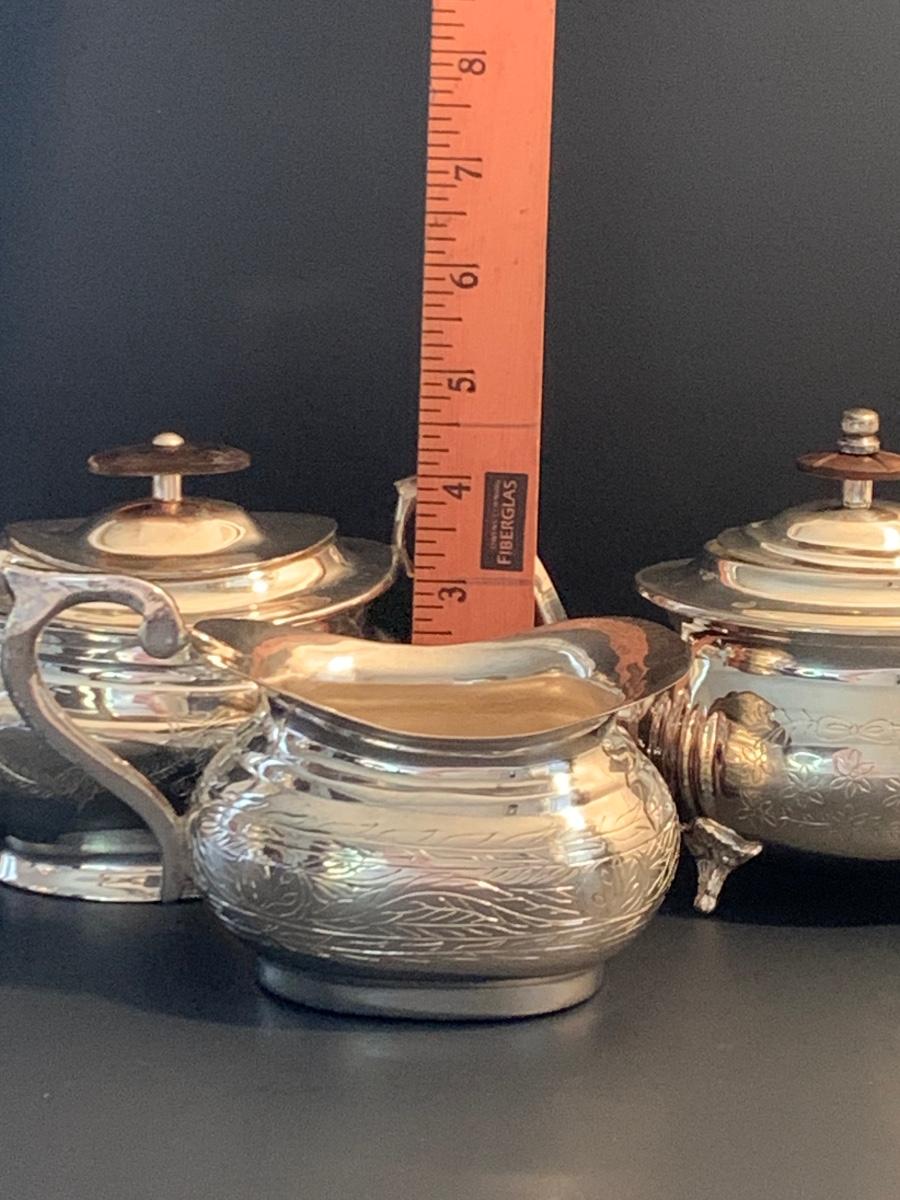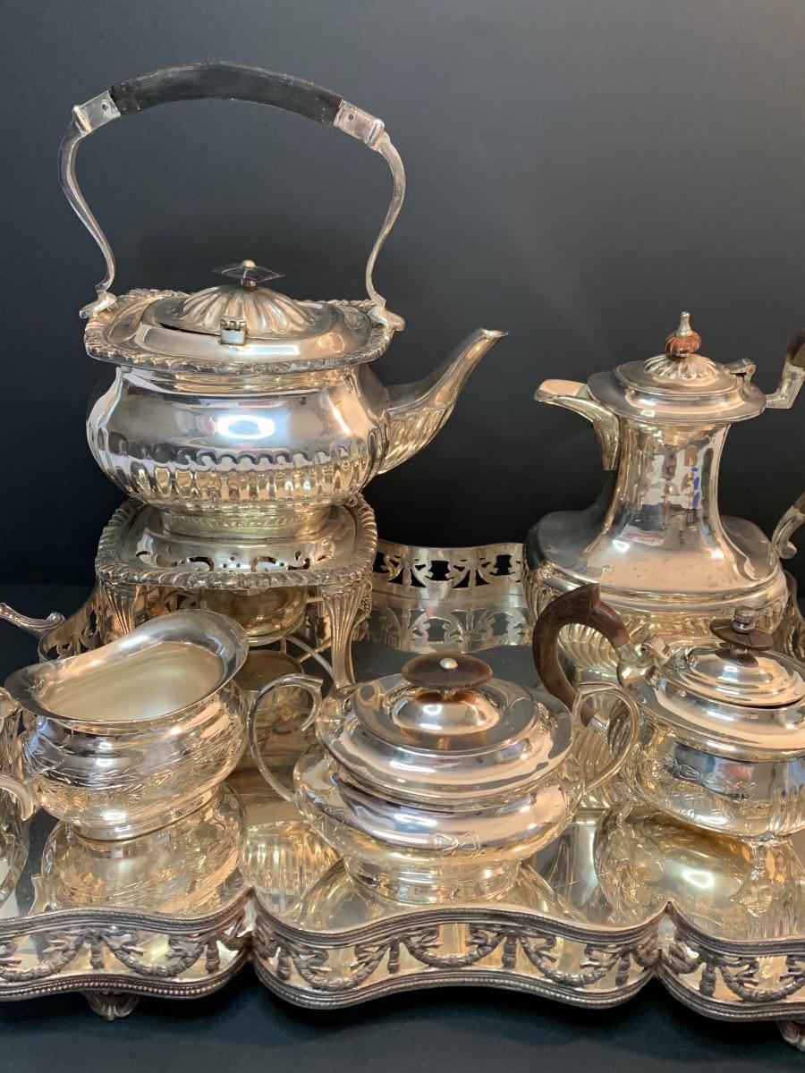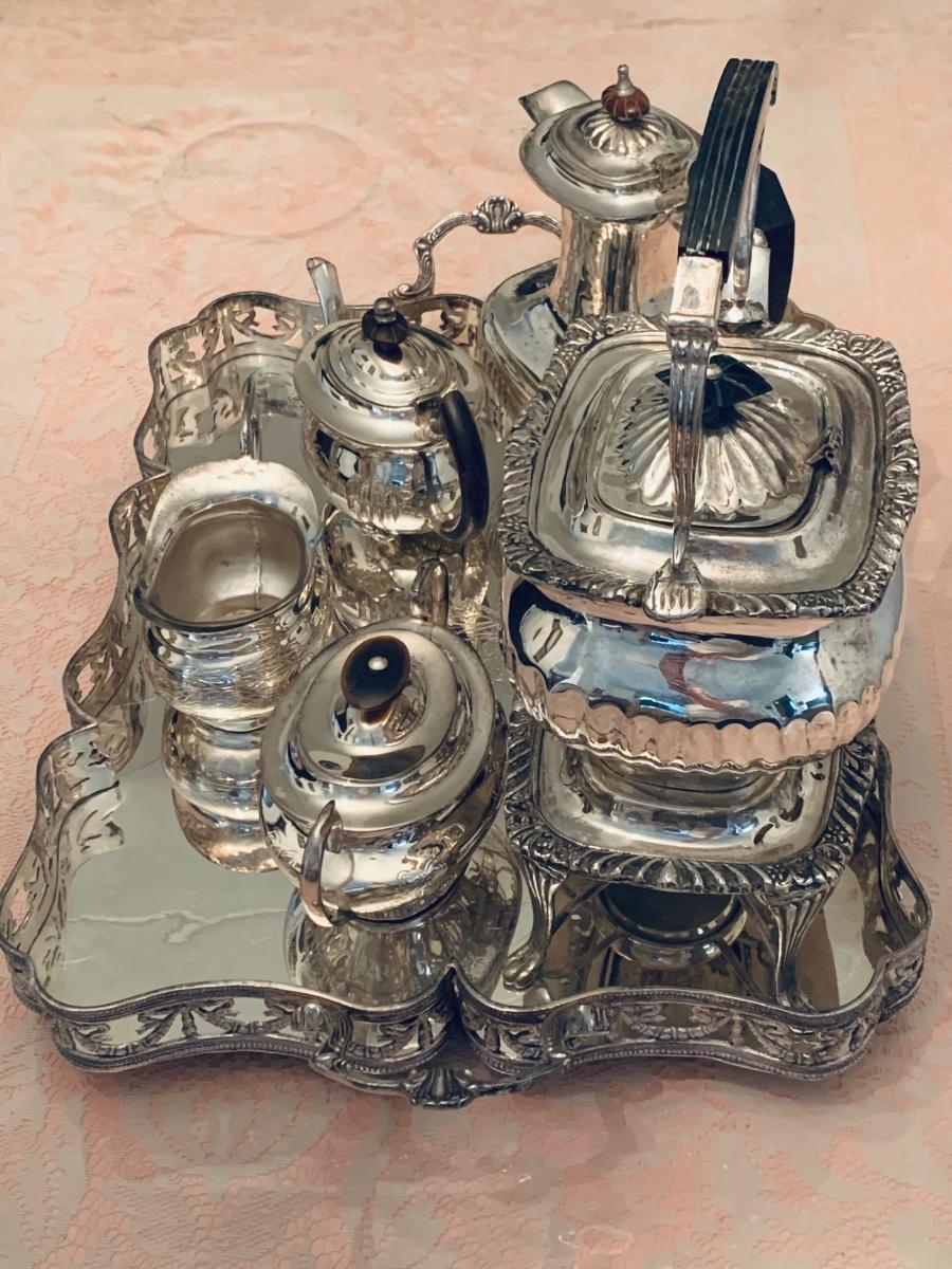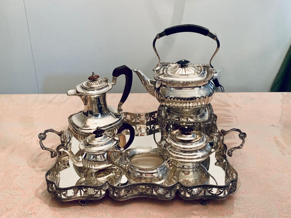 Absolutely stunning silver plate tray, teapot, coffee pot, sugar bowl and creamers. This is not a matching set.