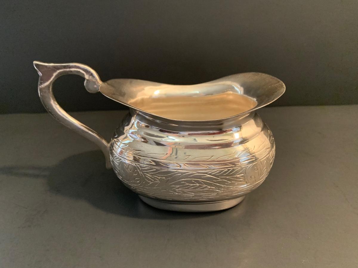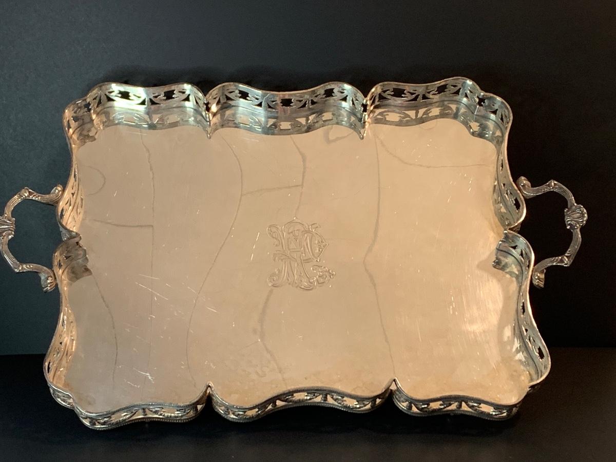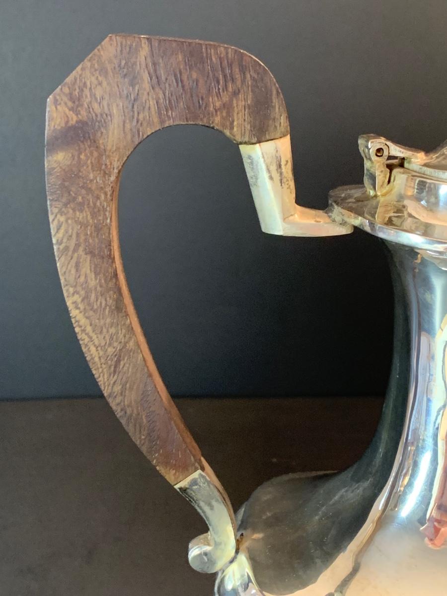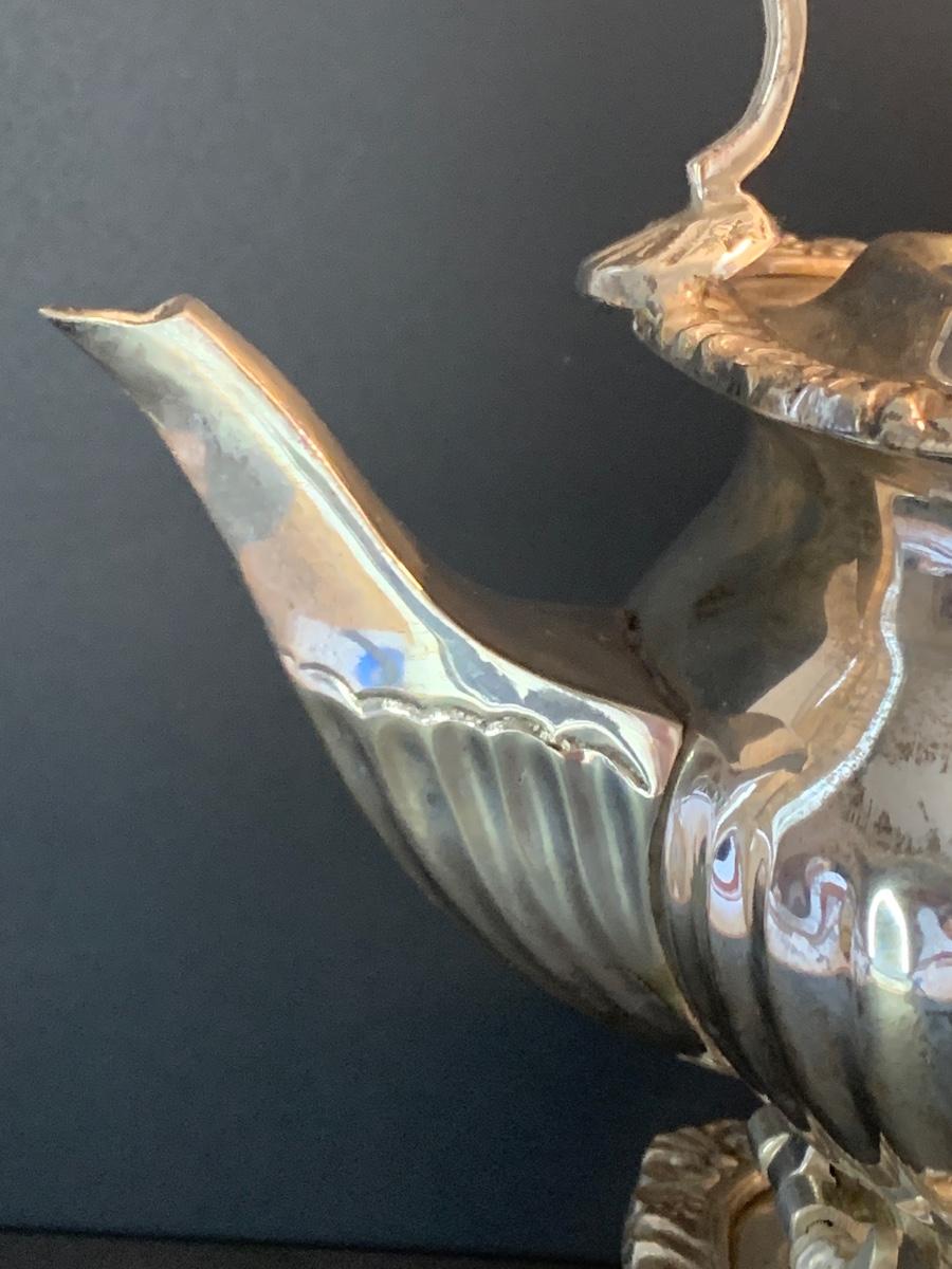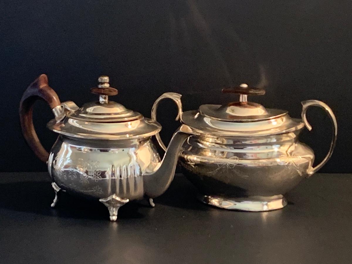 Absolutely stunning silver plate tray, teapot, coffee pot, sugar bowl and creamers. This is not a matching set.