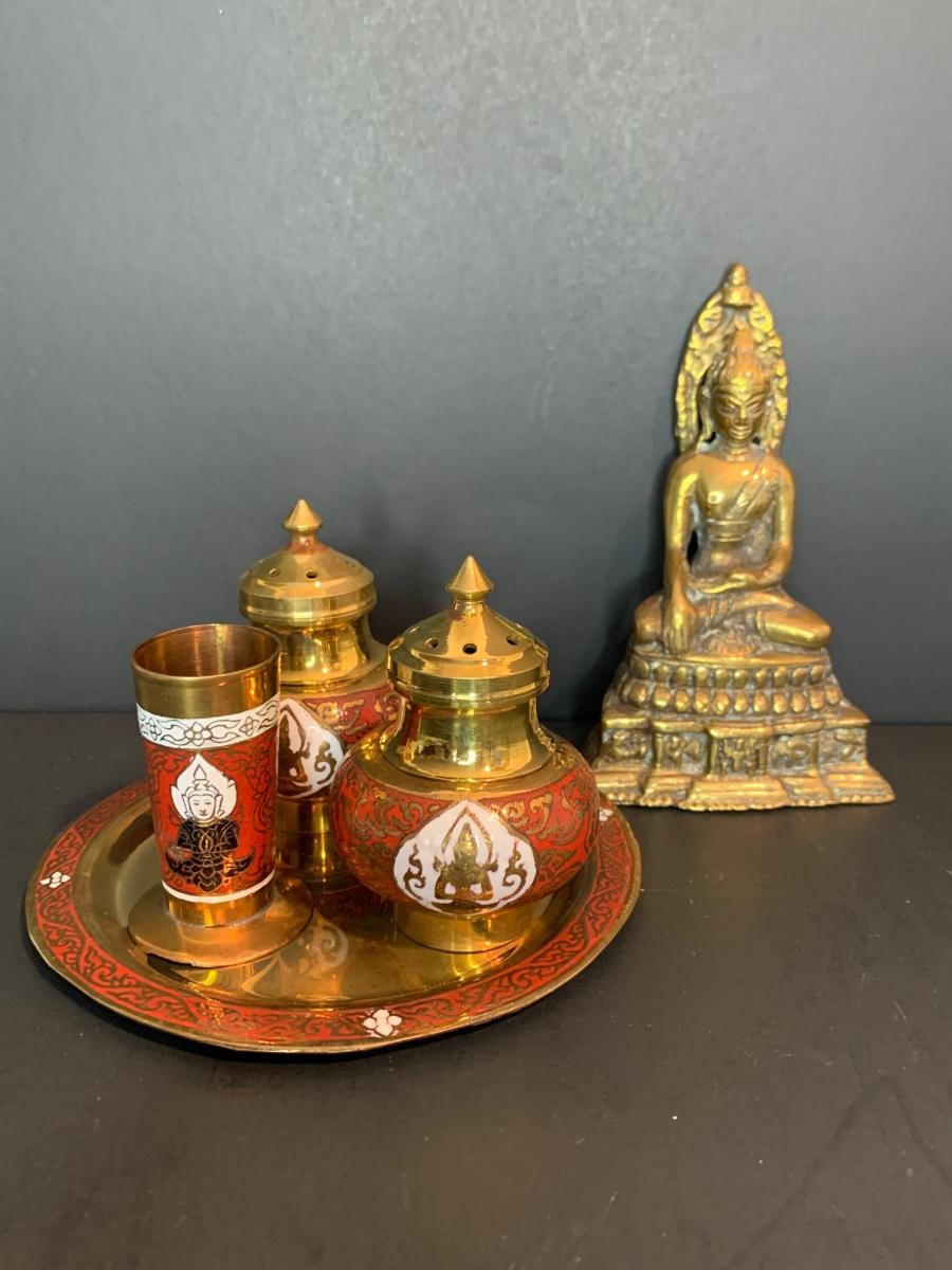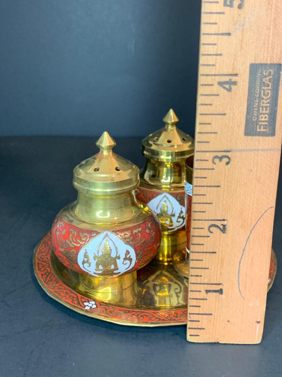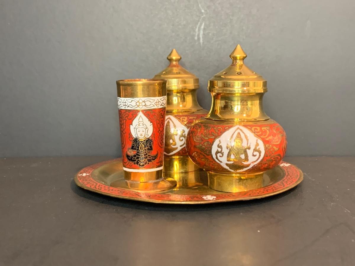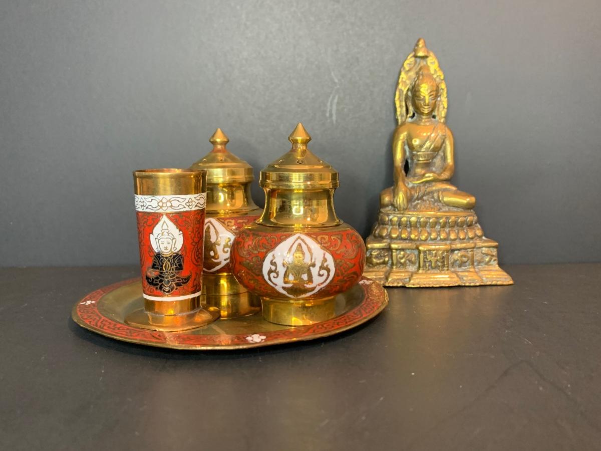 LOT 26R: Brass Buddha Statue & Vintage Enameled Brass Tray, Salt & Pepper Shakers, Toothpick Holder Set