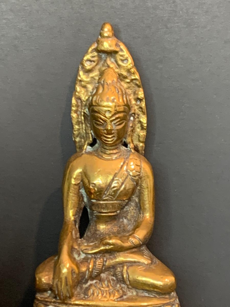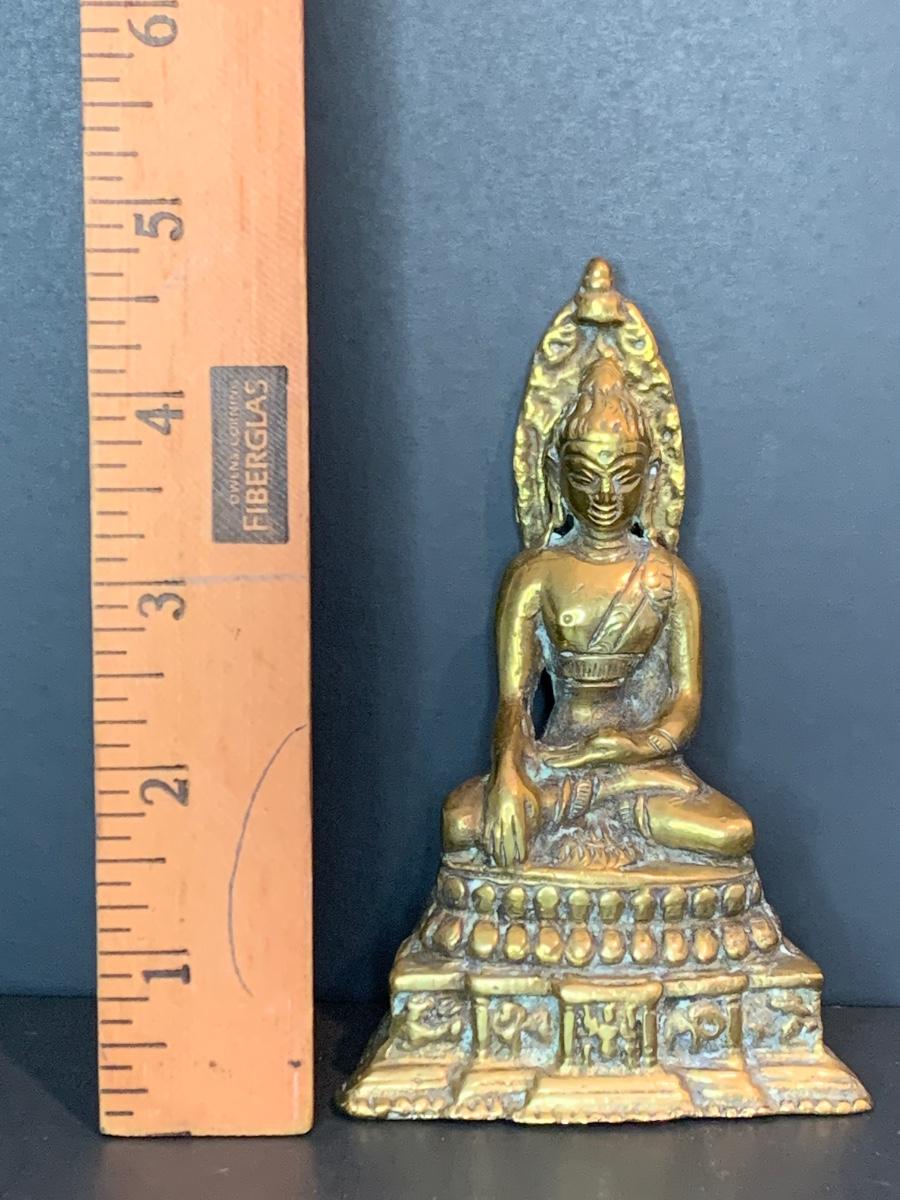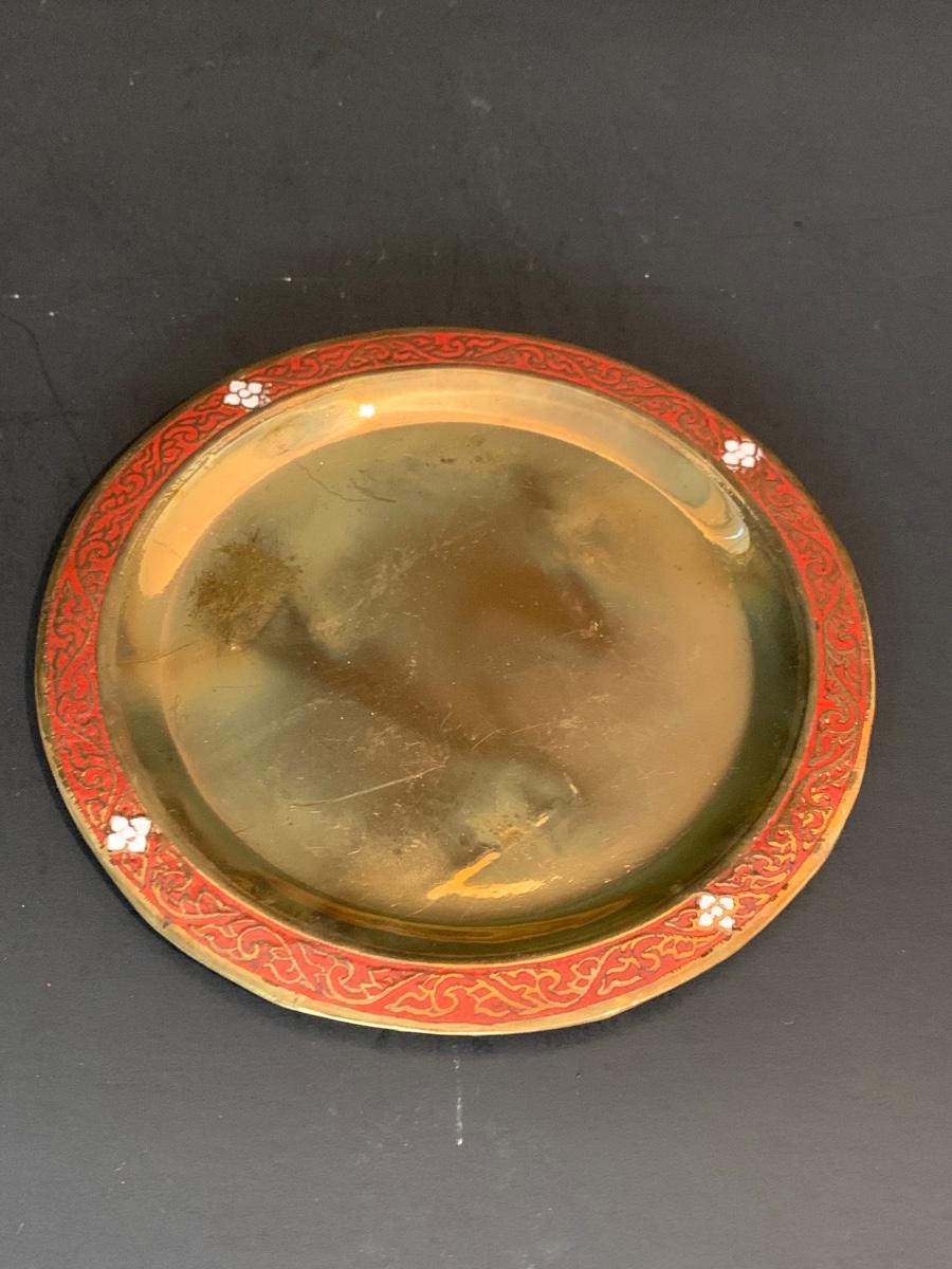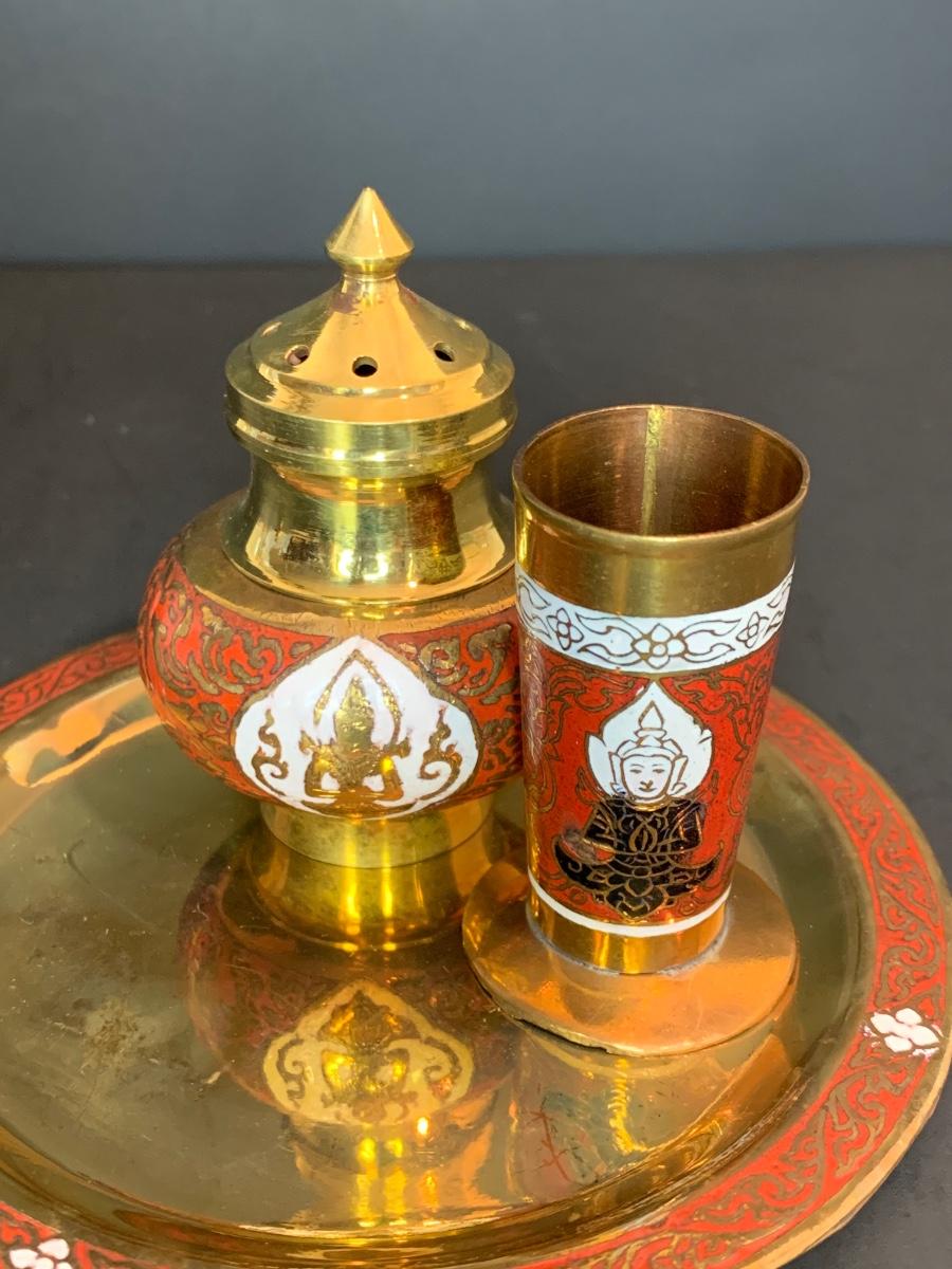 LOT 26R: Brass Buddha Statue & Vintage Enameled Brass Tray, Salt & Pepper Shakers, Toothpick Holder Set