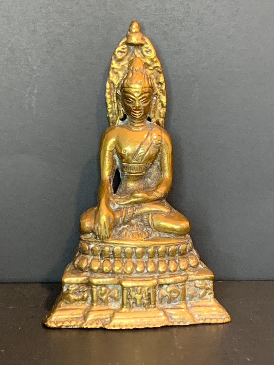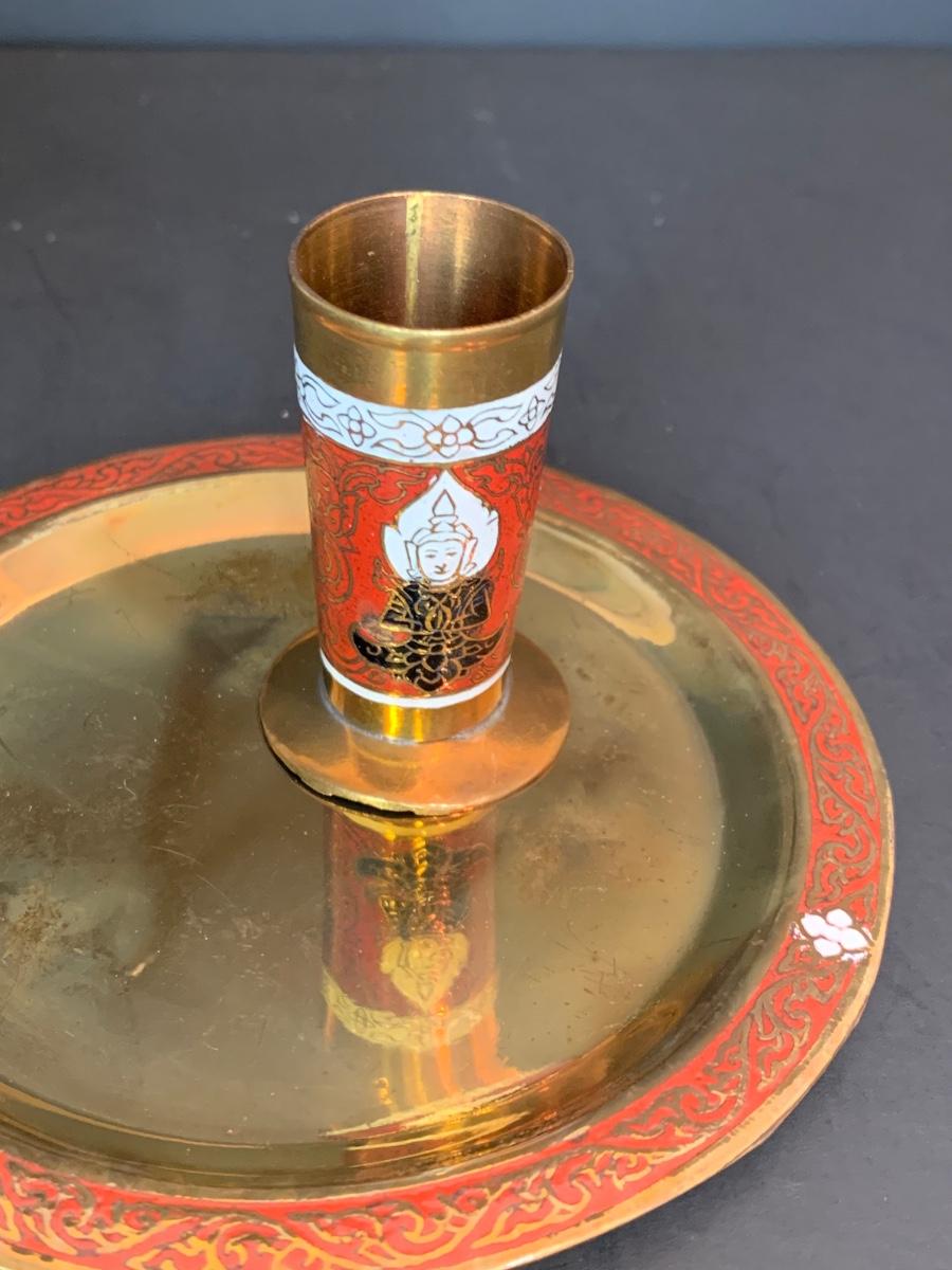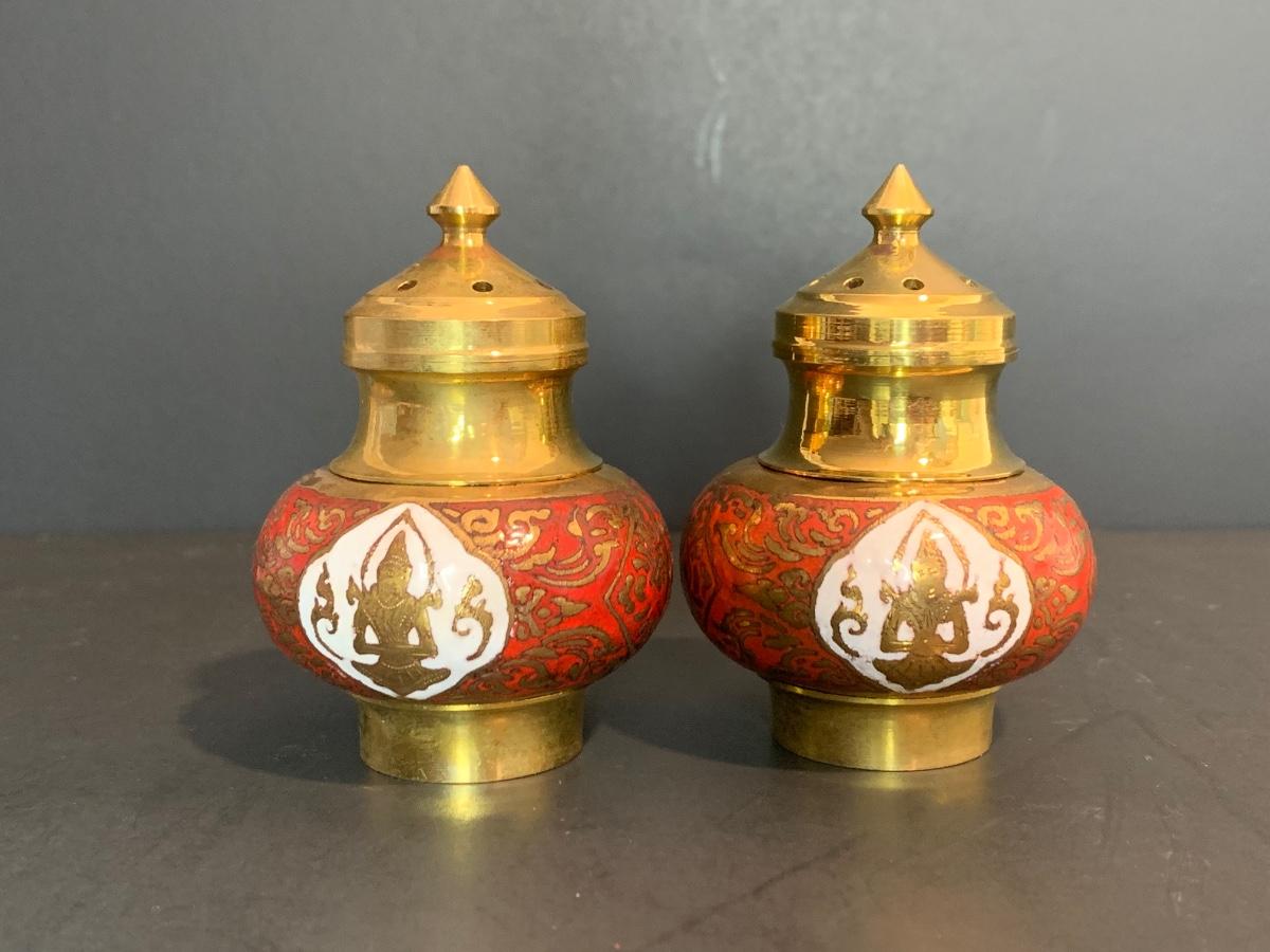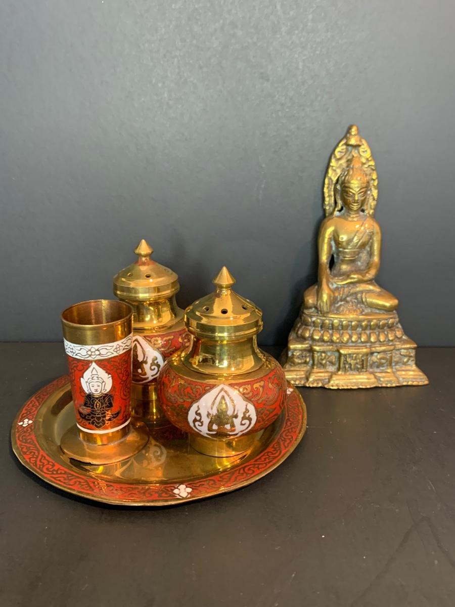 LOT 26R:  Brass Buddha Statue & Vintage Enameled Brass Tray, Salt & Pepper Shakers, Toothpick Holder Set