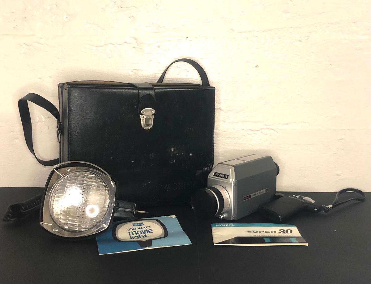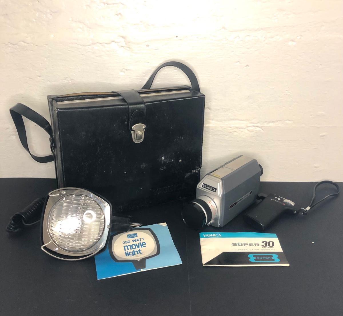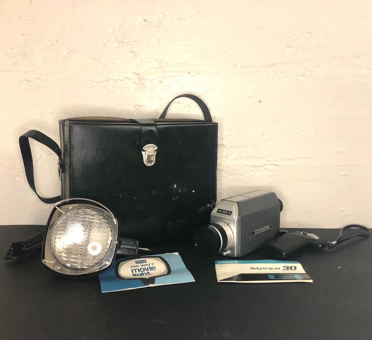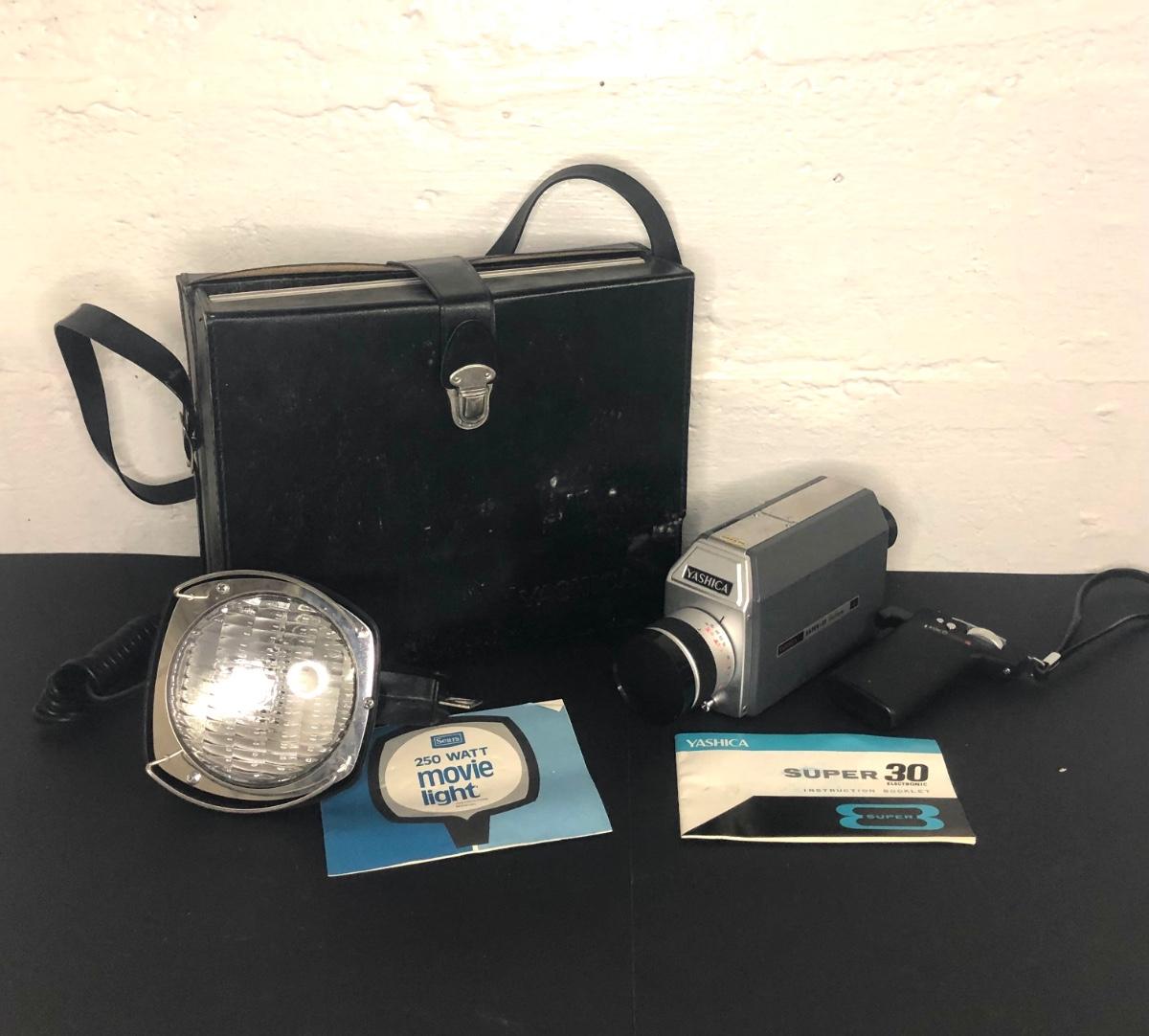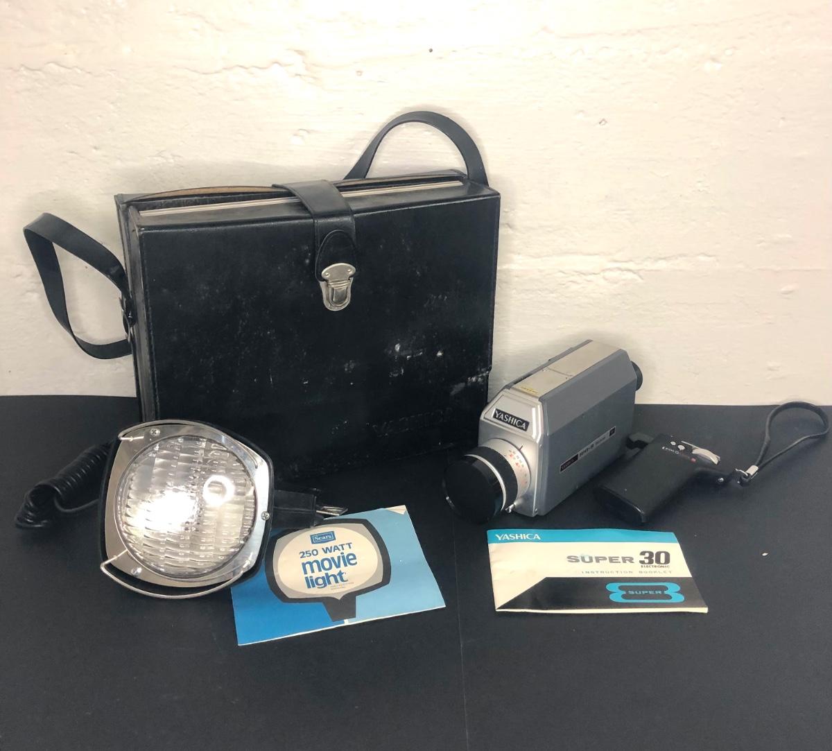 Yashica Super 30 video camera withh an attatchable handle and a black rectangular bag with Yashica embossed in the corner. Also includes a vintage Sears 270 watt movie light that plugs into an outlet. Both come with instruction manuals. Good condition, untested.