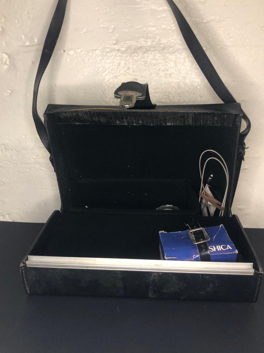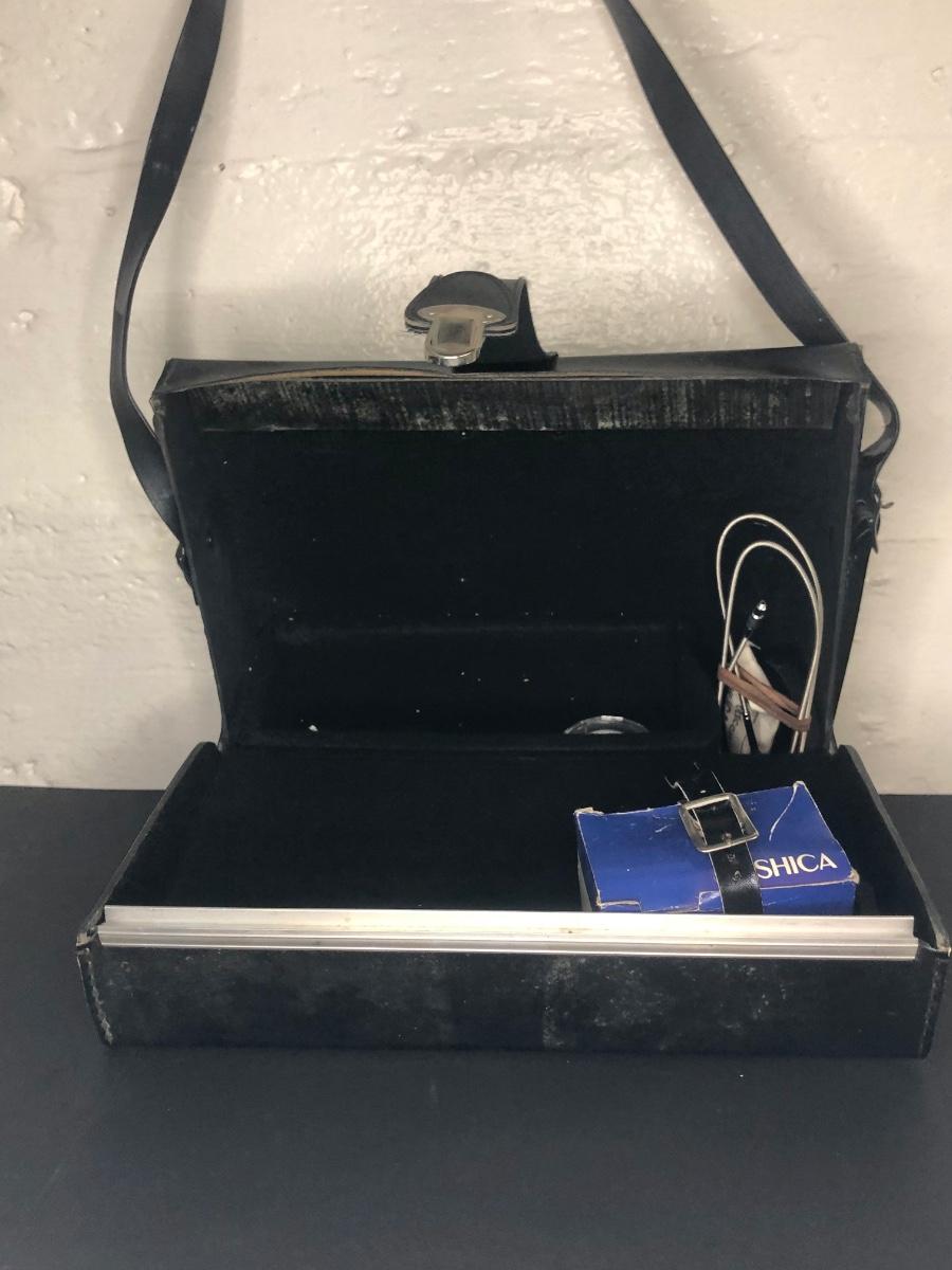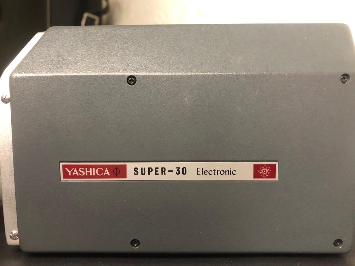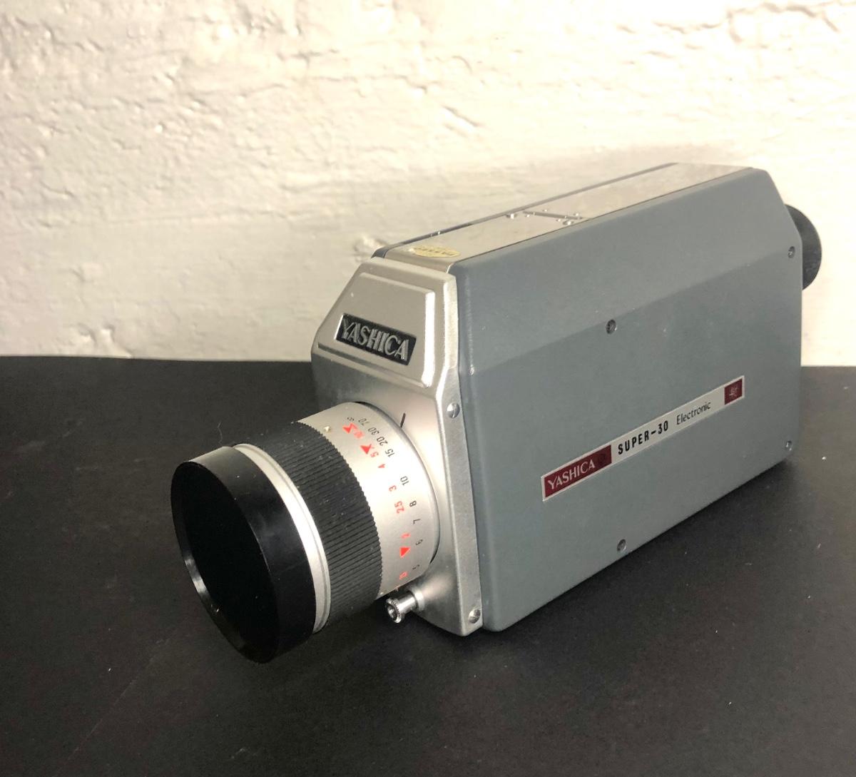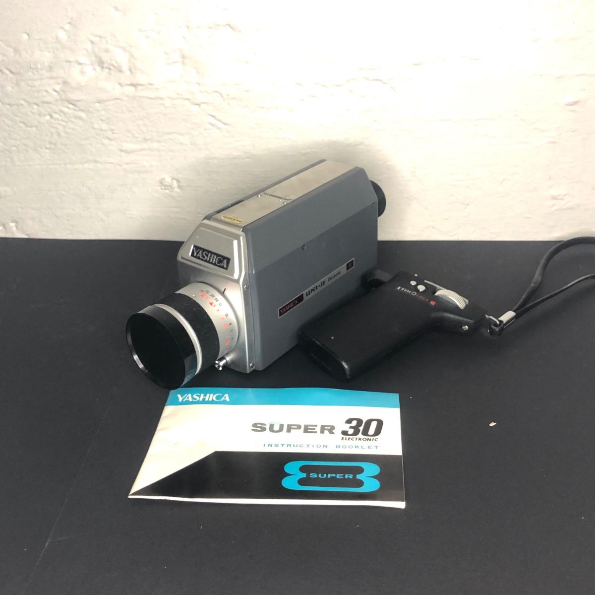 Yashica Super 30 video camera withh an attatchable handle and a black rectangular bag with Yashica embossed in the corner. Also includes a vintage Sears 270 watt movie light that plugs into an outlet. Both come with instruction manuals. Good condition, untested.