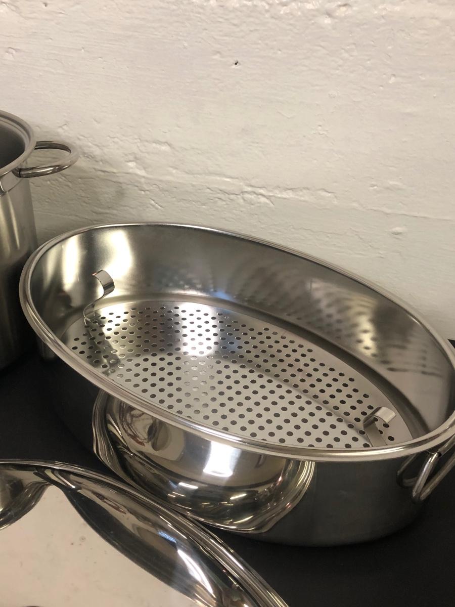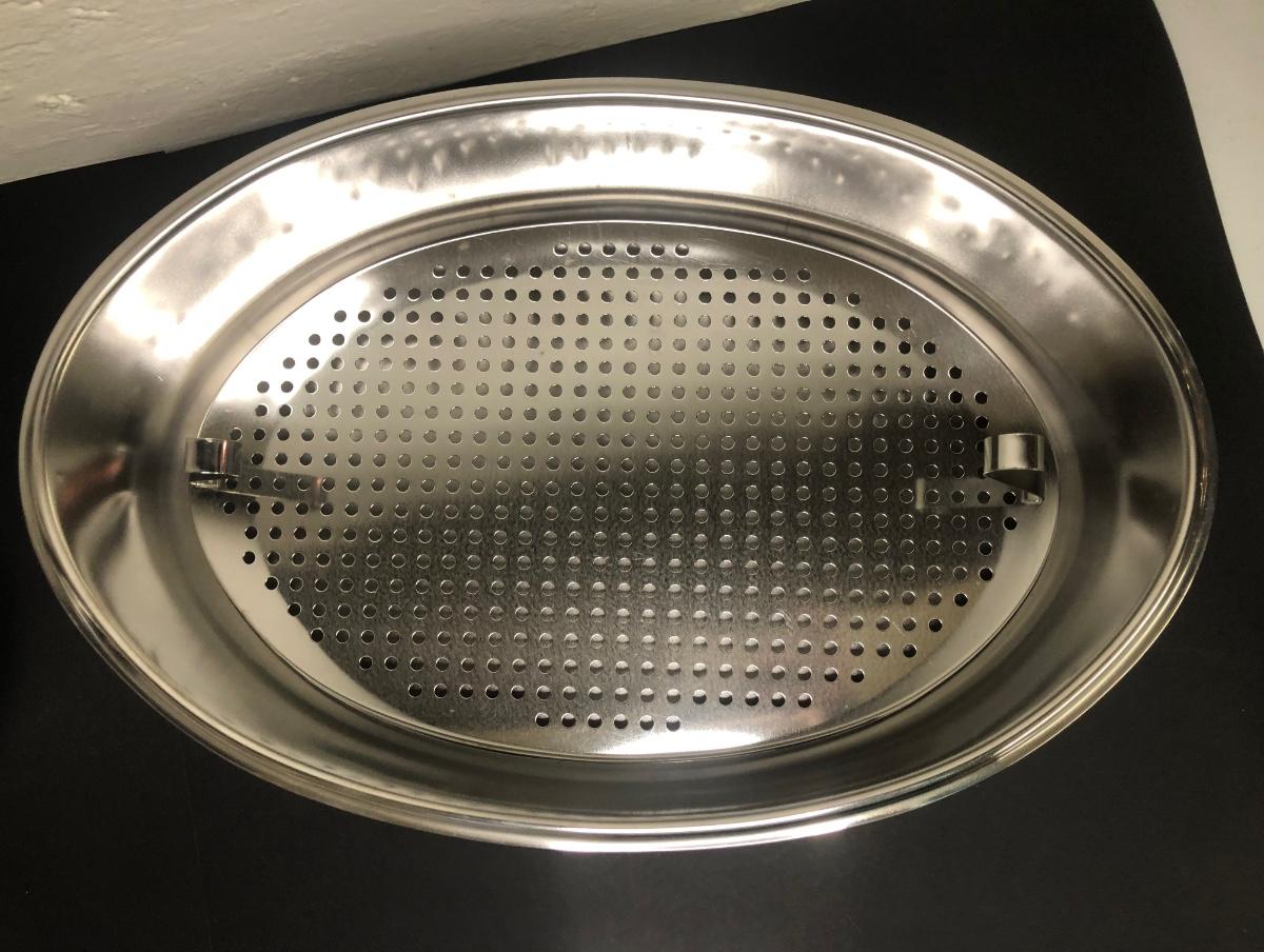 Vintage ICM Inox pot and multiuse oval pan with draining rack, both with lids. Made in Italy.
