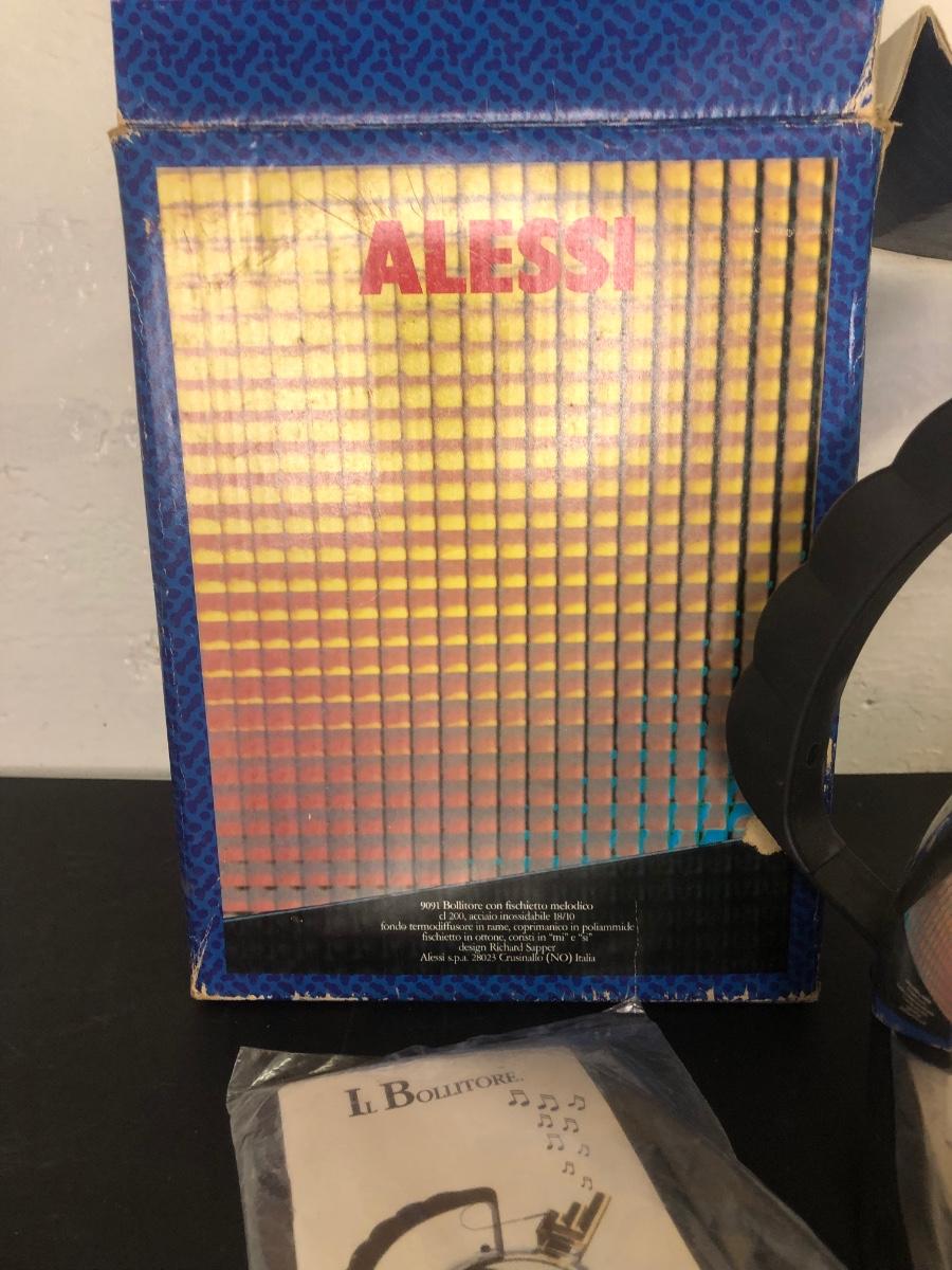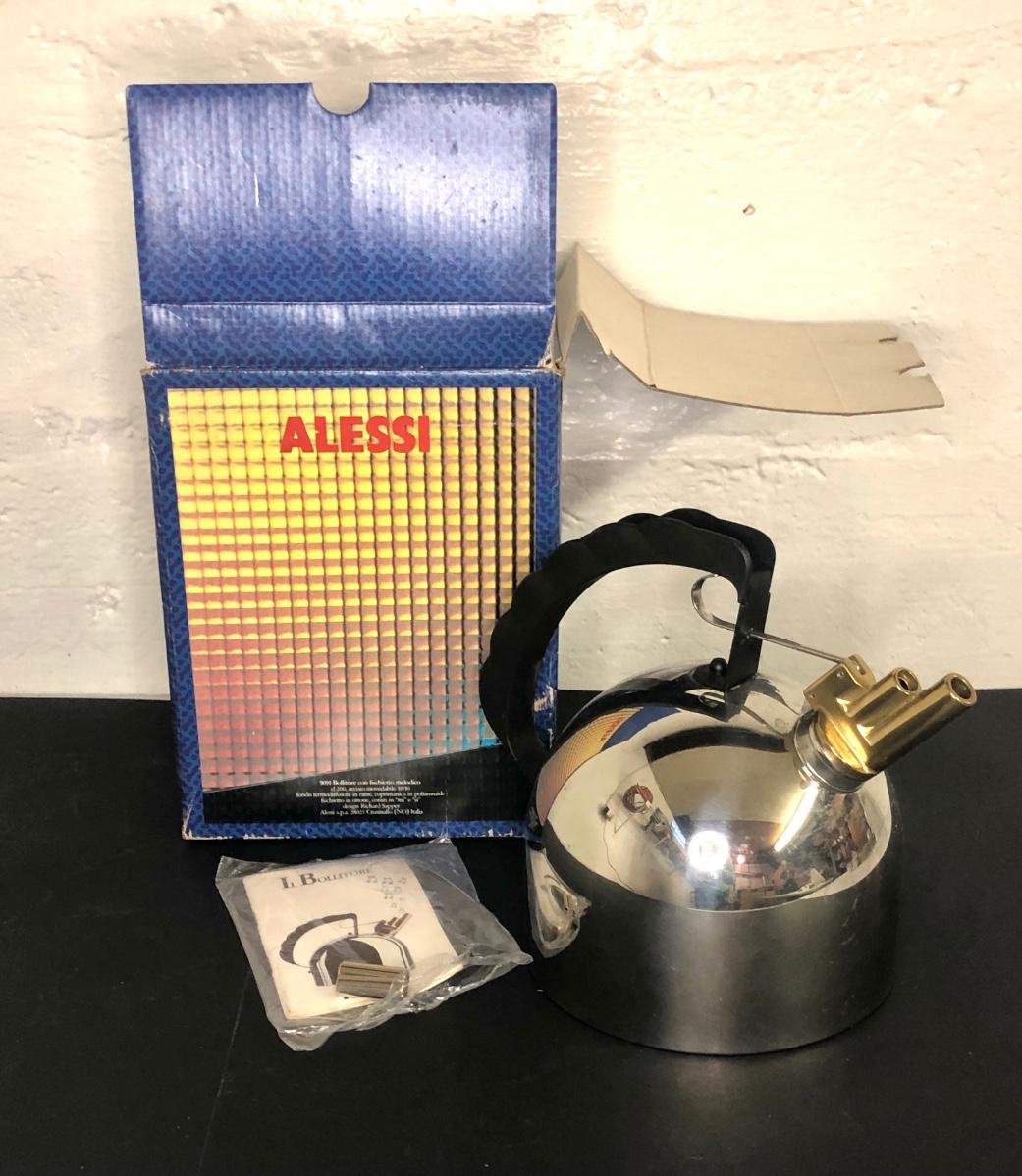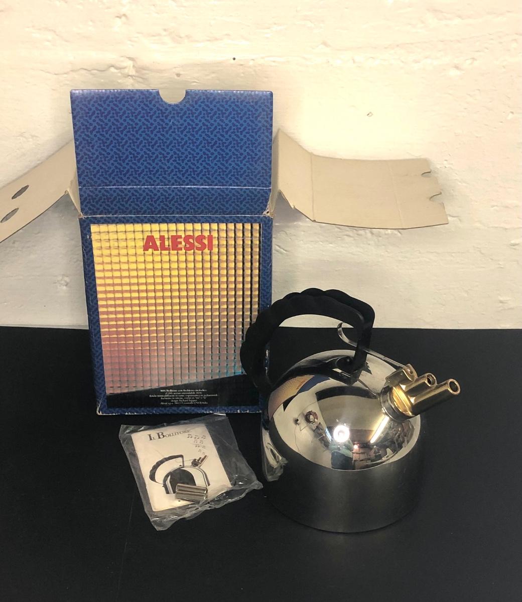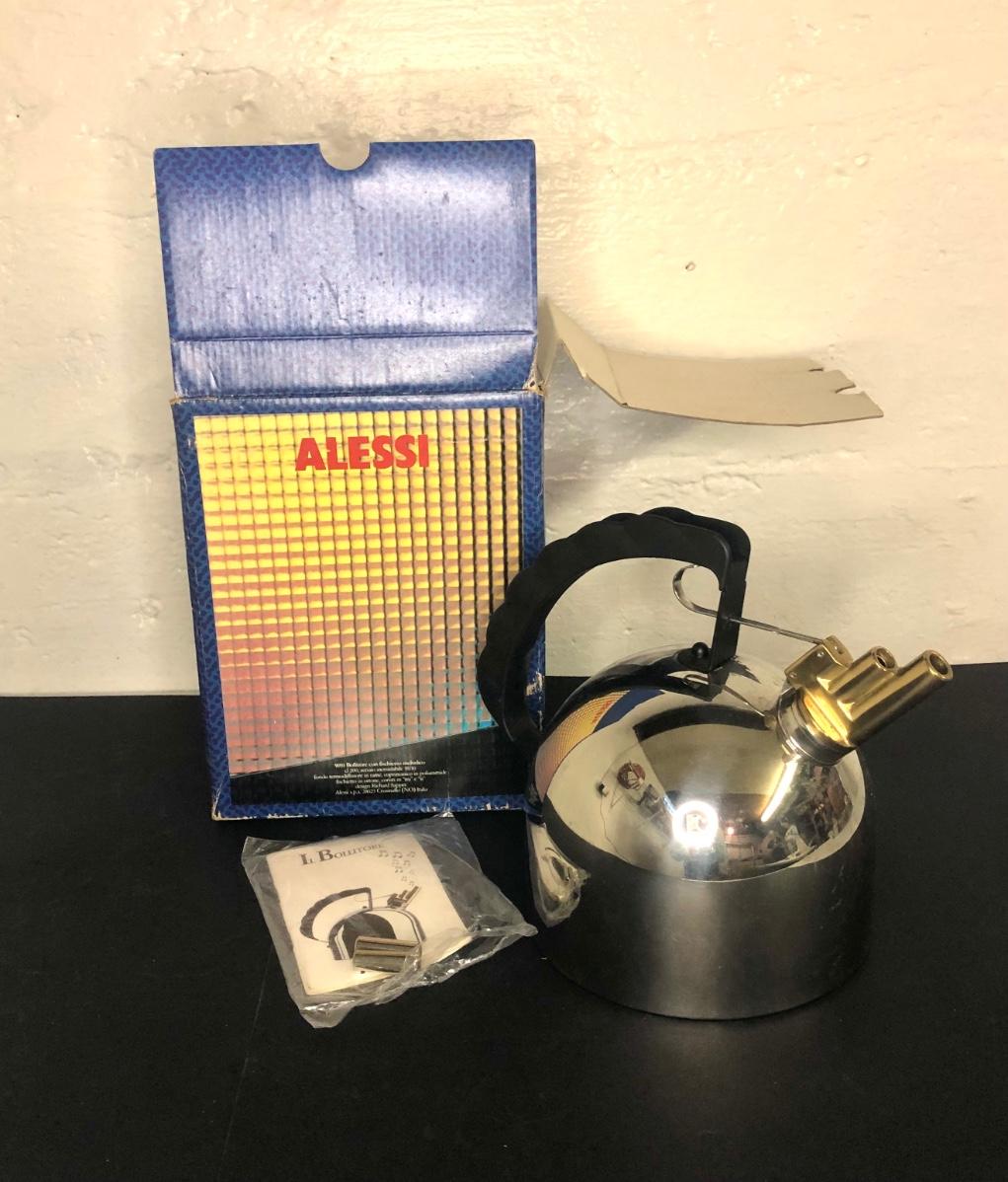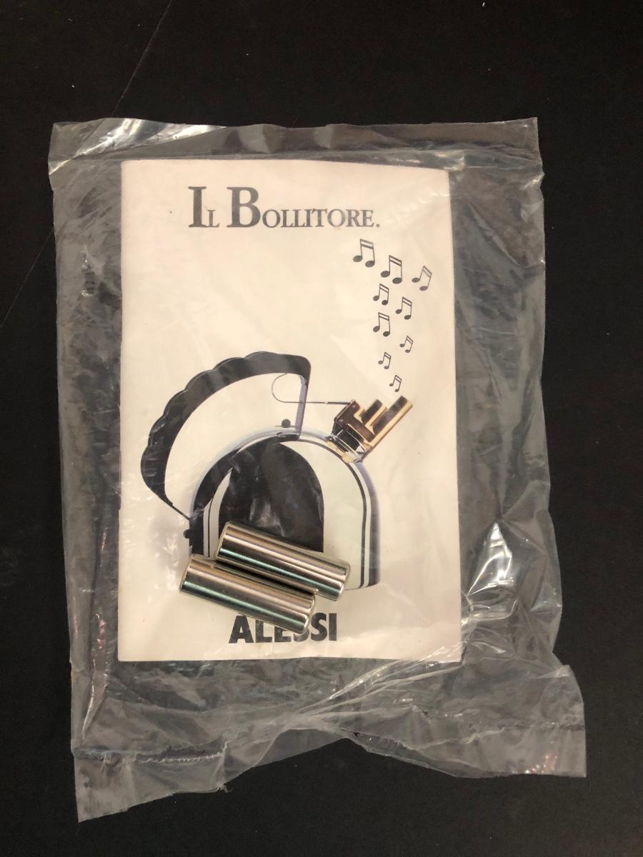 Alessi whistling tea kettle is silver with brass melodic whistles and a black plastic handle. Includes original box and alternate whistles.