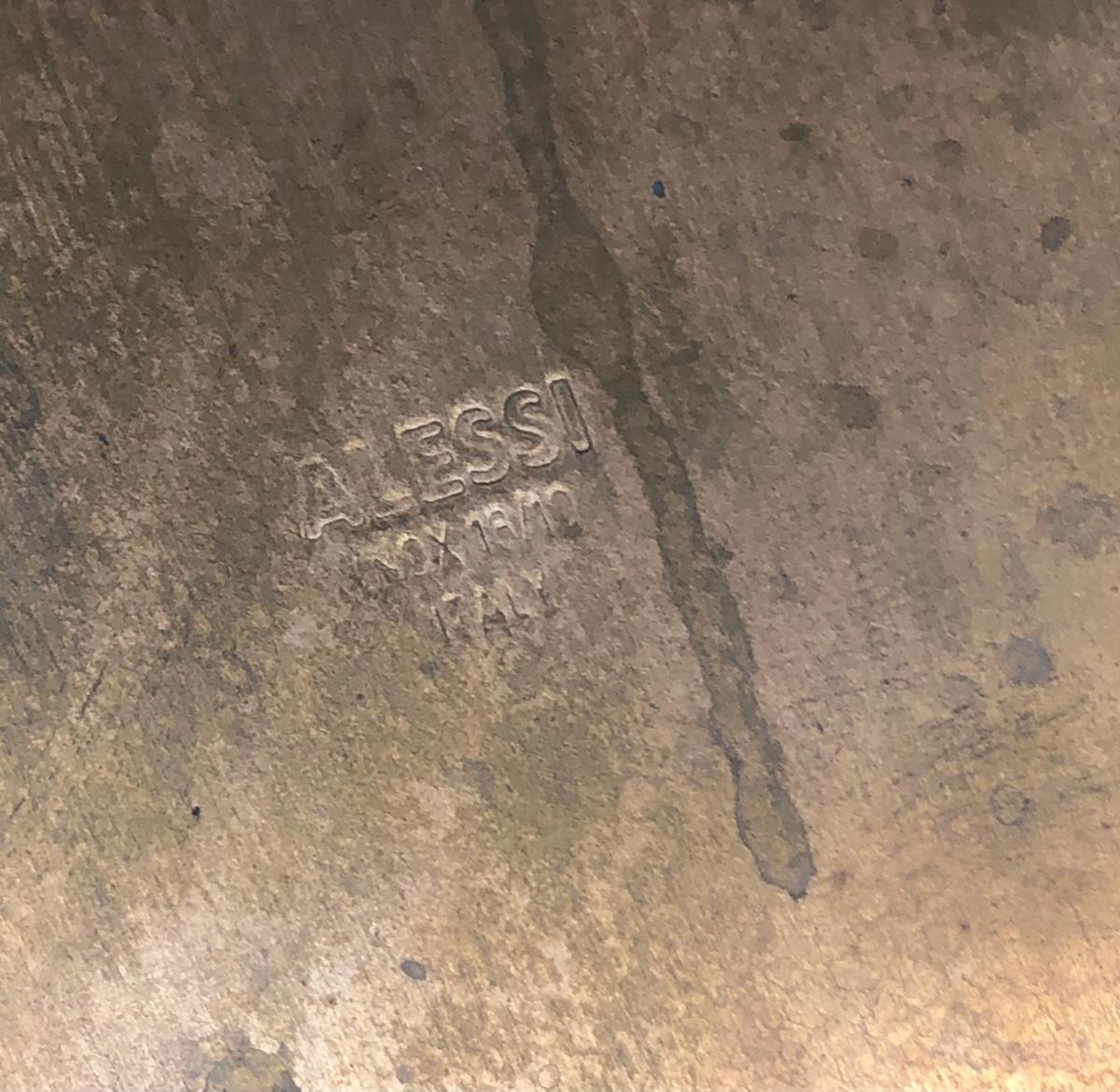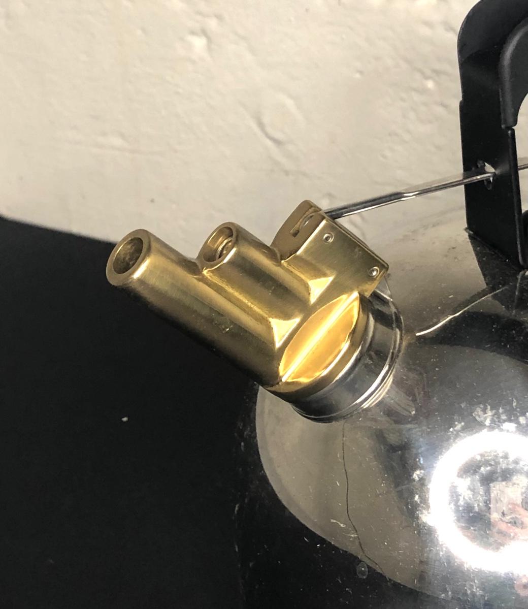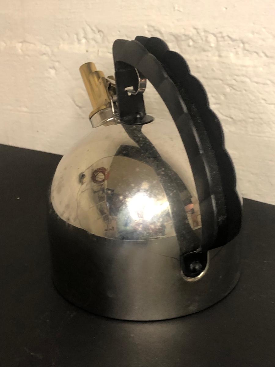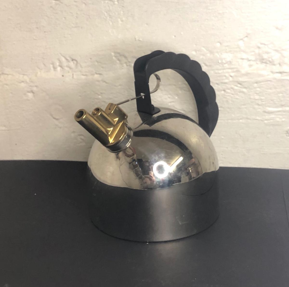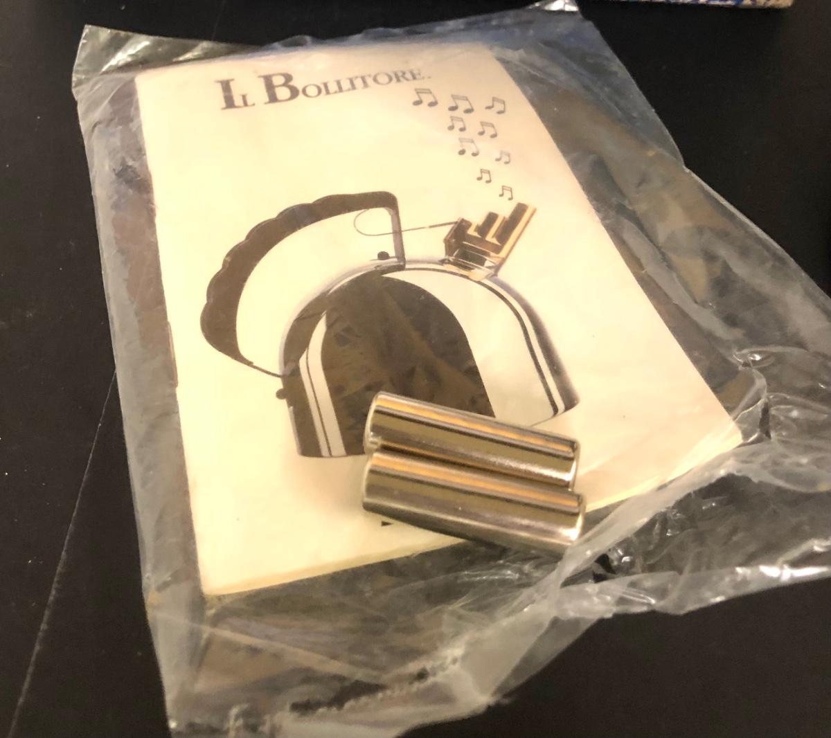 Alessi whistling tea kettle is silver with brass melodic whistles and a black plastic handle. Includes original box and alternate whistles.