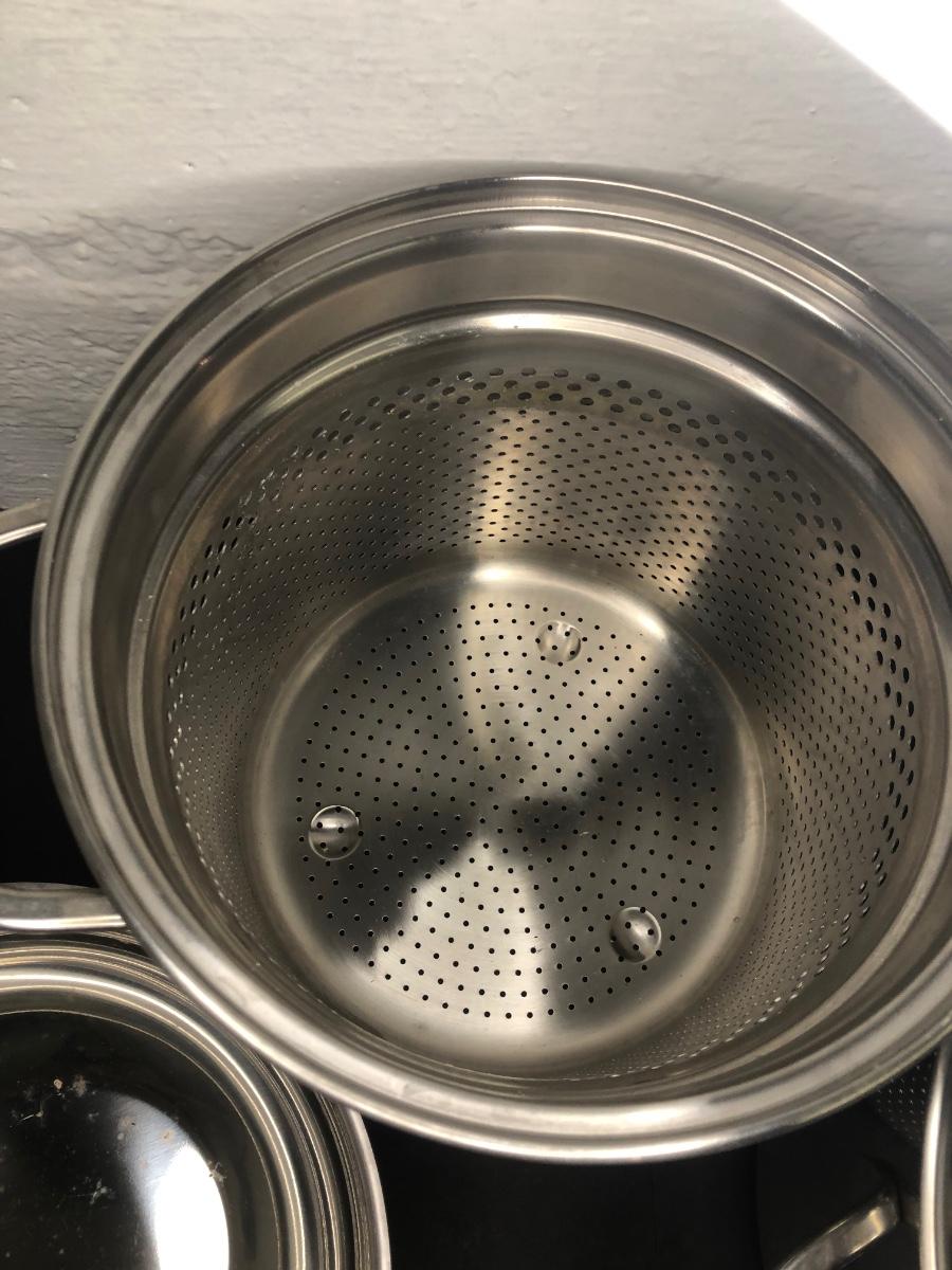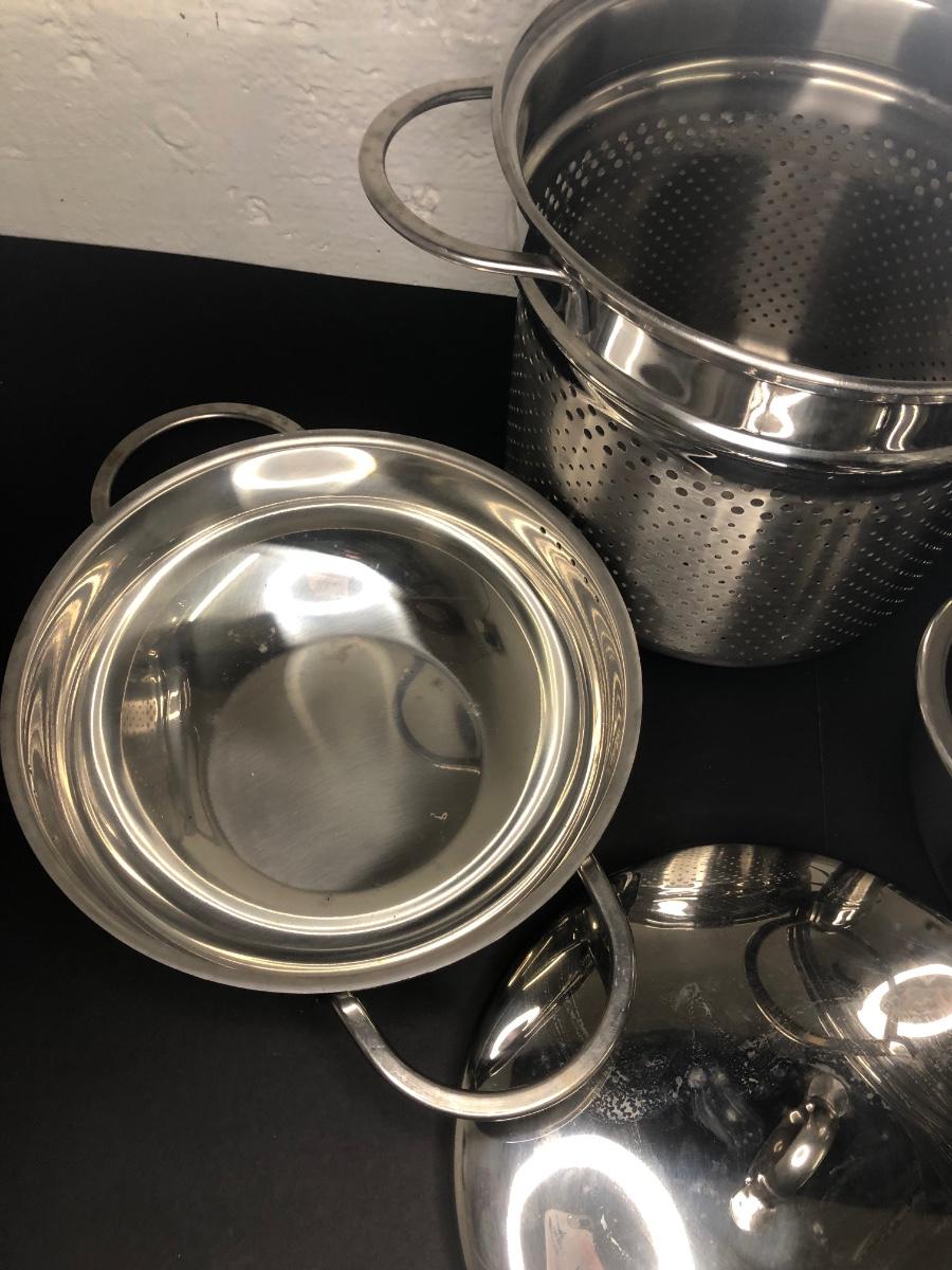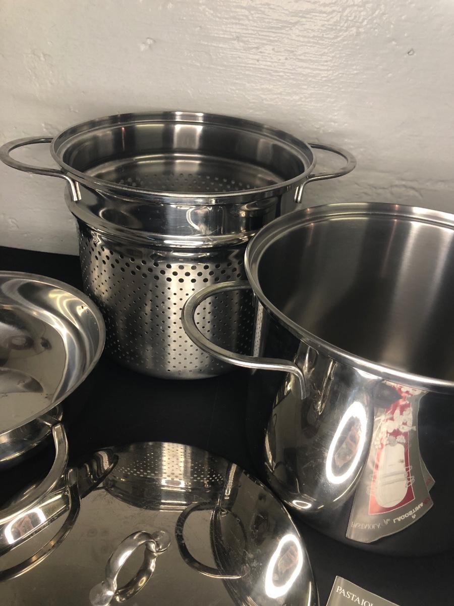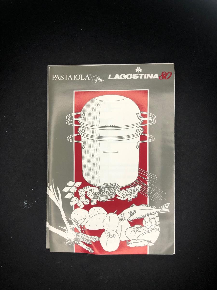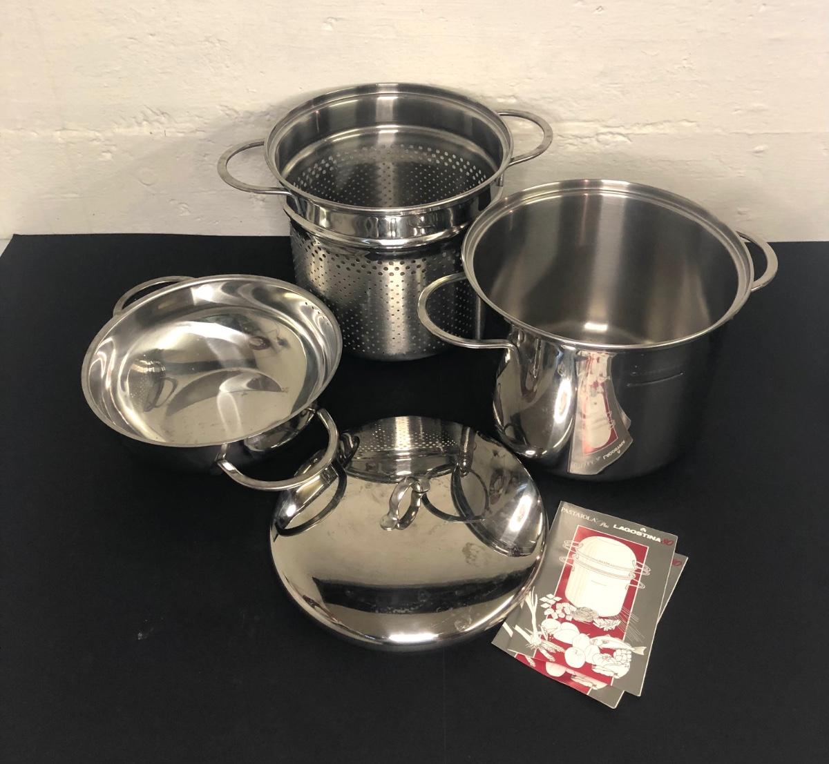 Pastaiola Plus pots have three pot sections and a lid. Made in Italy by Lagostina and includes two small booklets.