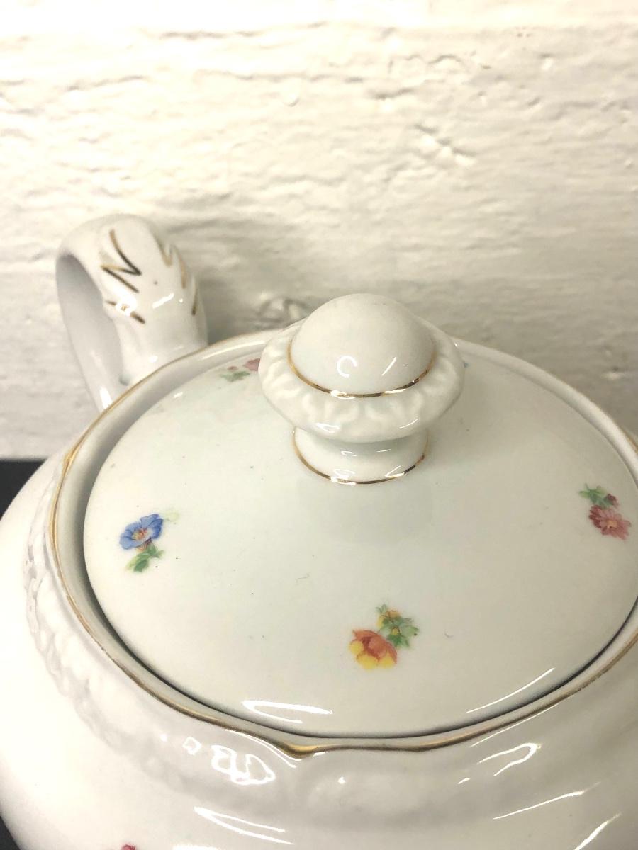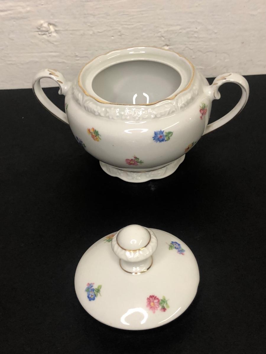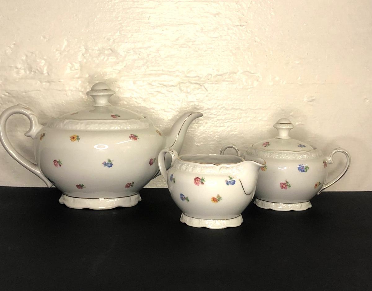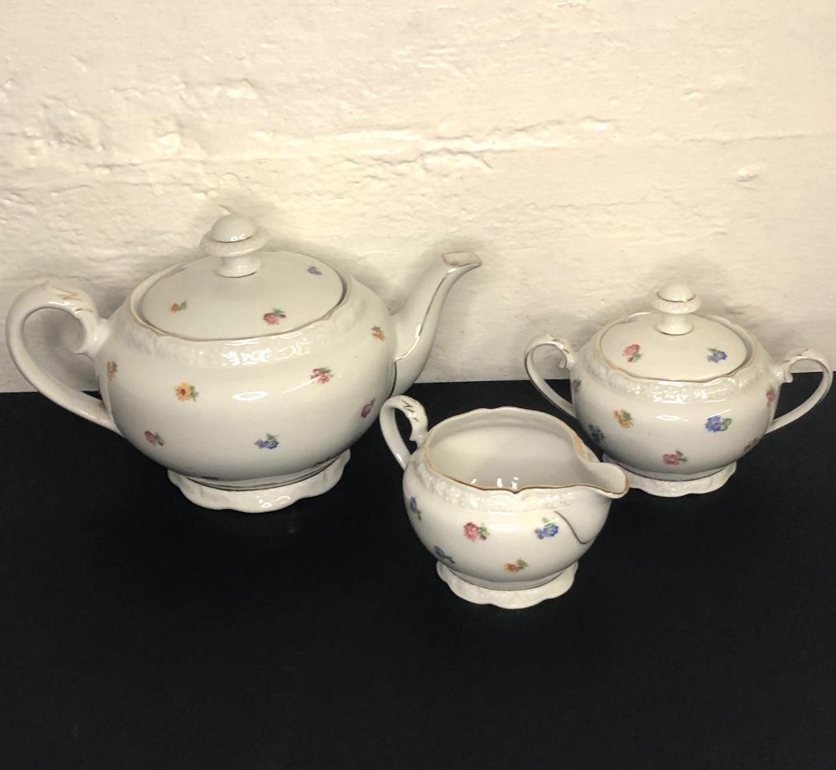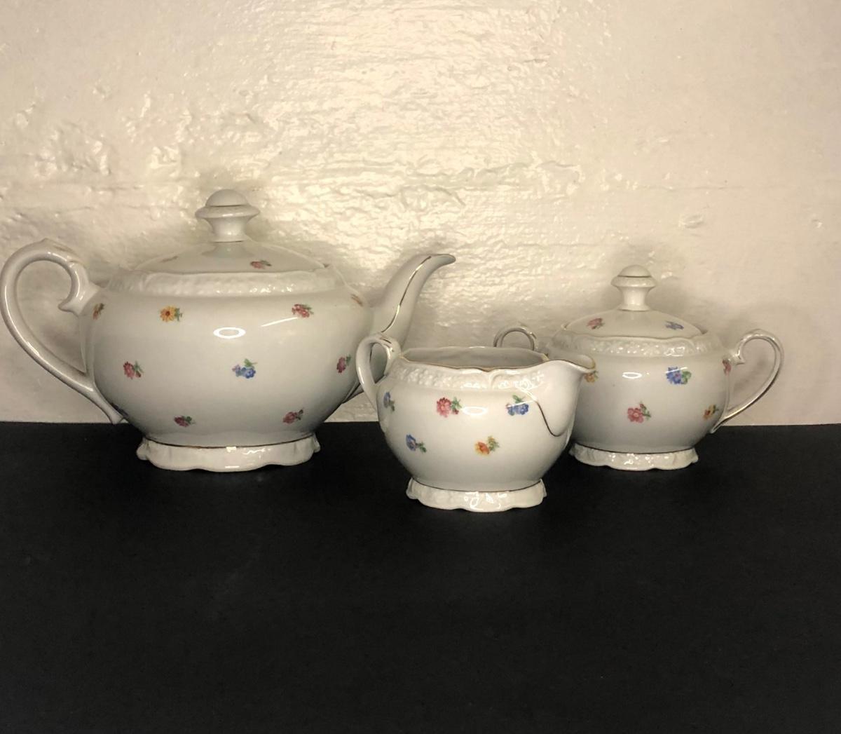 This is white Winterling Tea Set with petite flowers and golden accents. Includes a tea pot and dishes for cream and sugar. Made in Bavaria, Germany.