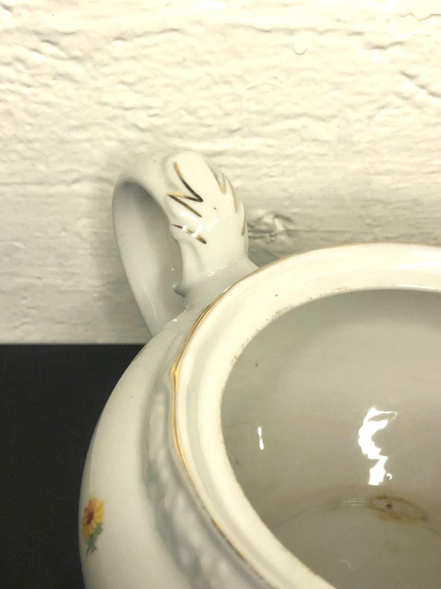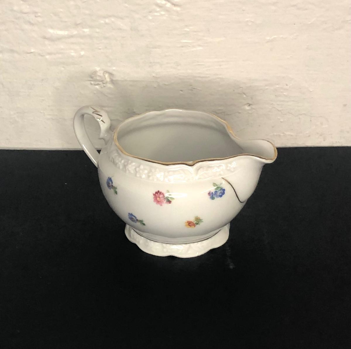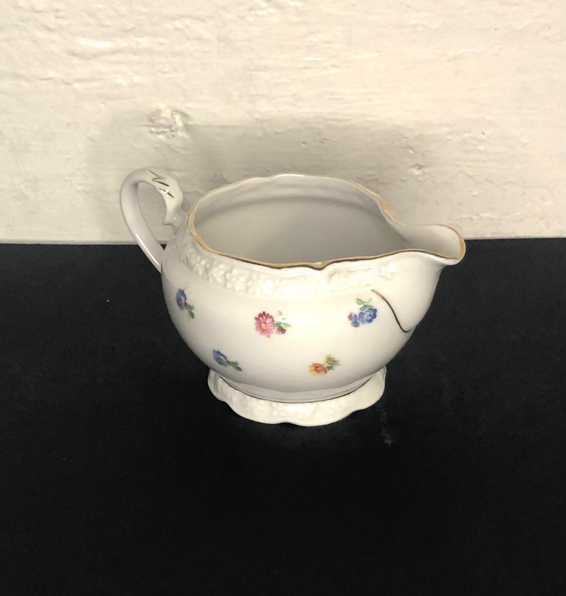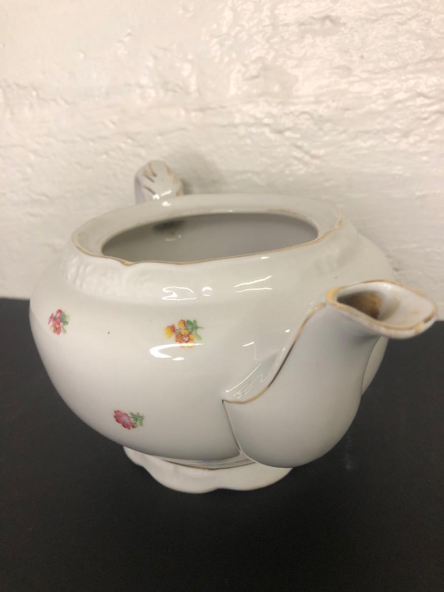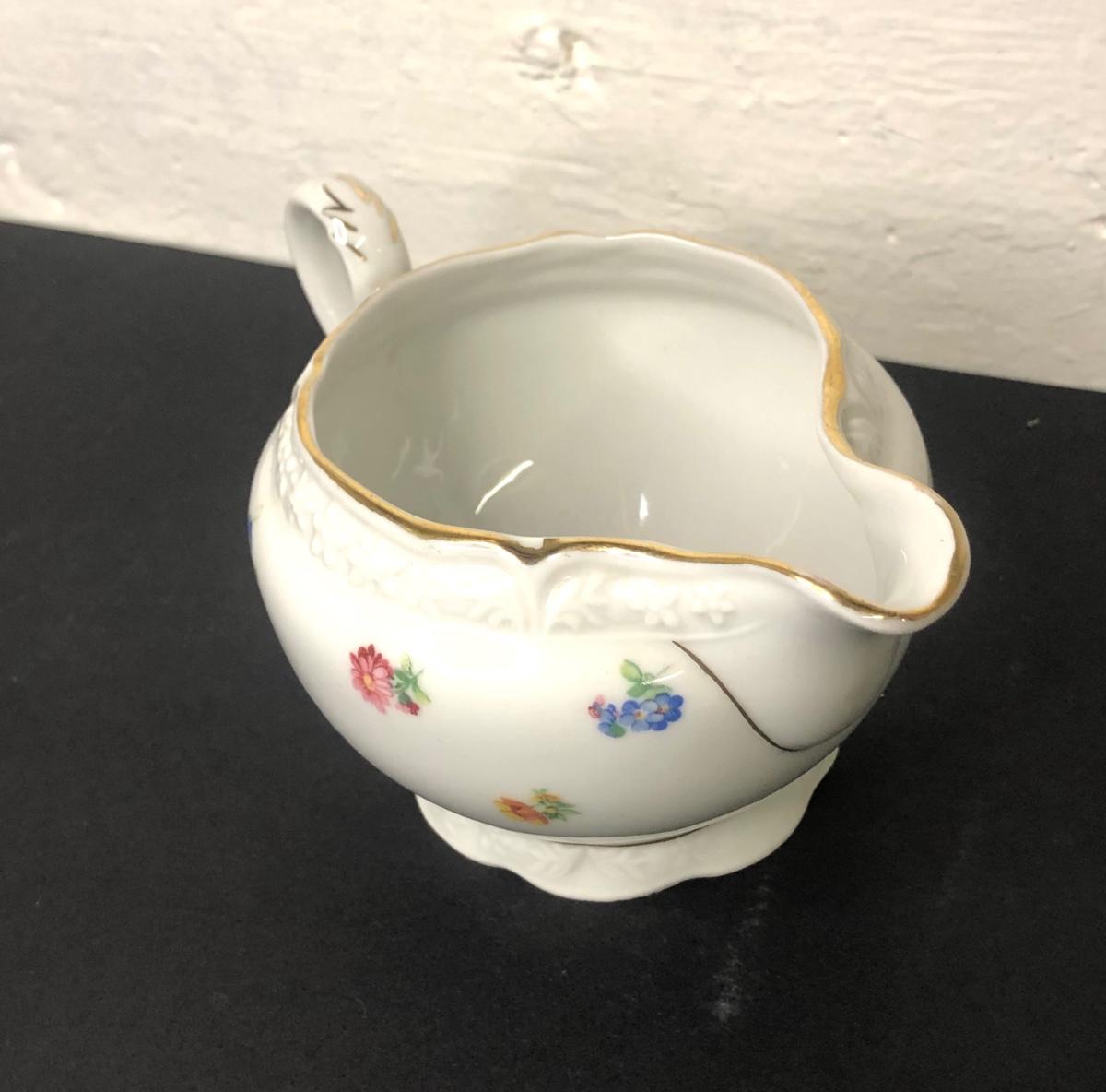 This is white Winterling Tea Set with petite flowers and golden accents. Includes a tea pot and dishes for cream and sugar. Made in Bavaria, Germany.