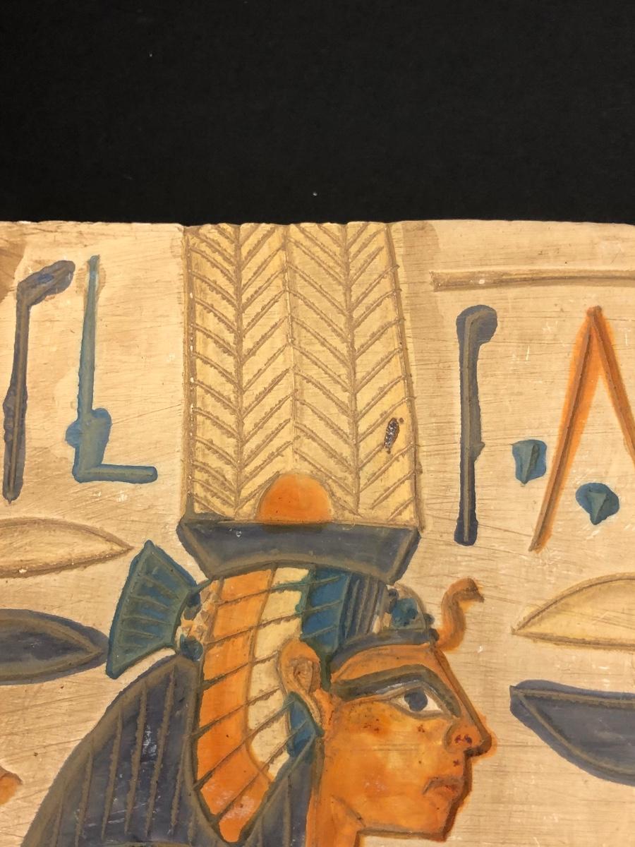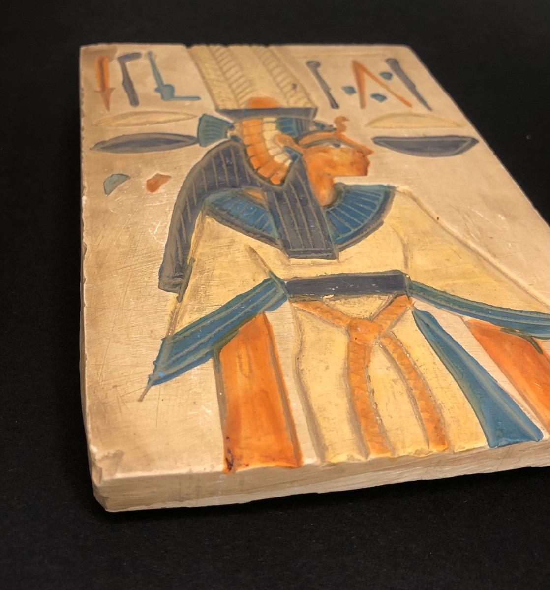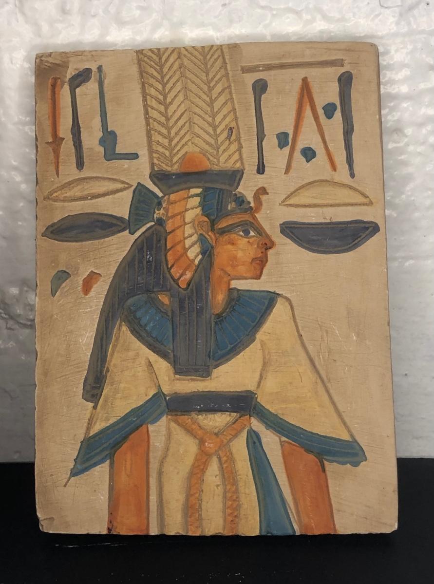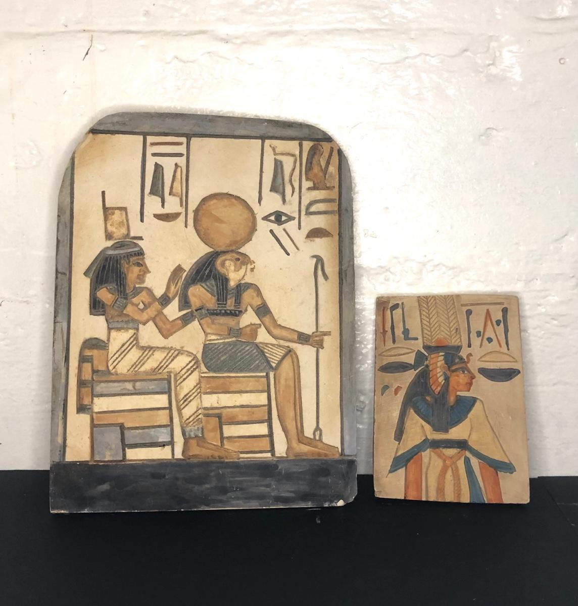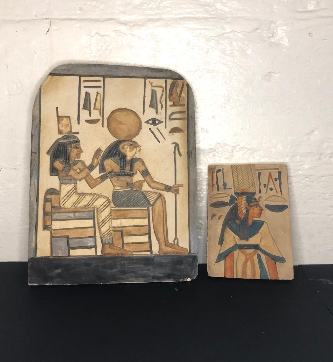 Set of two painted engravings on clay tablets depicting the Tomb of Queen Nefertari and Queen Nefertari. Tablets measure 12" x 9" and 6" x 4.5"