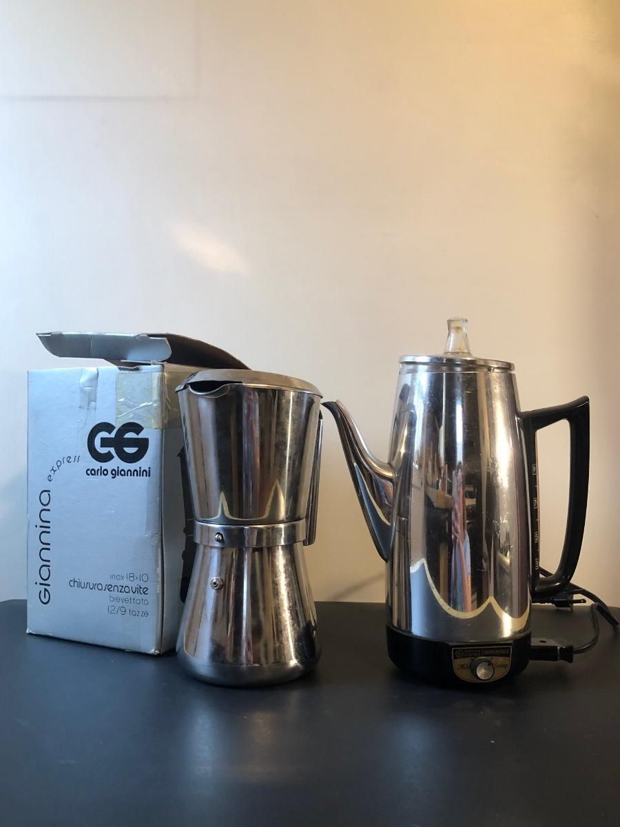 A pair of vintage coffee makers, the Carlo Giannina one with its original box.