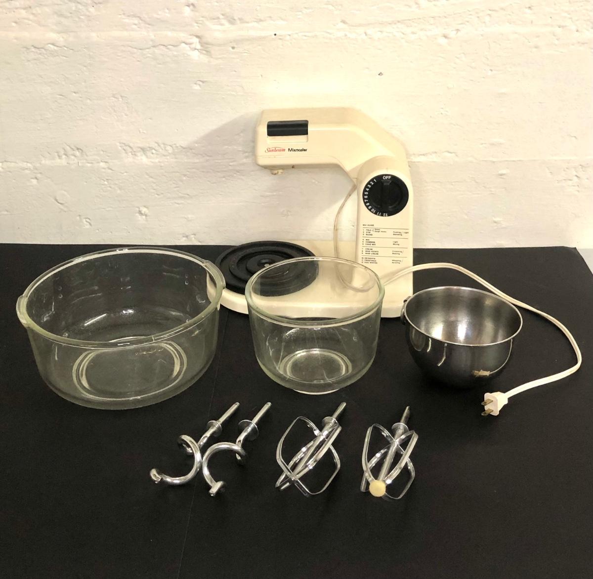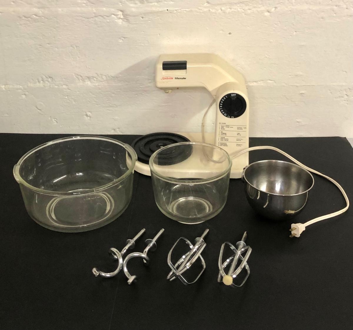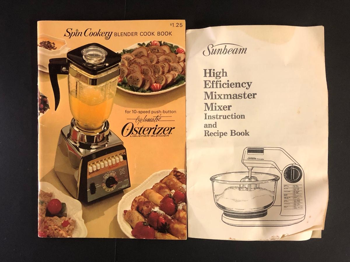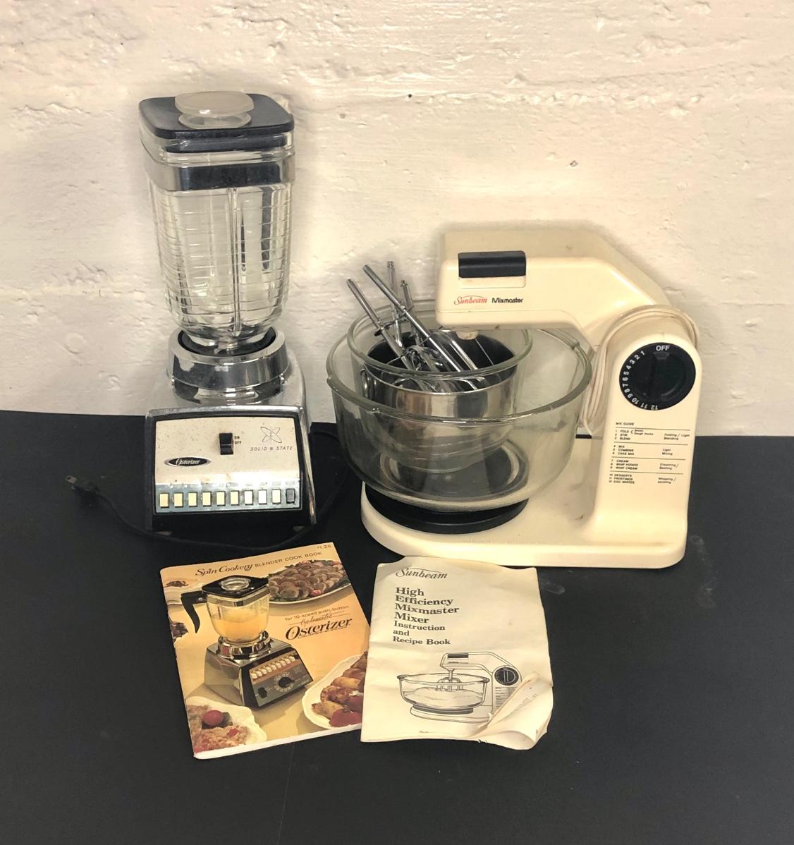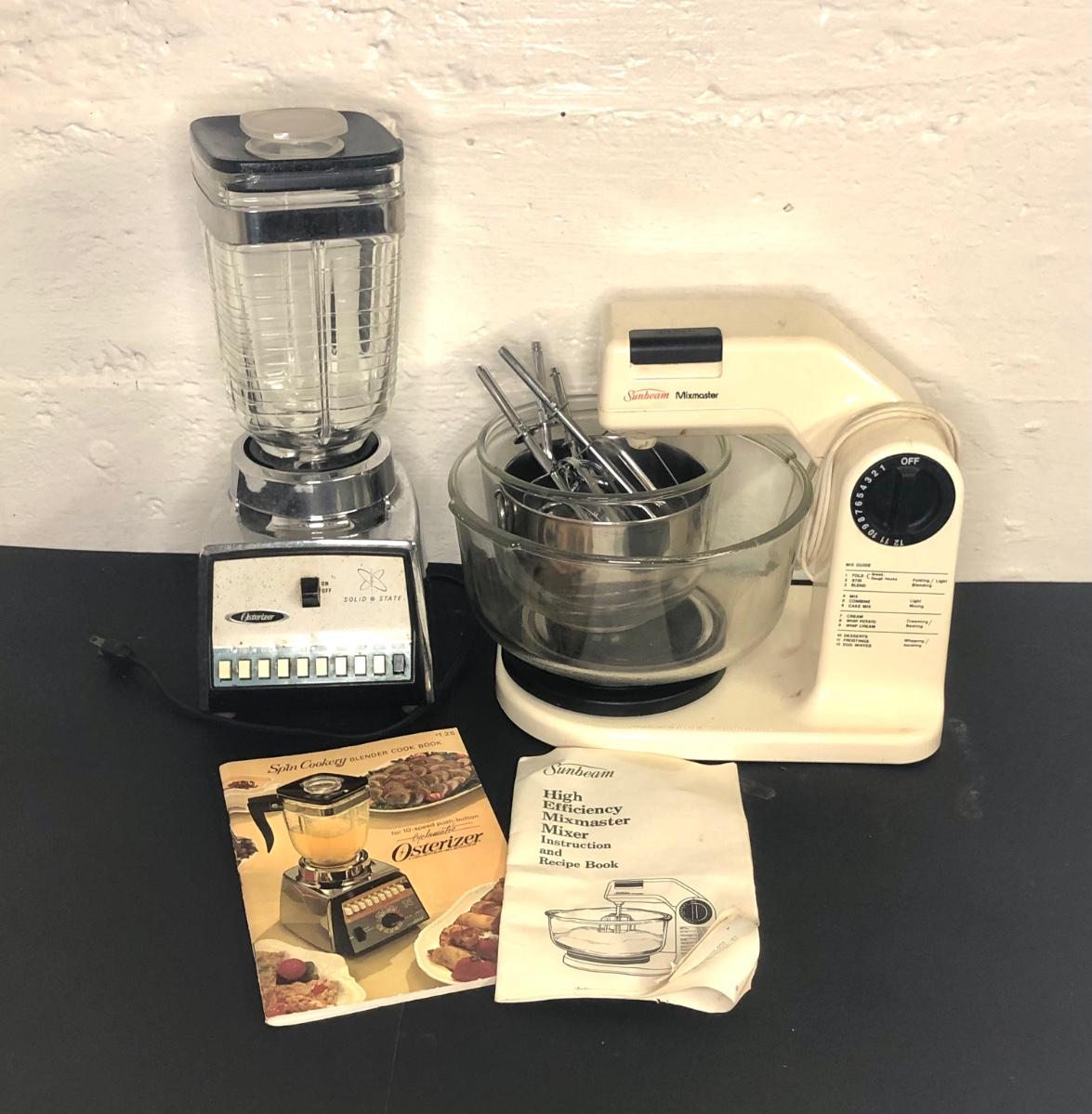 This pair of vintage appliances include their instruction booklets. The Osterizer Galaxie Ten blender includes a glass pitcher and rubber top. The Sunbeam MixMaster includes three bowls and two attachments.