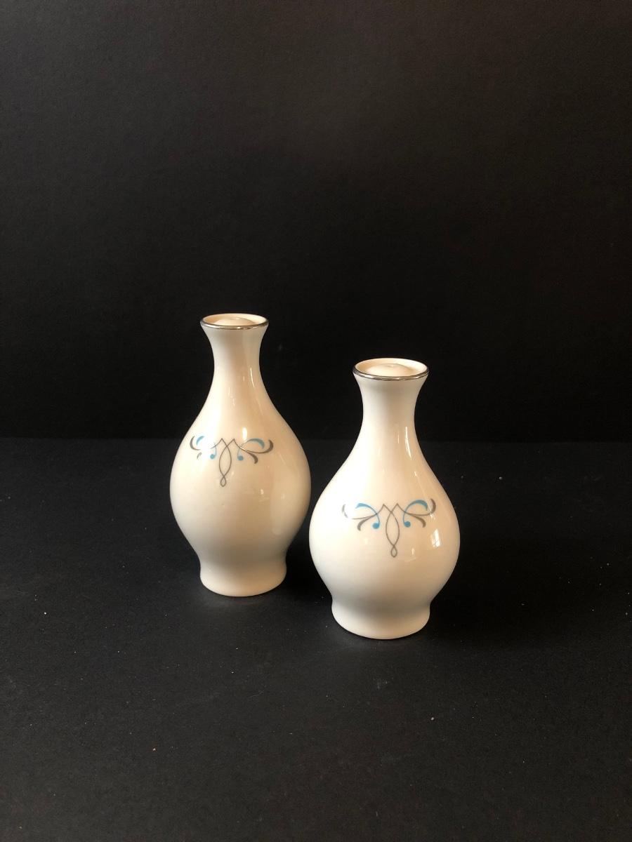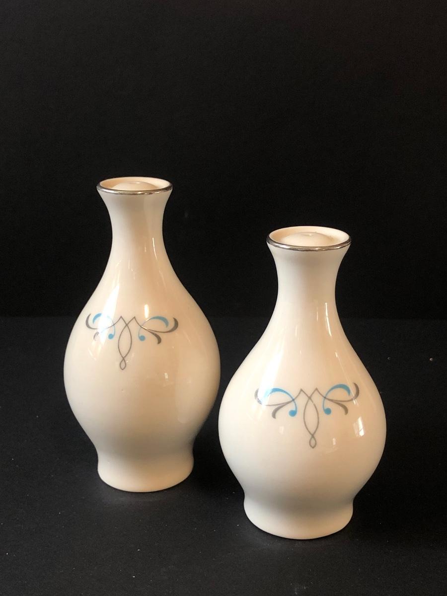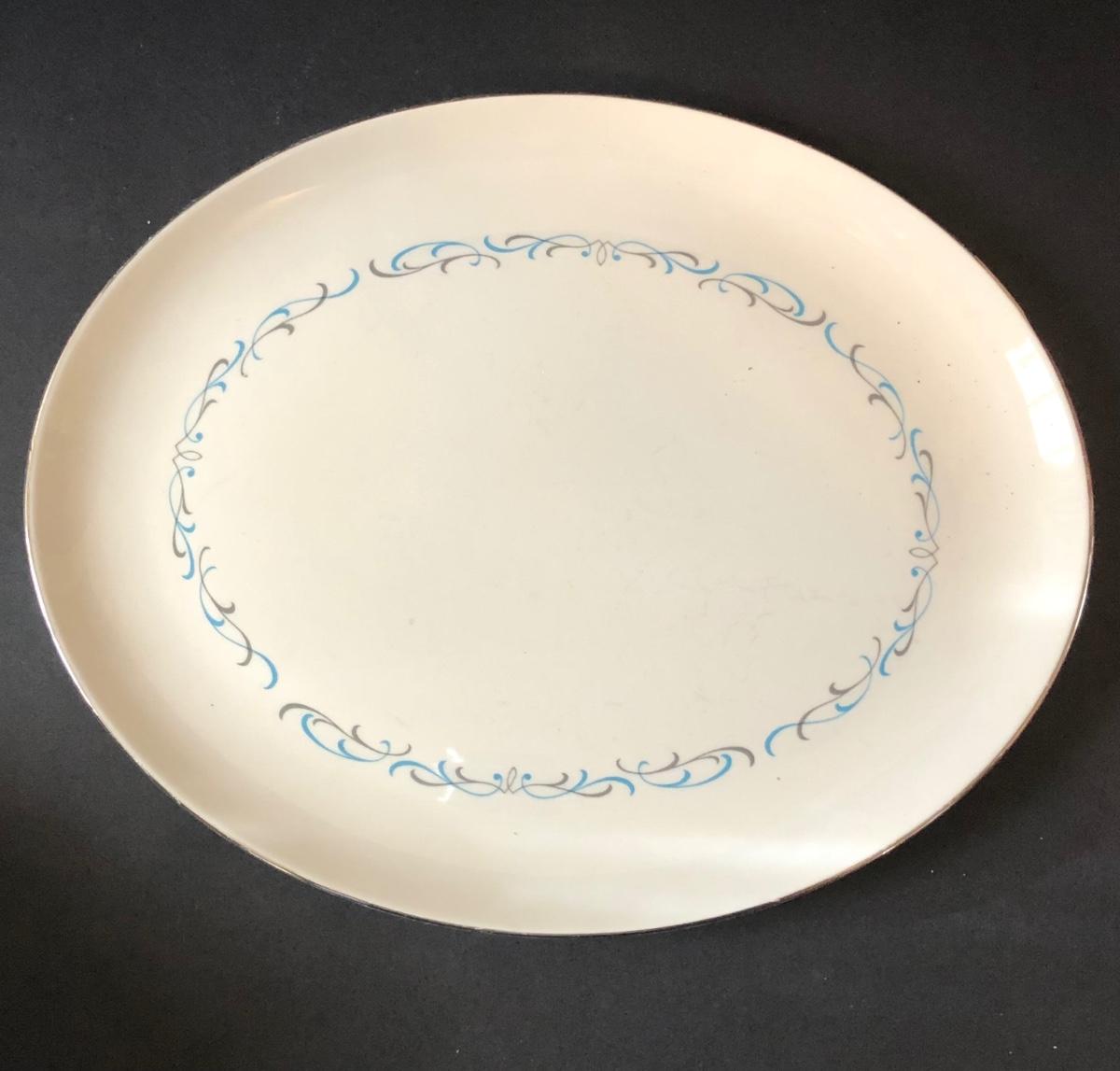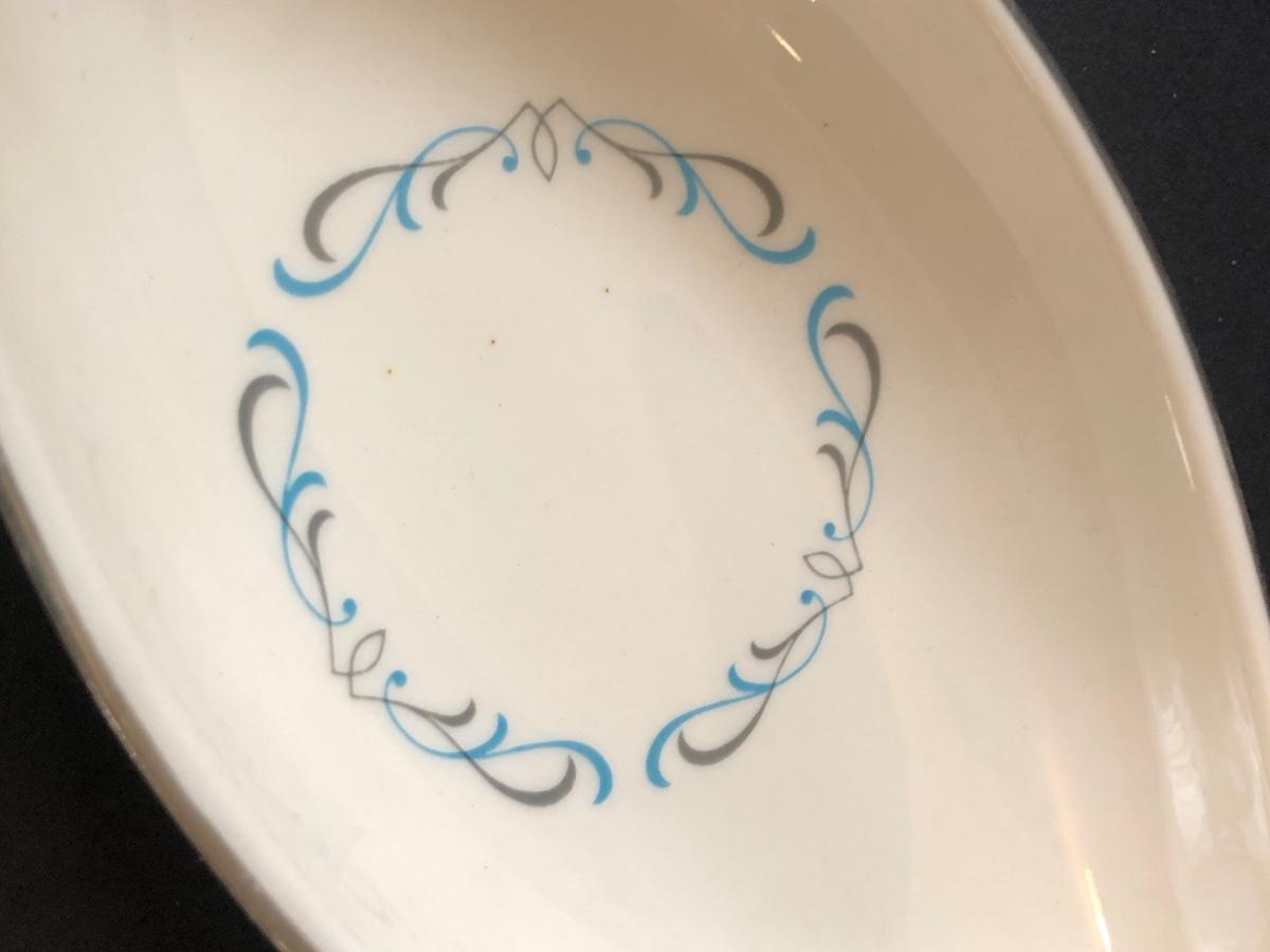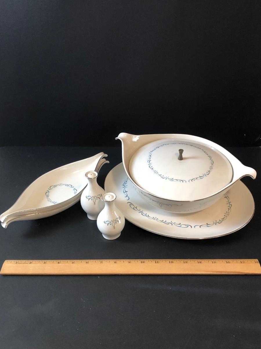 Antique white dishes with blue accents made by Taylor Smith & Taylor Company. Includes a large serving bowl, two smaller serving dishes, a large plate and a set of salt & pepper shakers. Made in the United States.