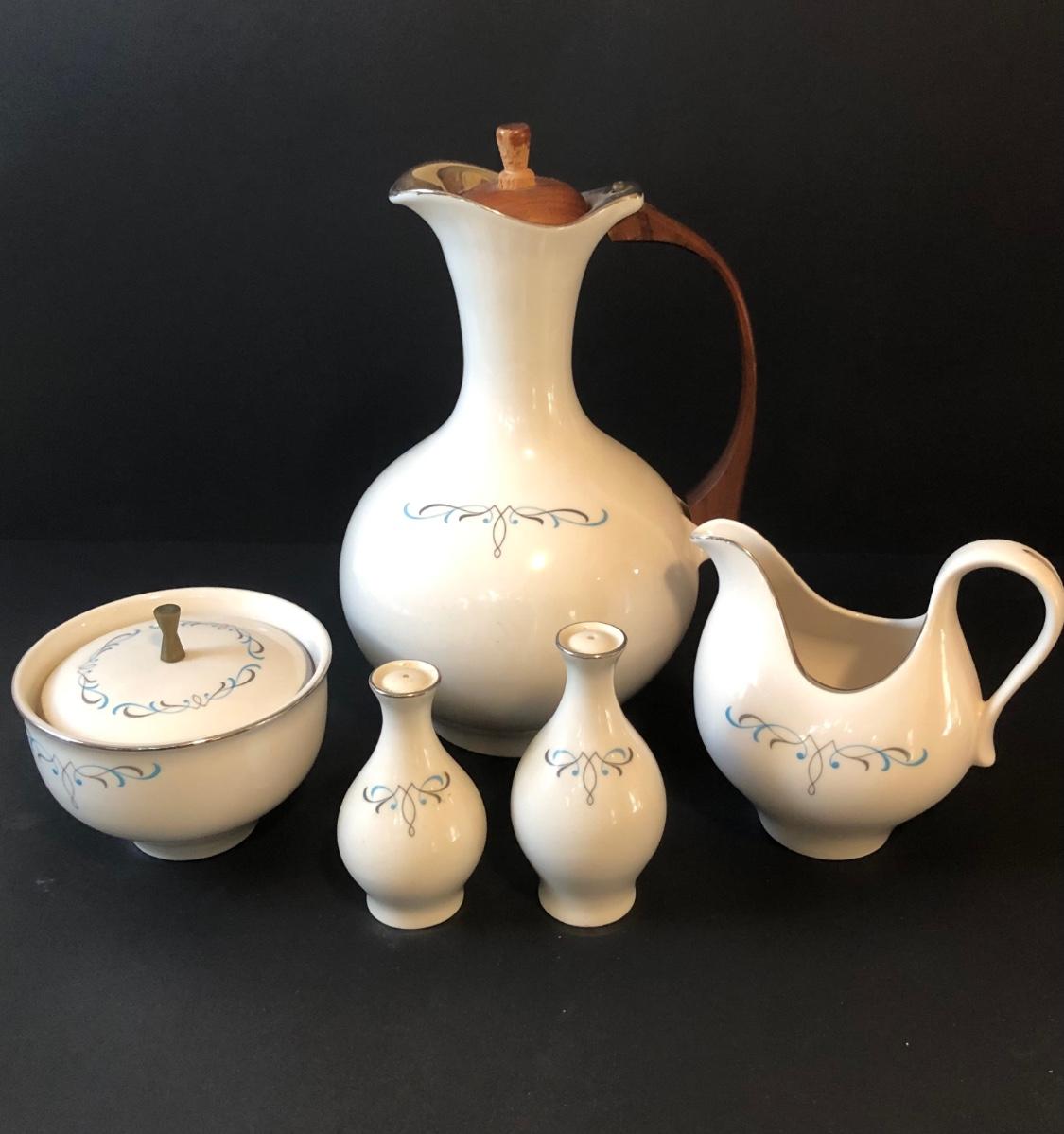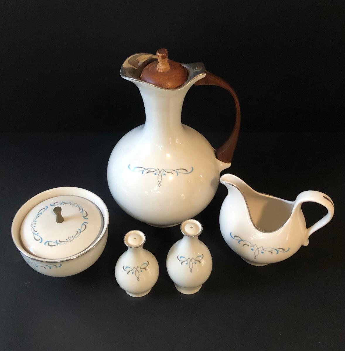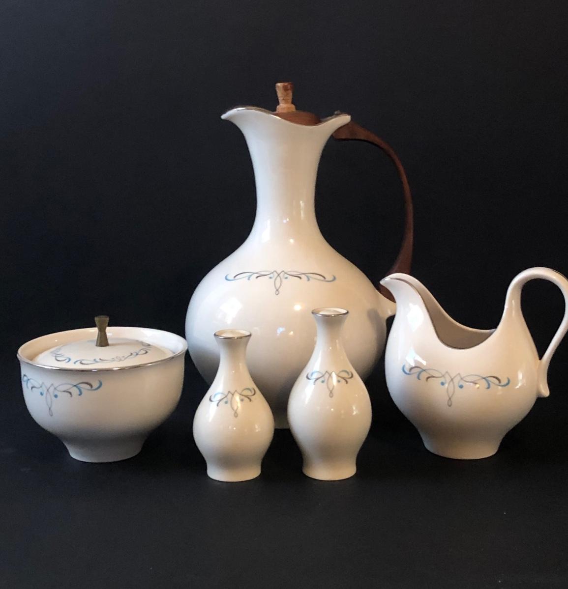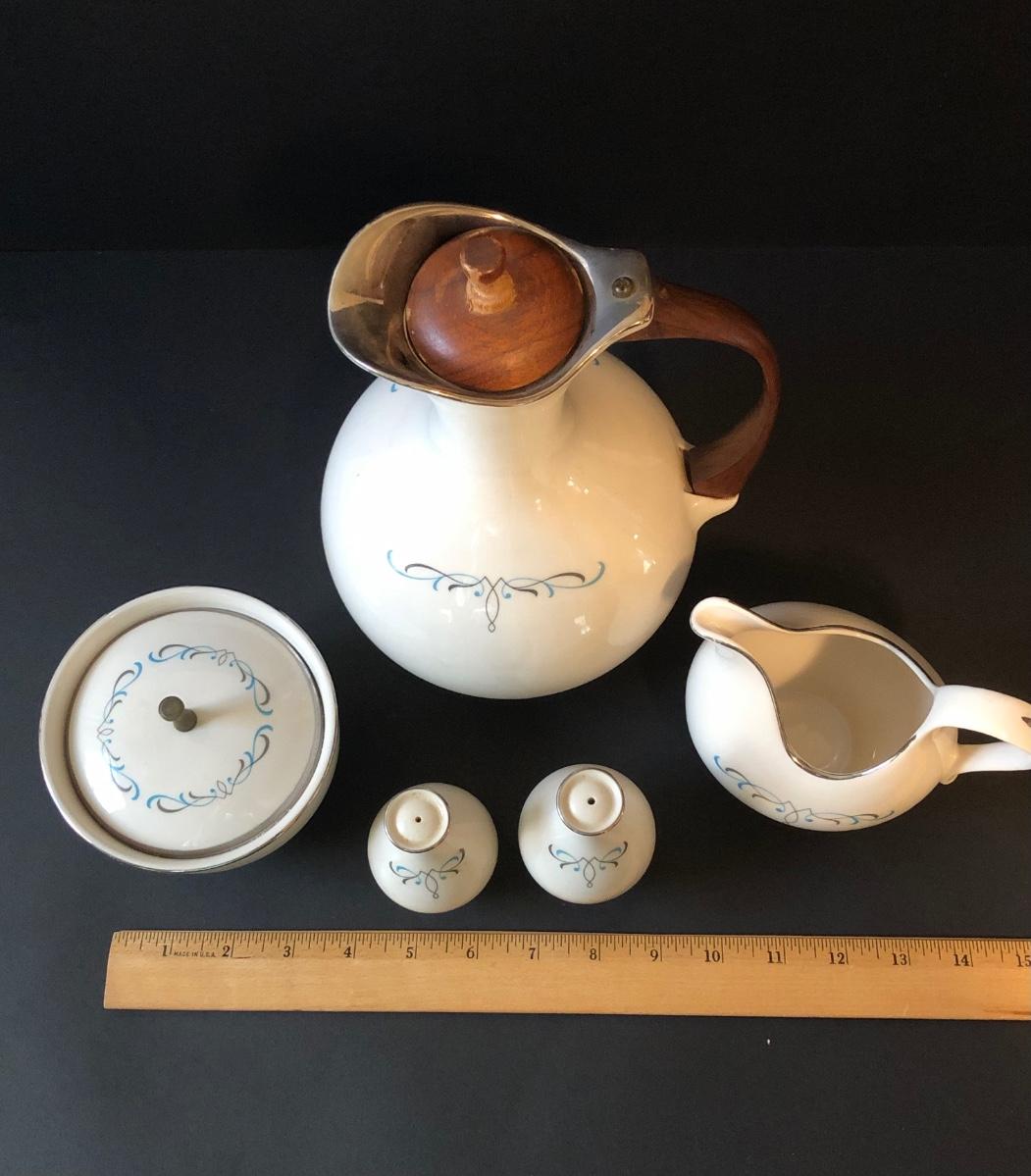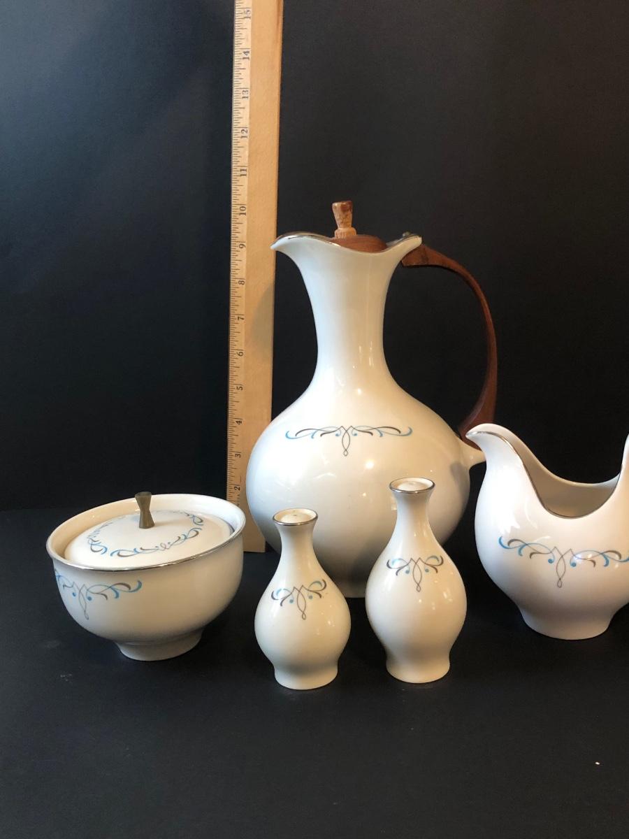 Antique white dishes with blue accents made by Taylor Smith & Taylor Company. Includes a tall pitcher with a wooden handle and lid, a sugar bowl, creamer and a set of salt & pepper shakers. Made in the United States.