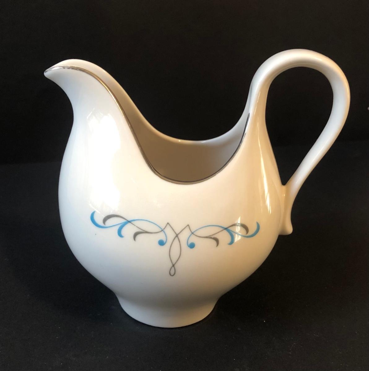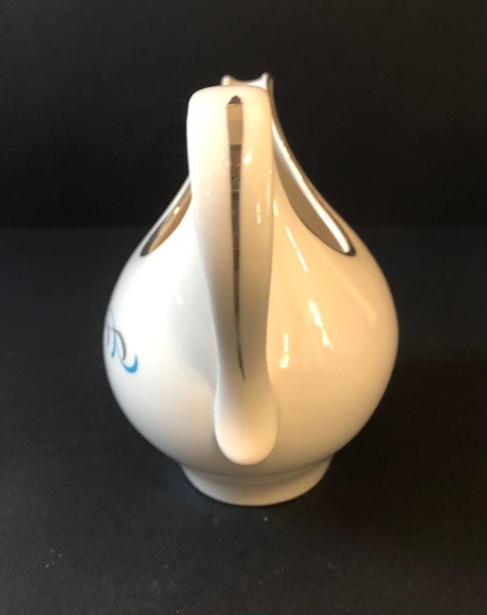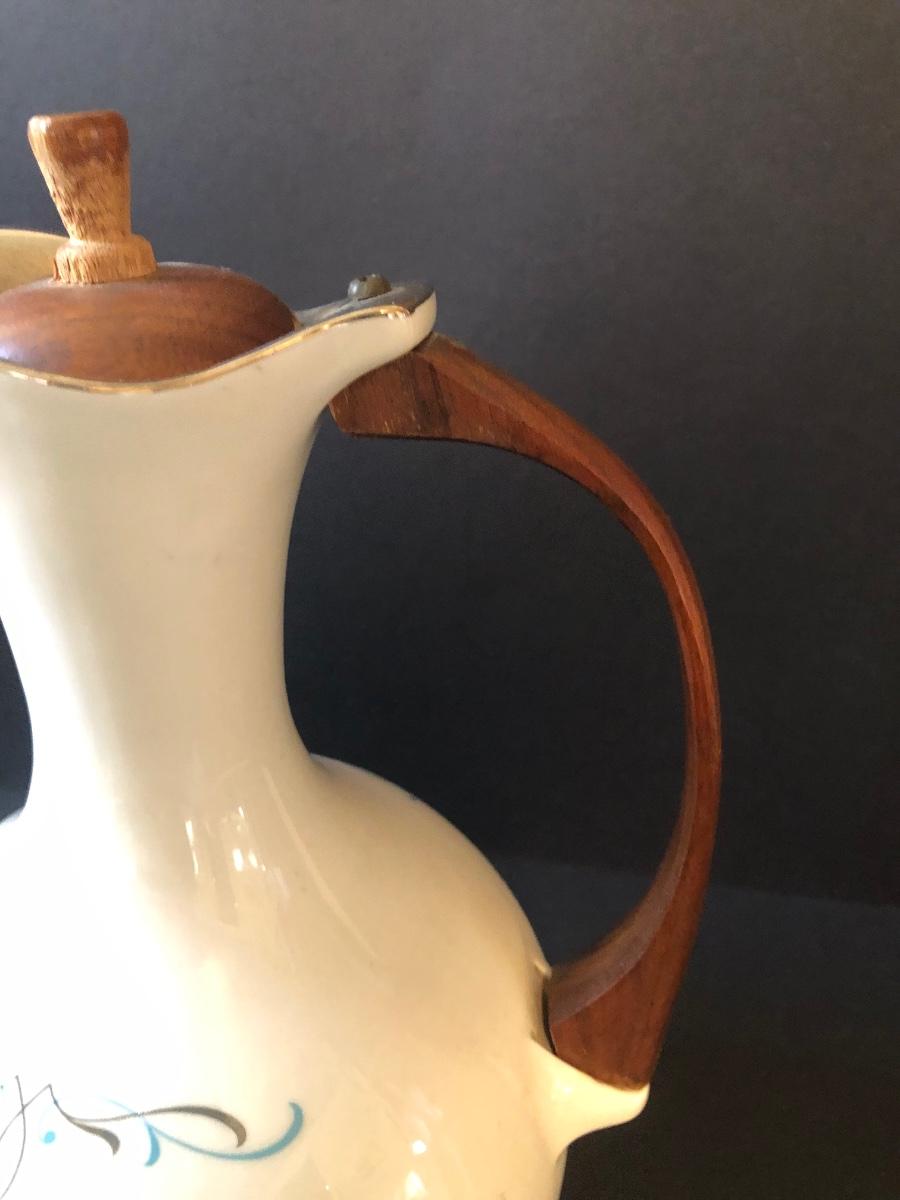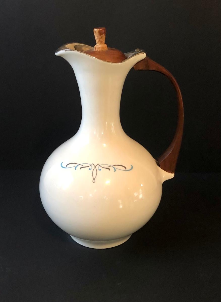 Antique white dishes with blue accents made by Taylor Smith & Taylor Company. Includes a tall pitcher with a wooden handle and lid, a sugar bowl, creamer and a set of salt & pepper shakers. Made in the United States.