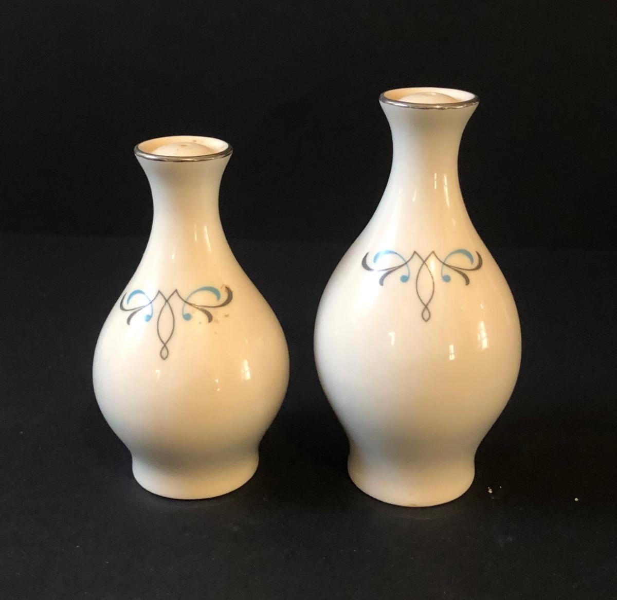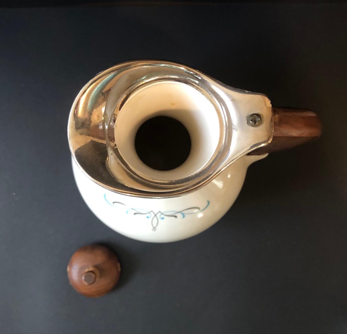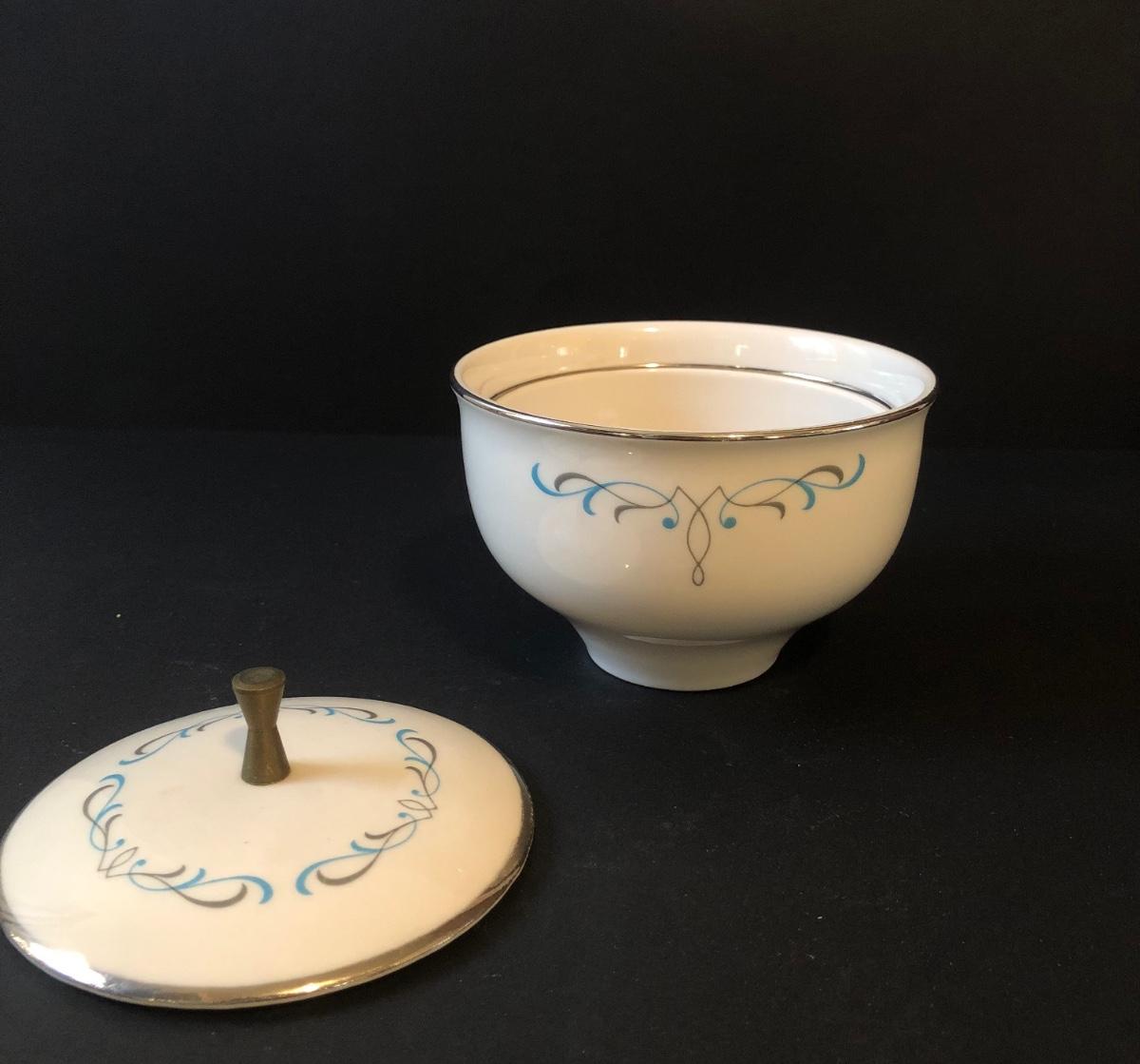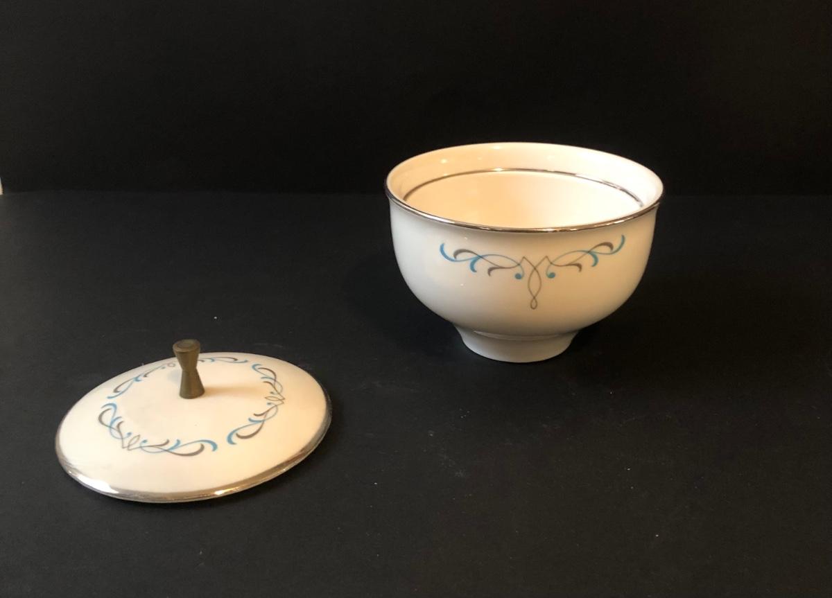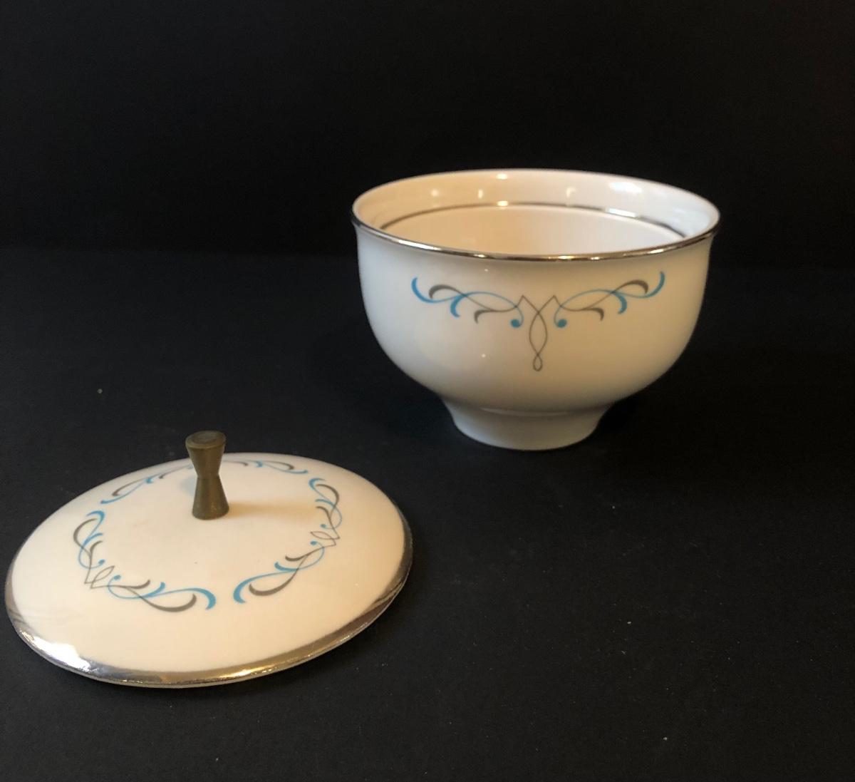 Antique white dishes with blue accents made by Taylor Smith & Taylor Company. Includes a tall pitcher with a wooden handle and lid, a sugar bowl, creamer and a set of salt & pepper shakers. Made in the United States.