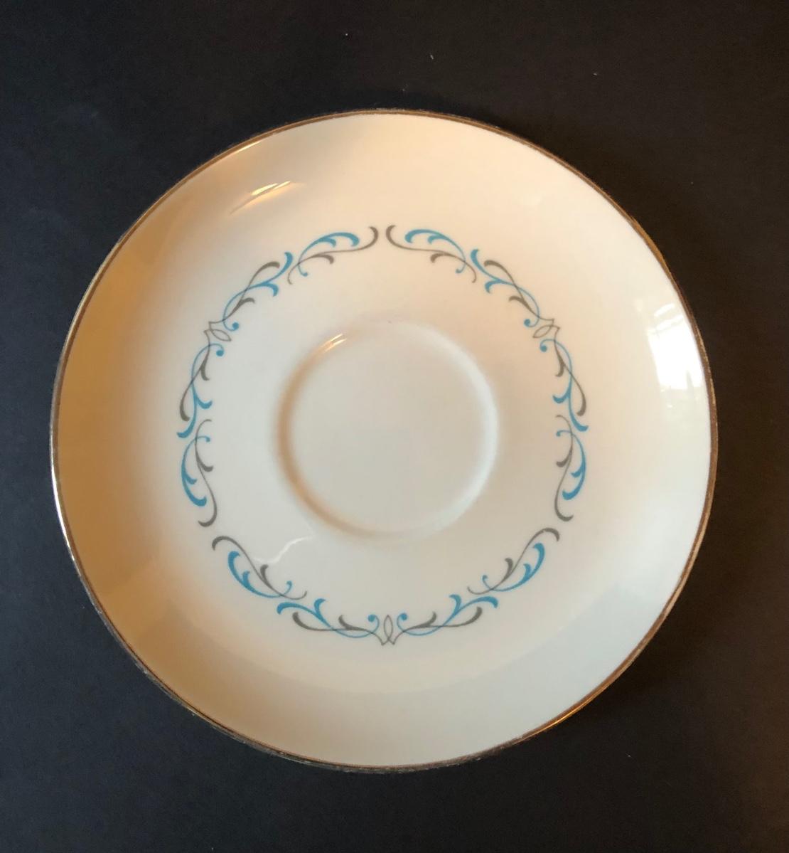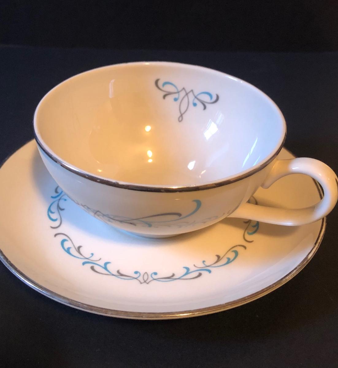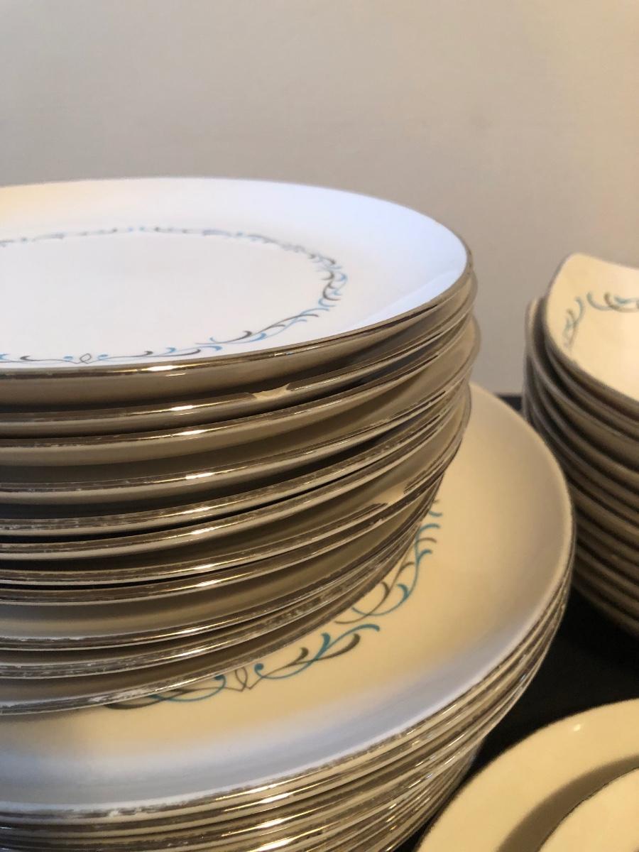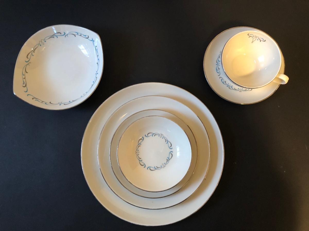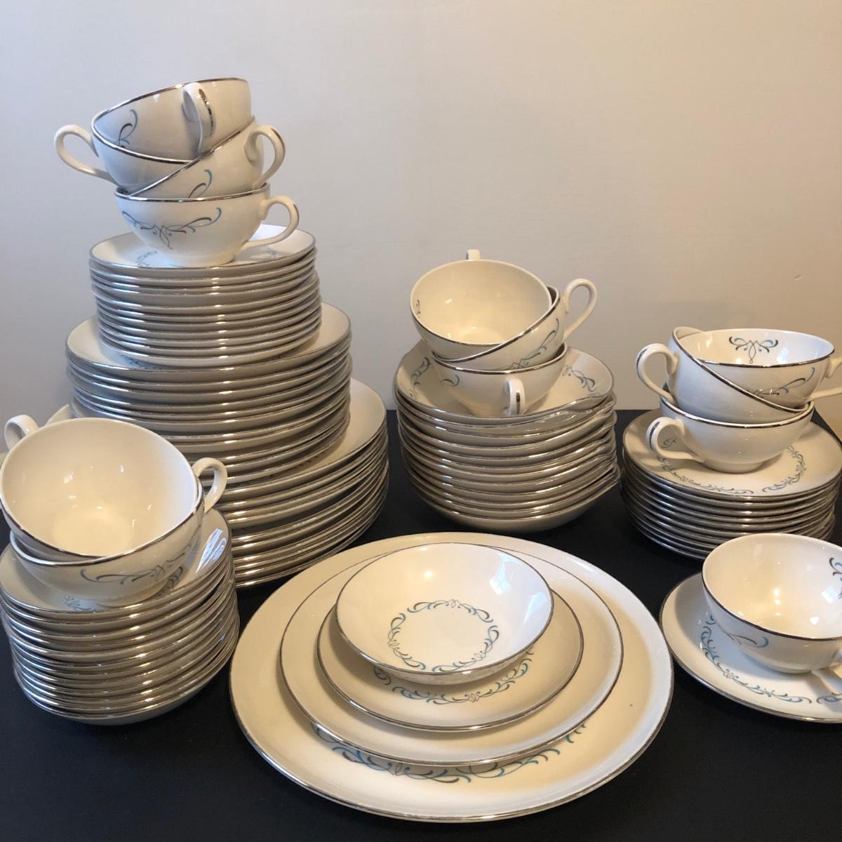 Antique white dishes with blue accents made by Taylor Smith & Taylor Company. Includes ten 10" plates, twelve 8" plates, twelve 6" plates, eleven saucers, sixteen large teacups and thirteen small bowls. There are enough dishes for a service of 10. This set is used and has chips on 2 of the 8" plates, one of the bowls and two of the teacups. Made in the United States.