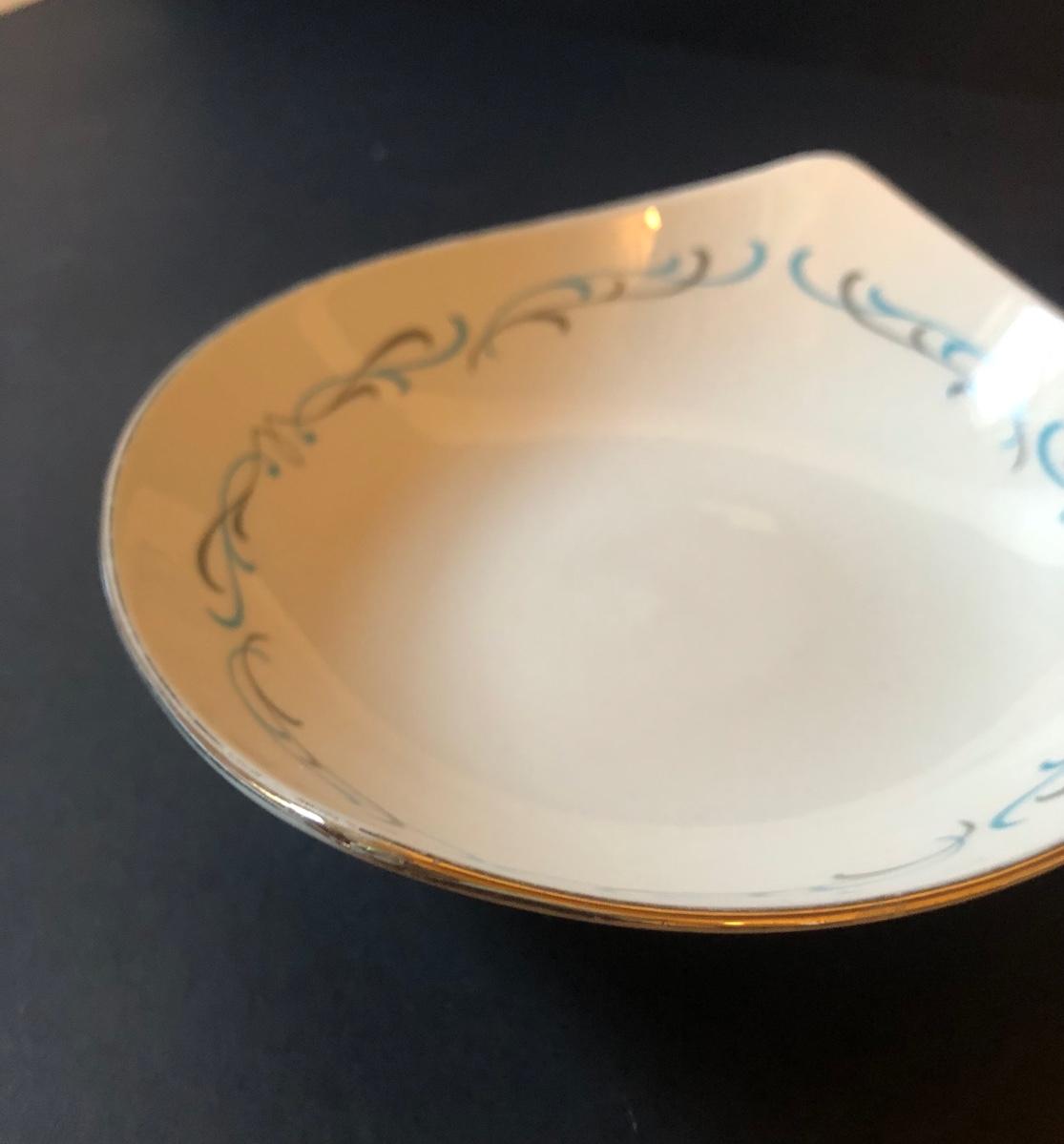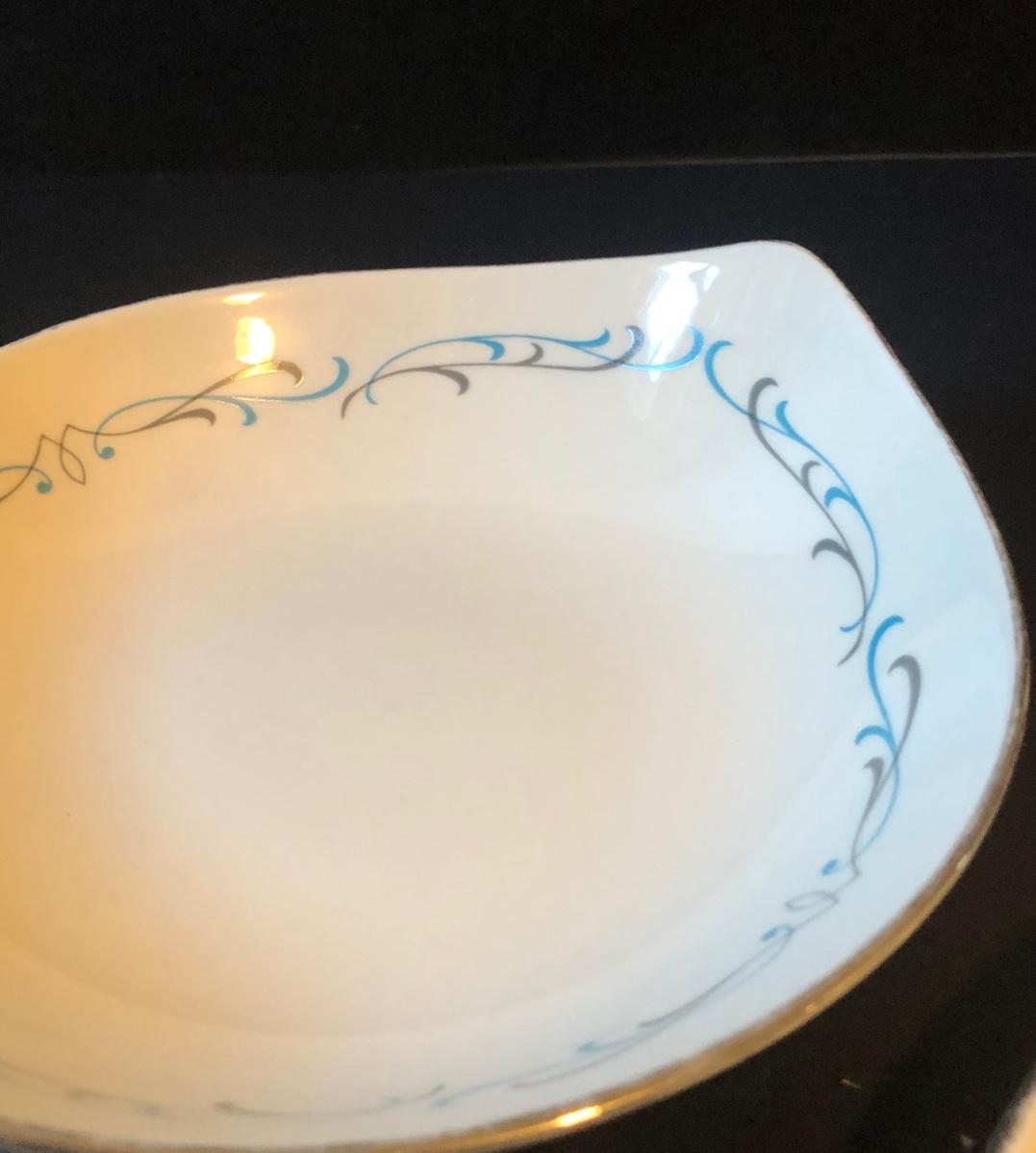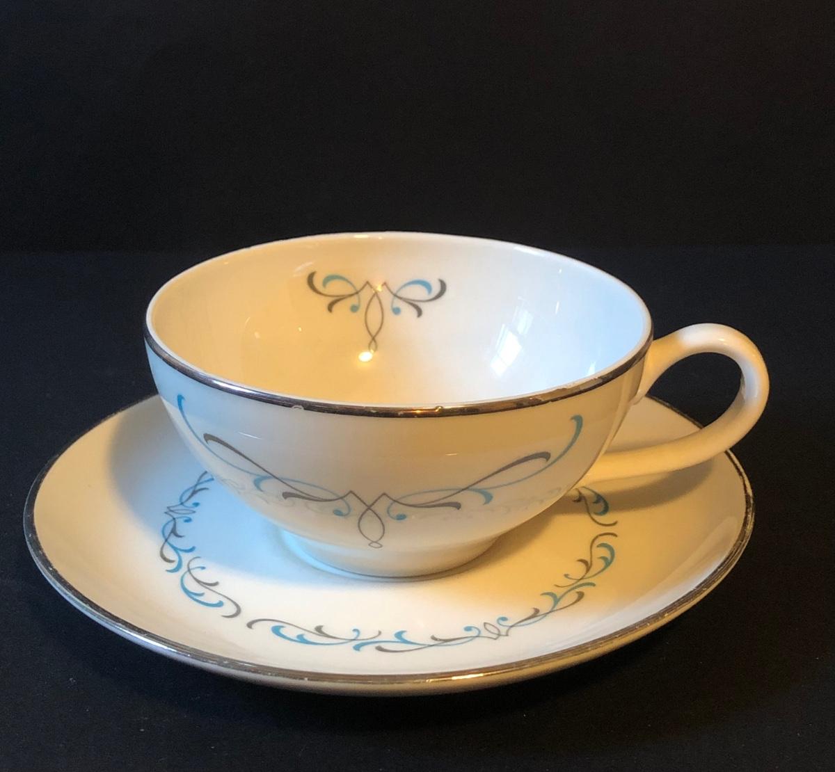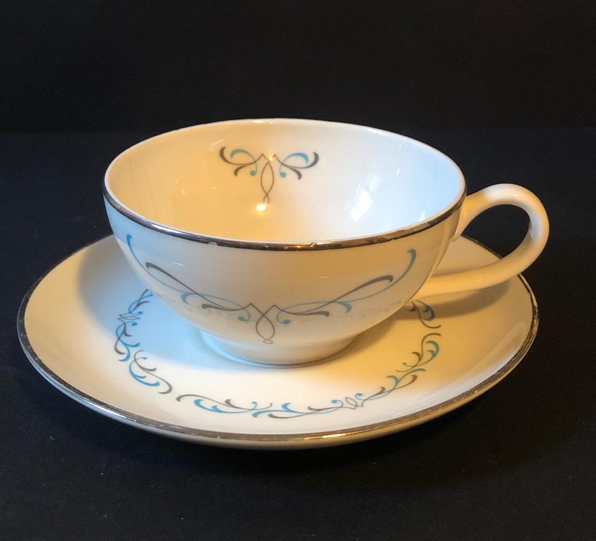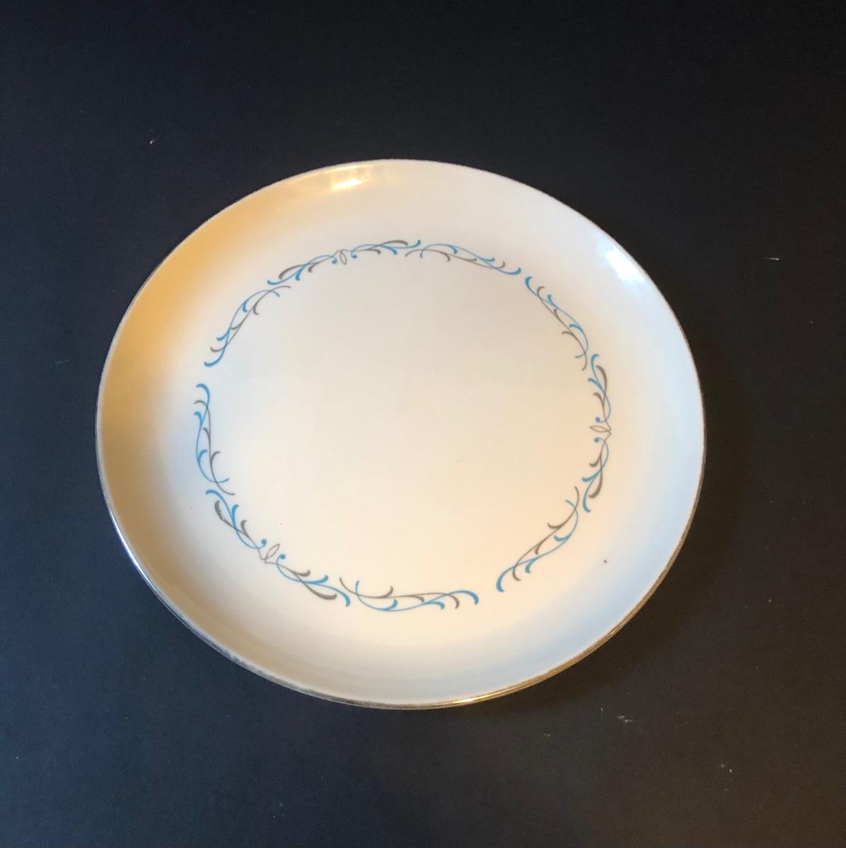 Antique white dishes with blue accents made by Taylor Smith & Taylor Company. Includes ten 10" plates, twelve 8" plates, twelve 6" plates, eleven saucers, sixteen large teacups and thirteen small bowls. There are enough dishes for a service of 10. This set is used and has chips on 2 of the 8" plates, one of the bowls and two of the teacups. Made in the United States.