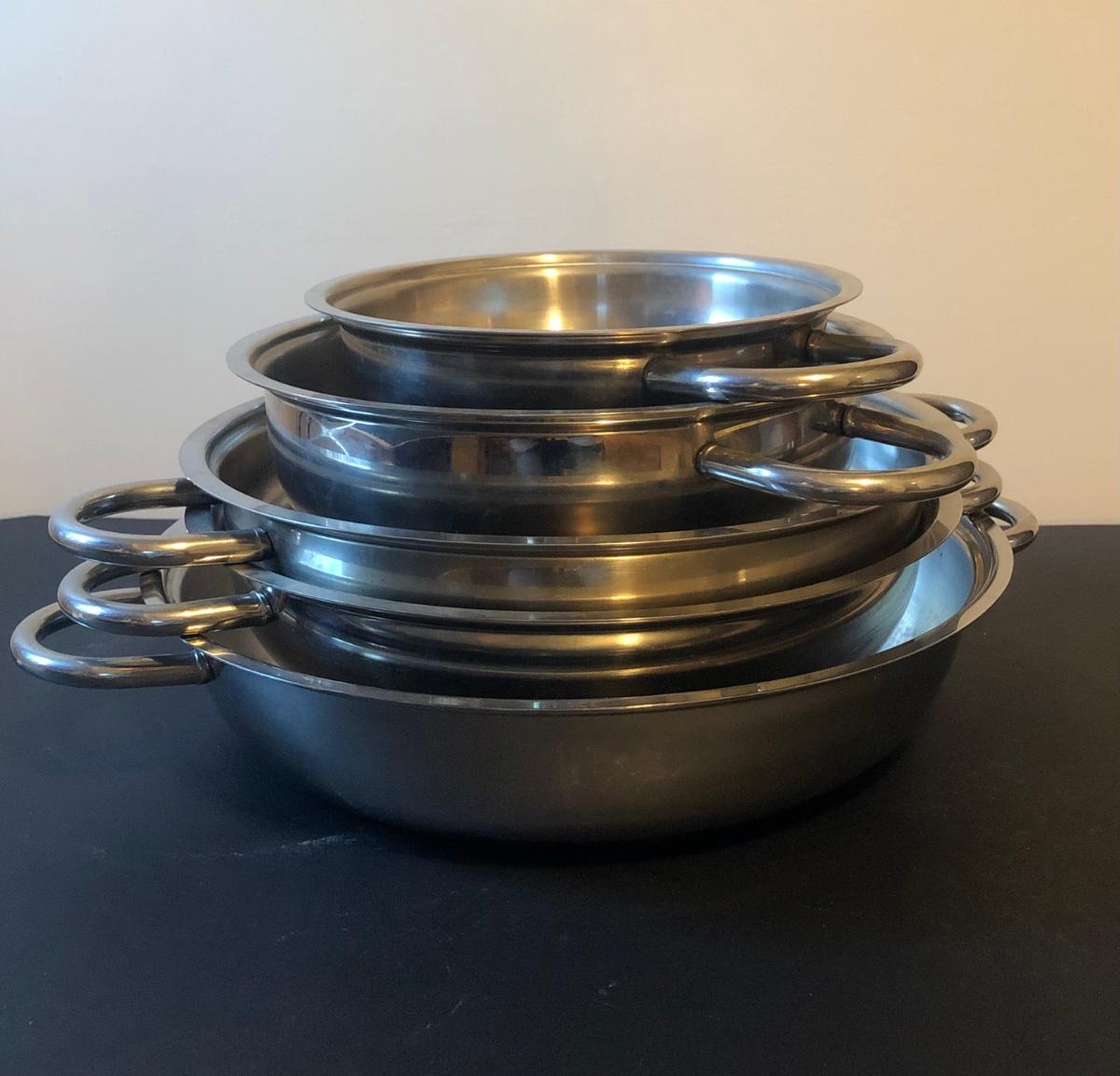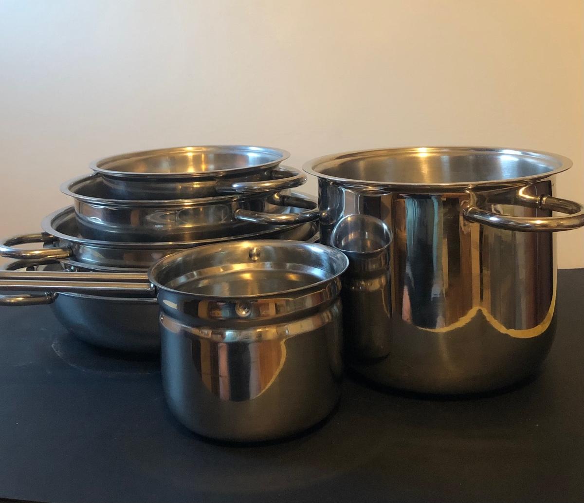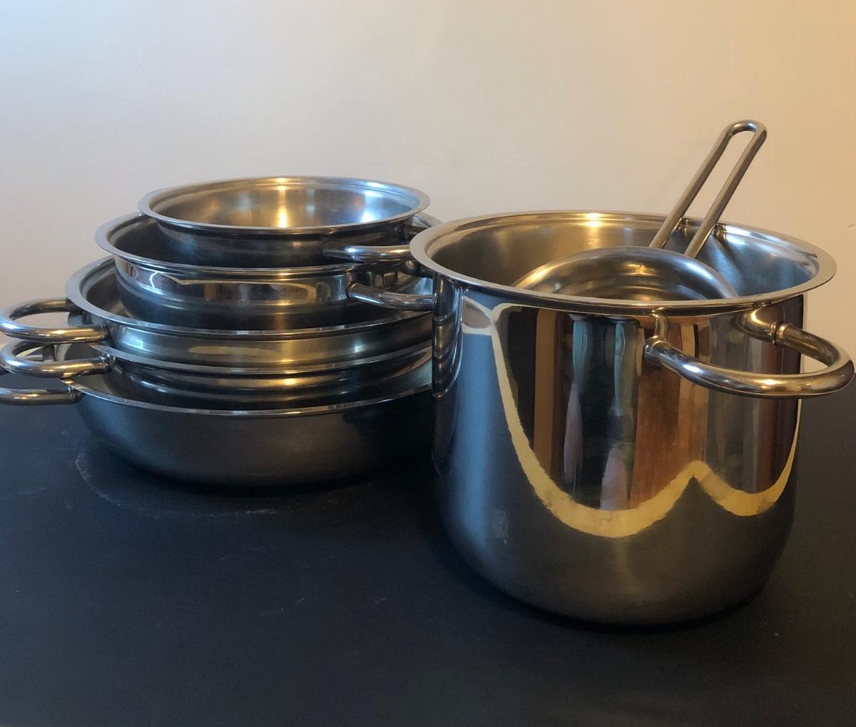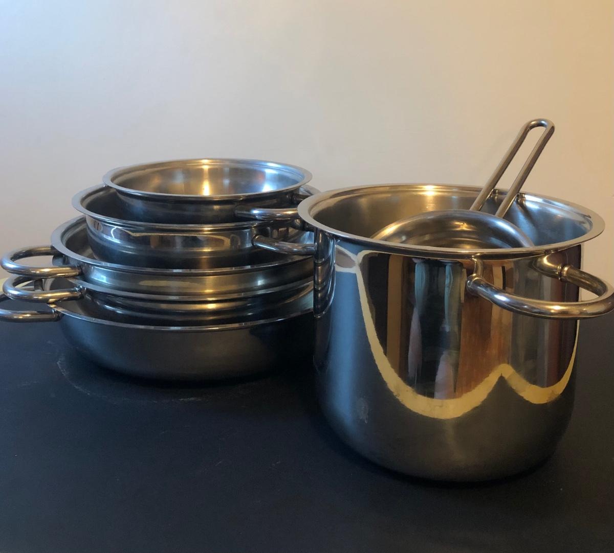 Made of stainless steel. Includes a large deep pot with two handles, a smaller pot with a singular, long handle, and four saucepans with two handles. Made in Italy.