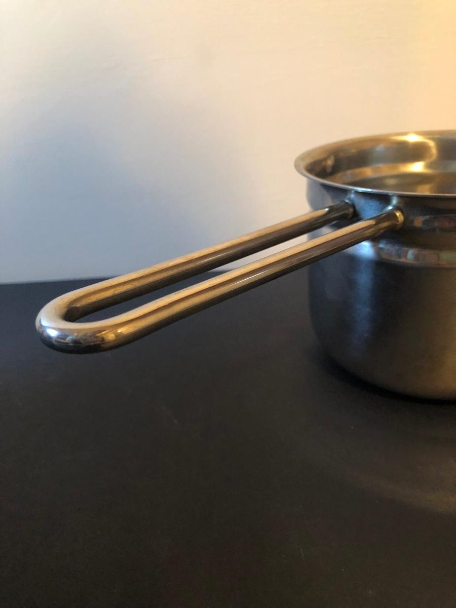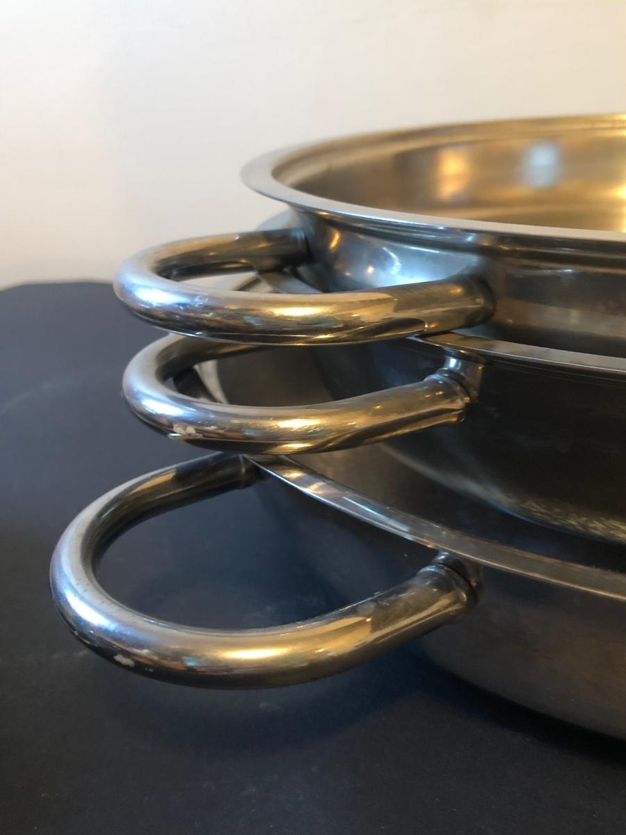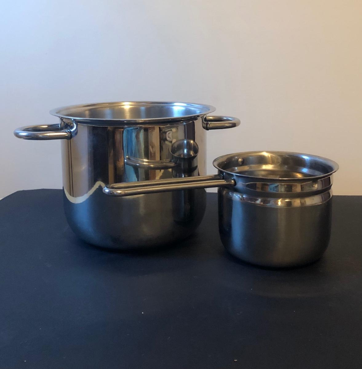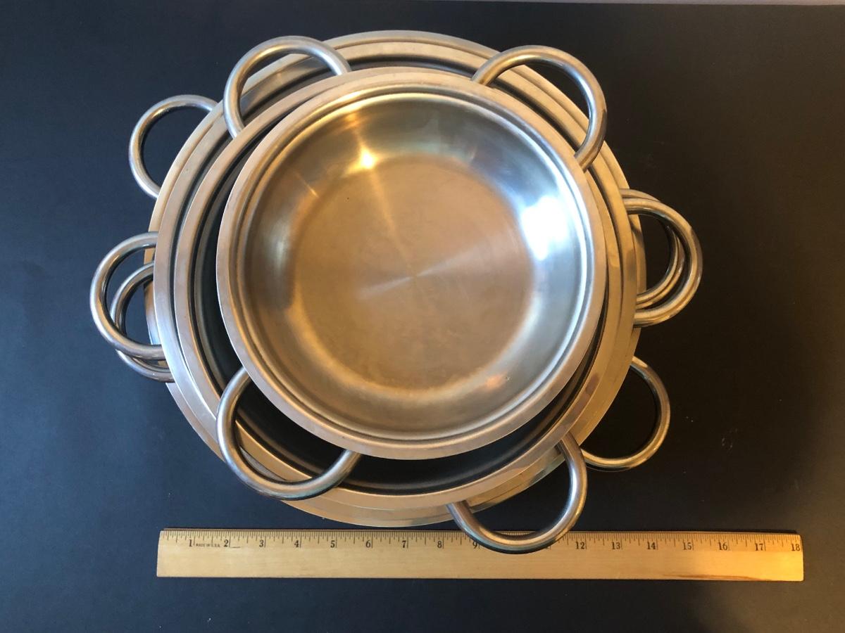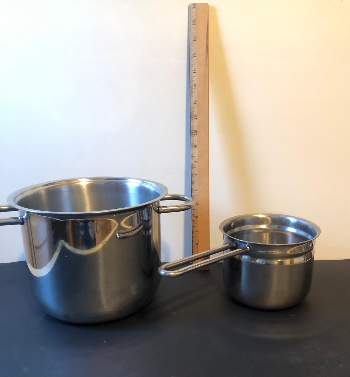 Made of stainless steel. Includes a large deep pot with two handles, a smaller pot with a singular, long handle, and four saucepans with two handles. Made in Italy.