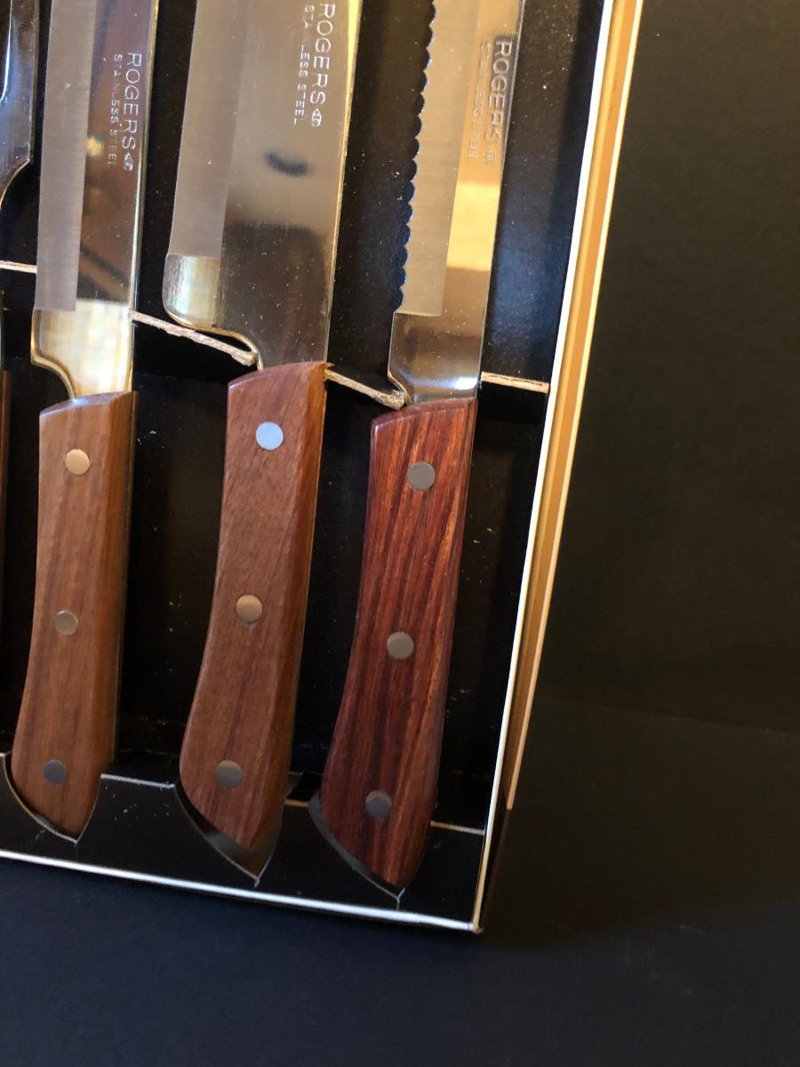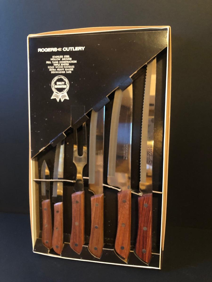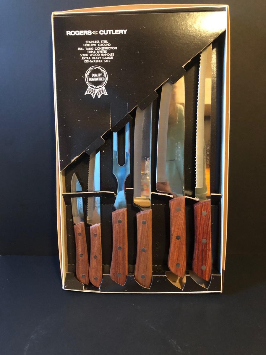 Features a Rogers Cutlery knife set in its original box. Knife set is made of stainless steel with wooden handles and features 7 pieces.