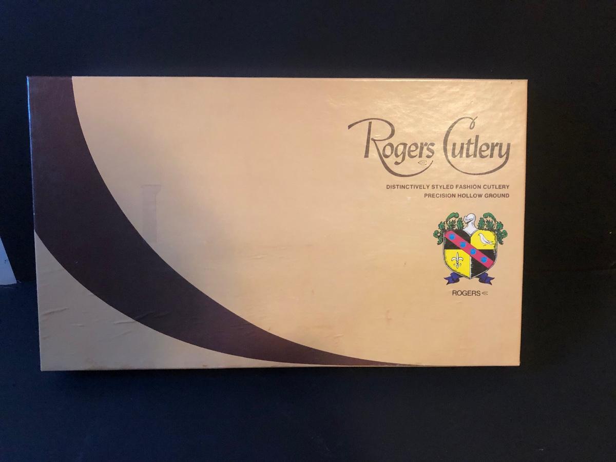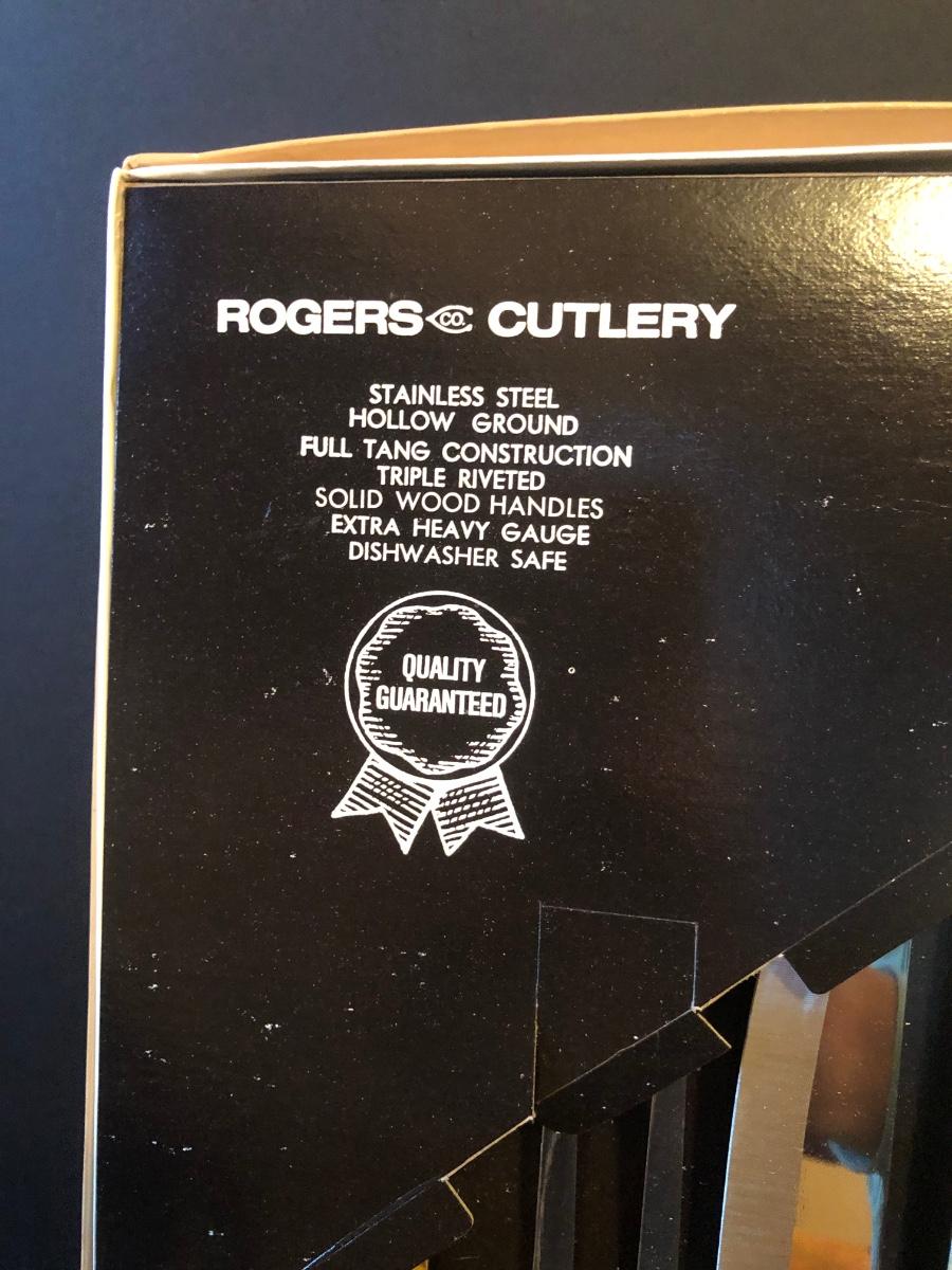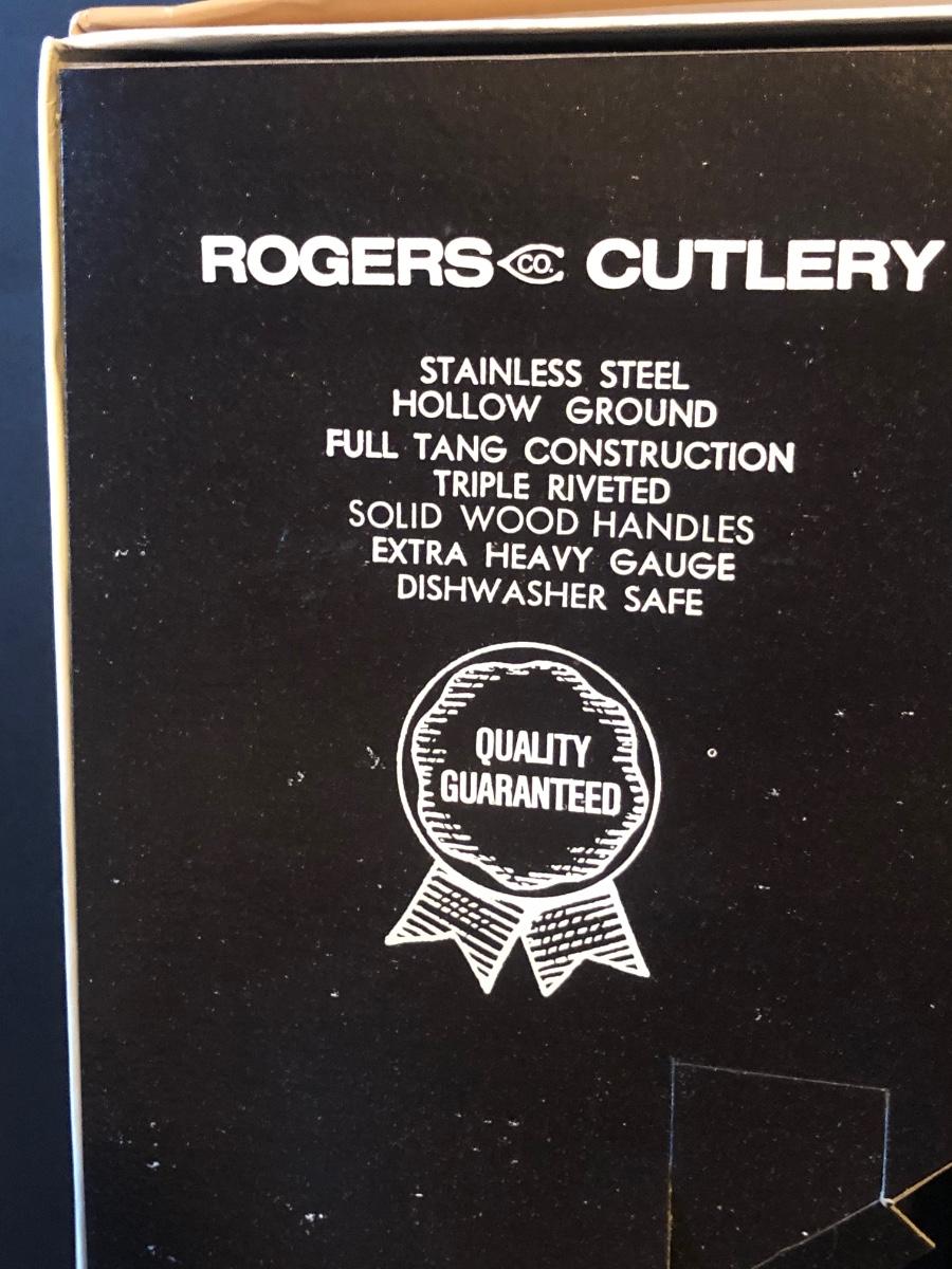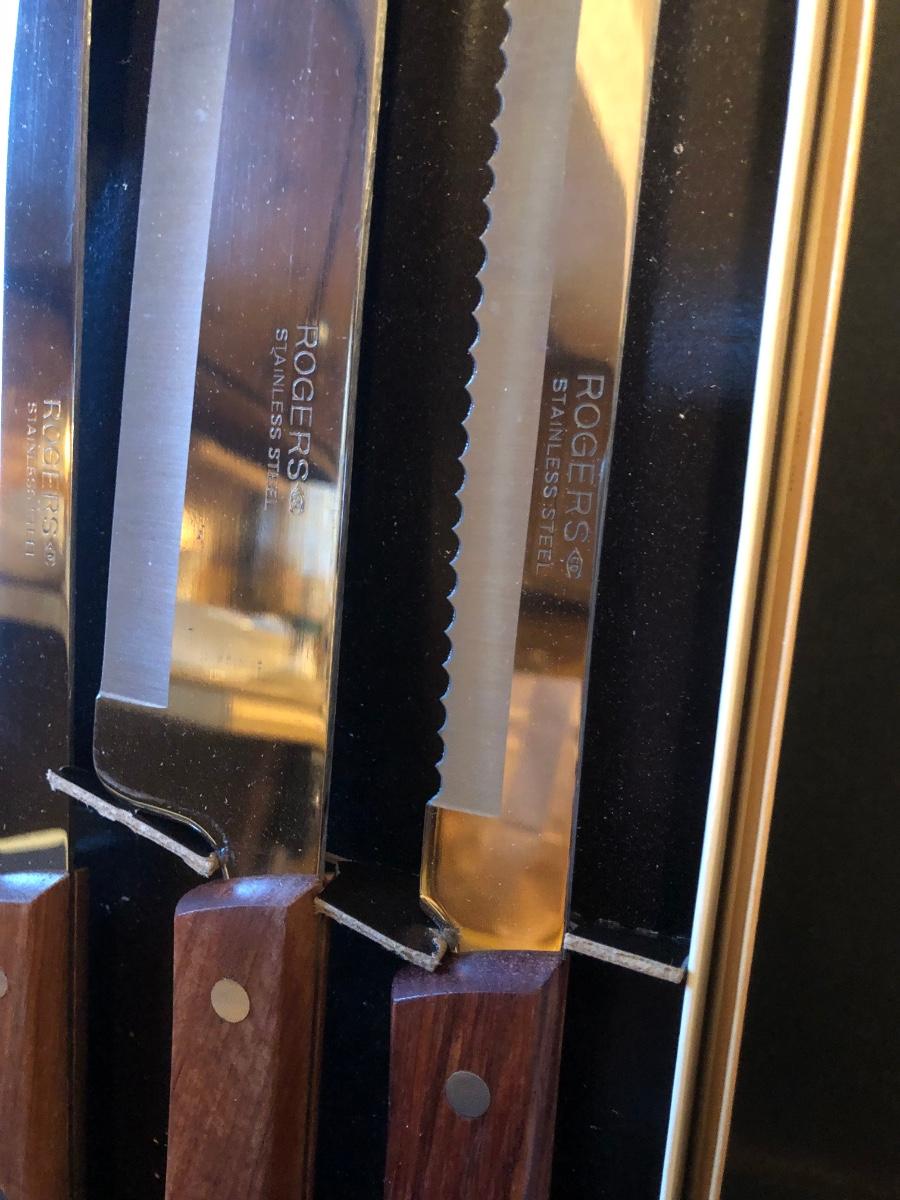Features a Rogers Cutlery knife set in its original box. Knife set is made of stainless steel with wooden handles and features 7 pieces.