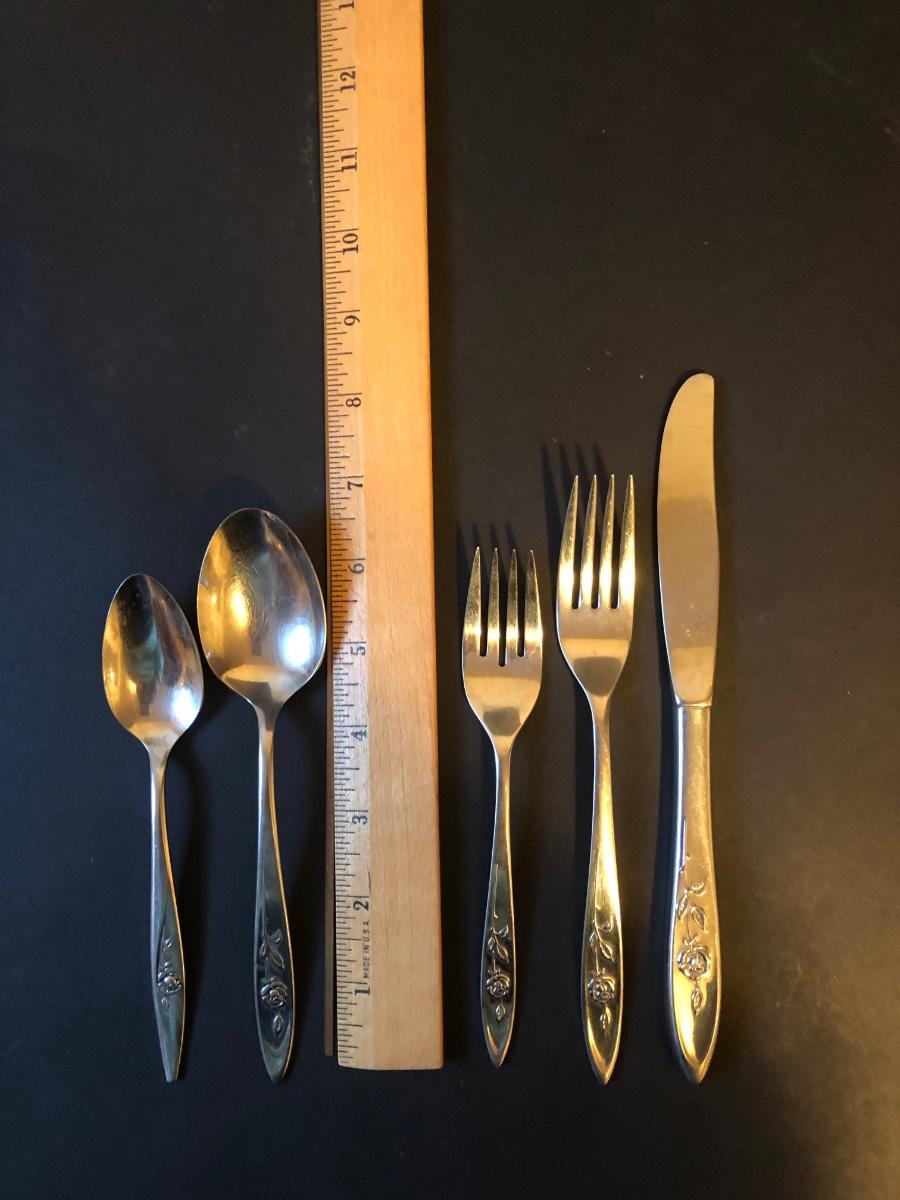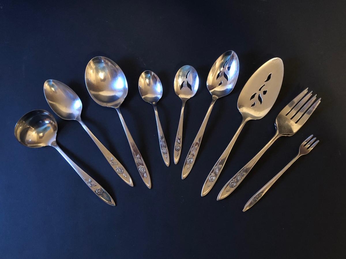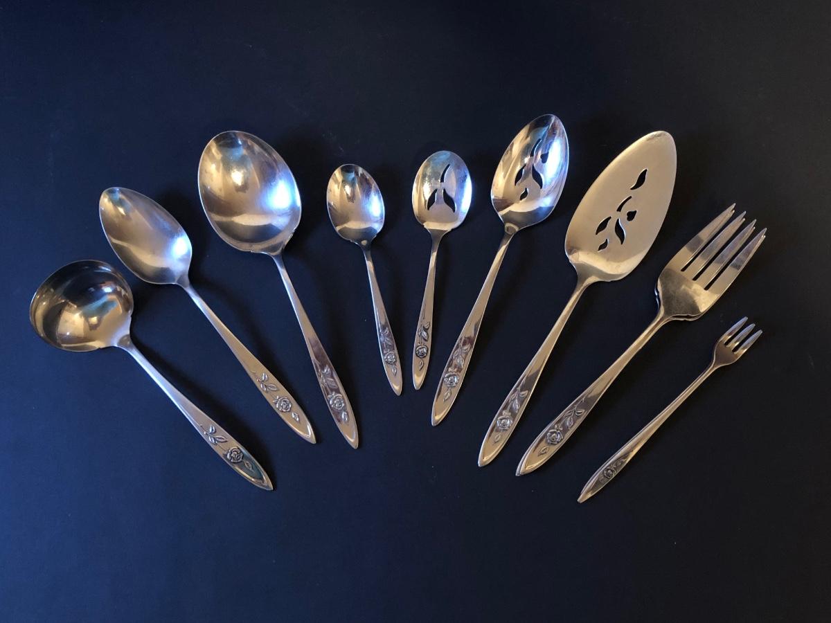 Included is a set of ONEIDA Community Stainless Steel flatware with a raised flower design on the handles. The flatware set includes 7 serving utensils, 2 cocktail forks, 8 small dinner forks, 6 large dinner forks, 7 butter knives, 7 tablespoons, and 10 teaspoons.