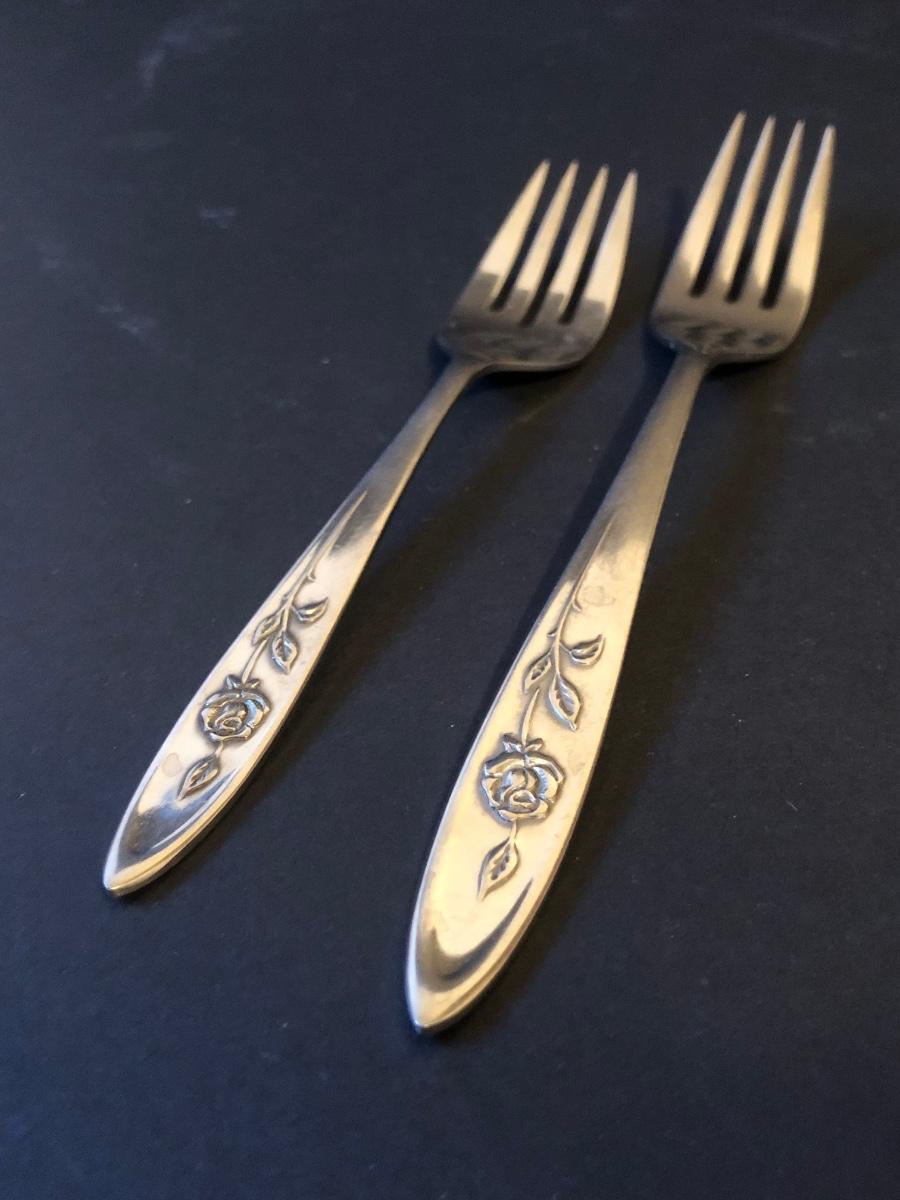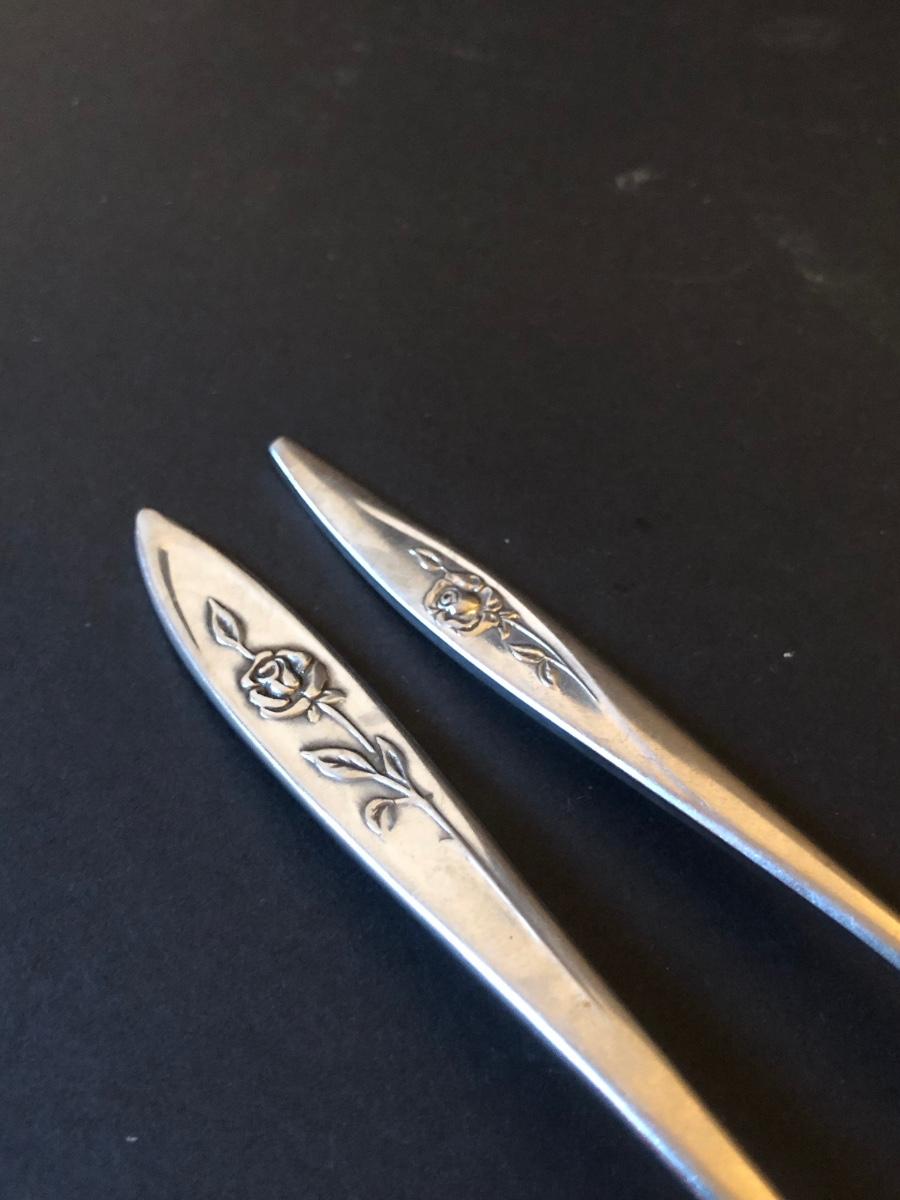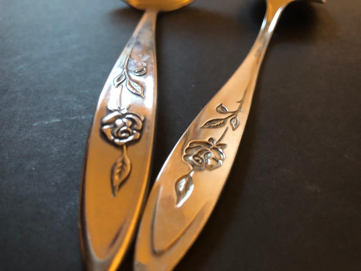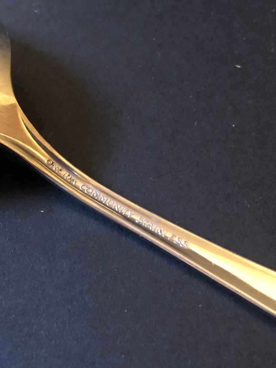 Included is a set of ONEIDA Community Stainless Steel flatware with a raised flower design on the handles. The flatware set includes 7 serving utensils, 2 cocktail forks, 8 small dinner forks, 6 large dinner forks, 7 butter knives, 7 tablespoons, and 10 teaspoons.
