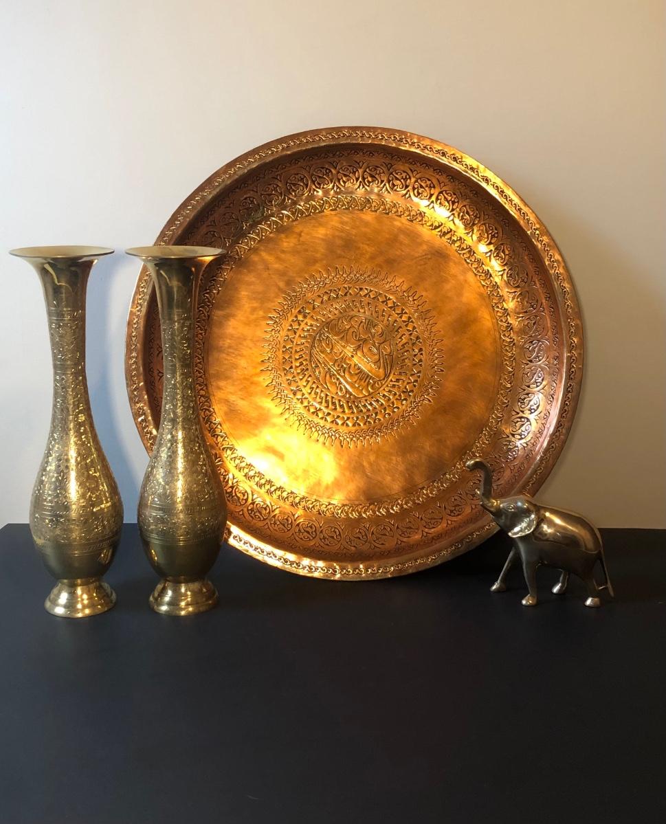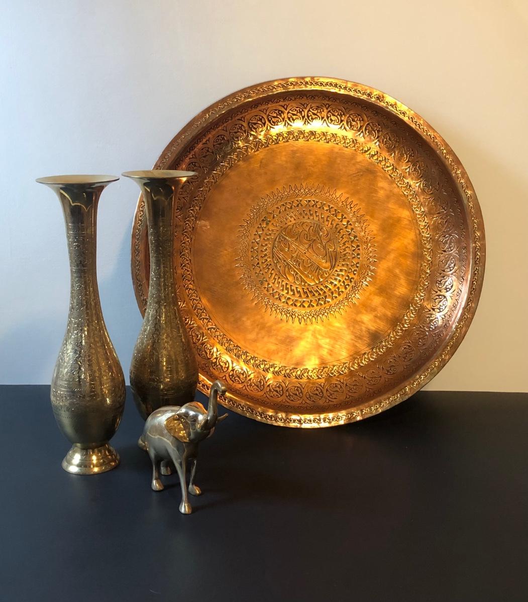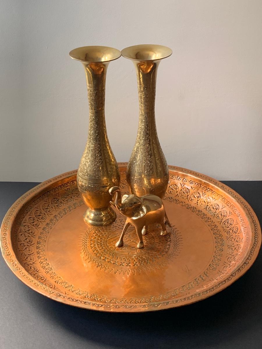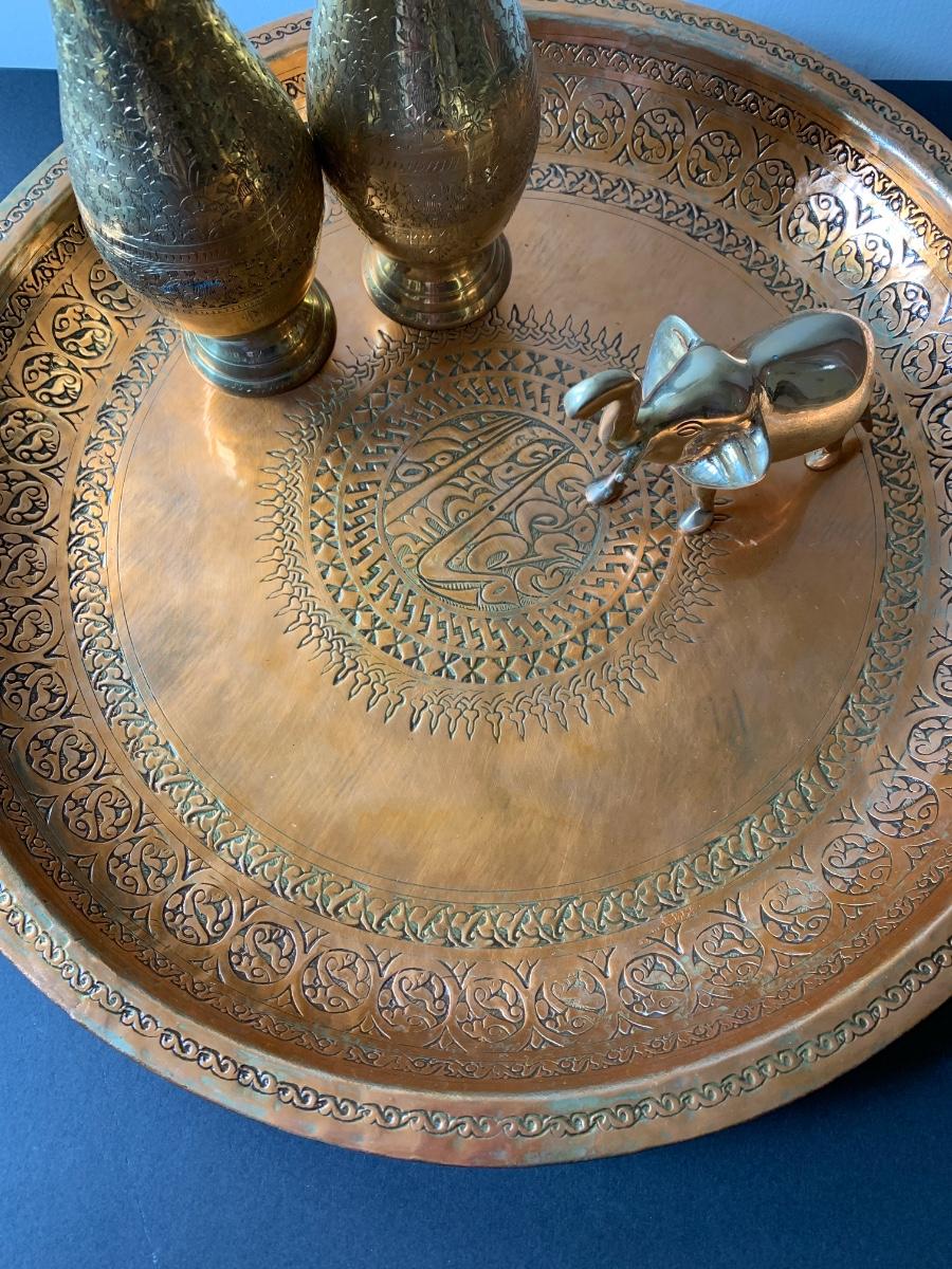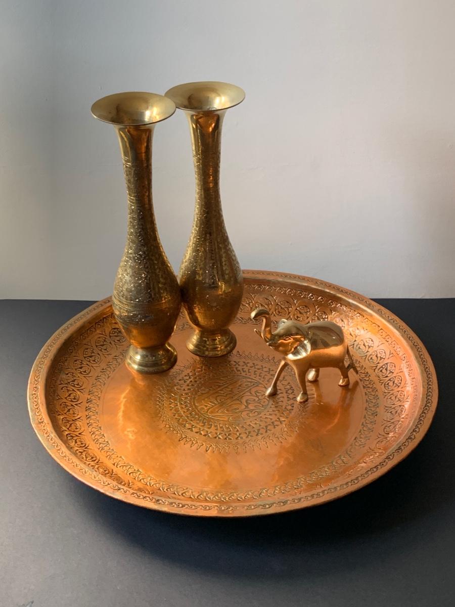 This collection includes a large etched bronze plate, two etched vases, and a small elephant statue.