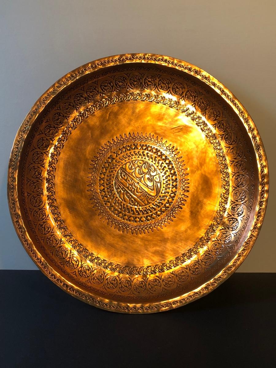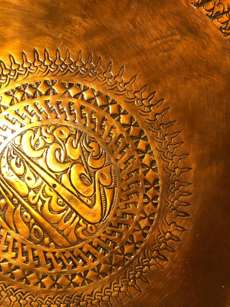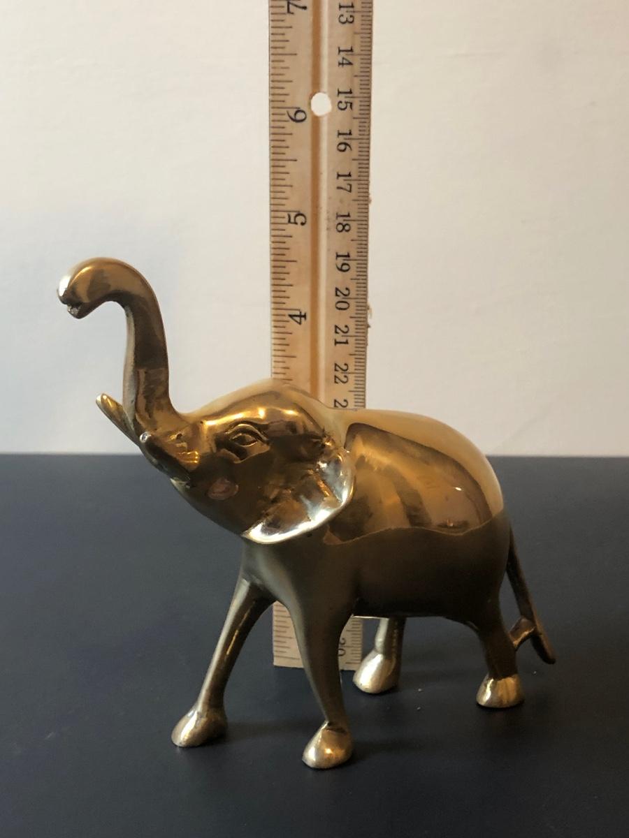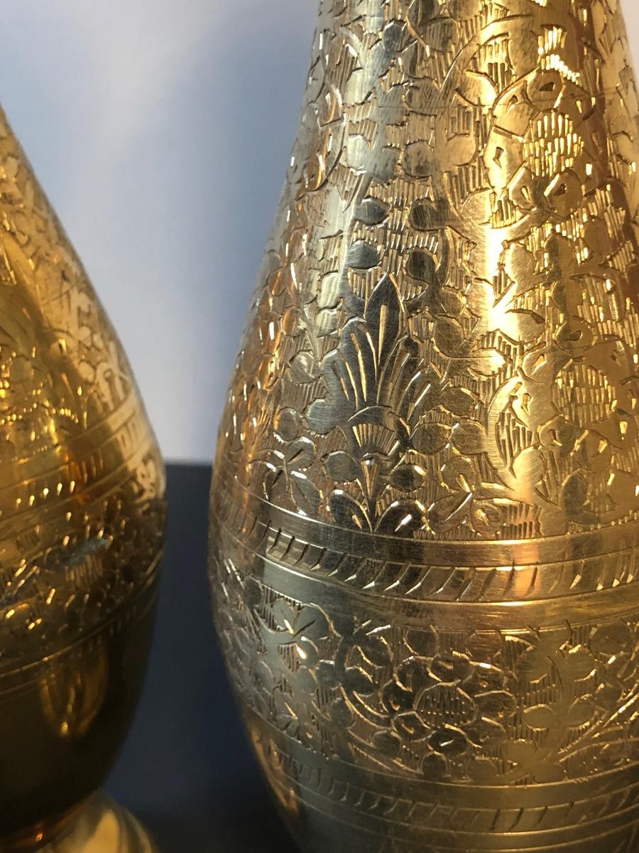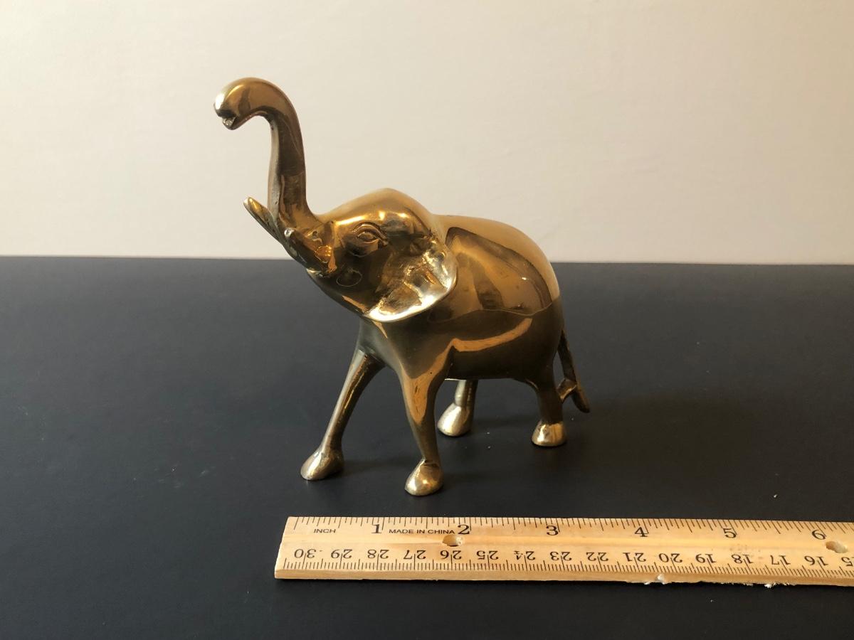 This collection includes a large etched bronze plate, two etched vases, and a small elephant statue.