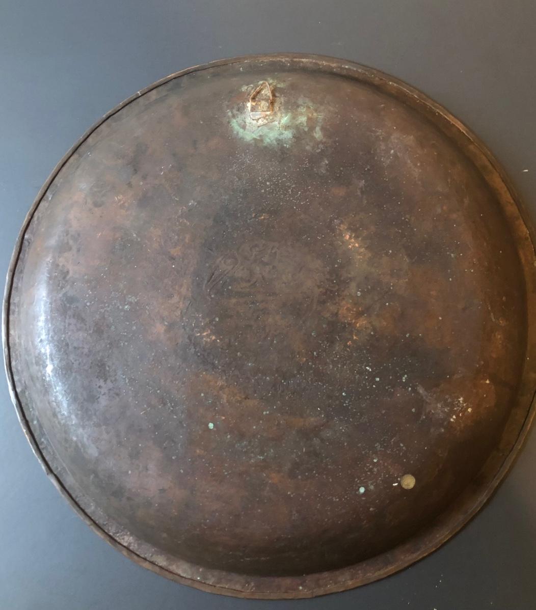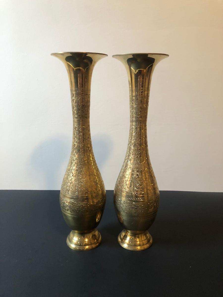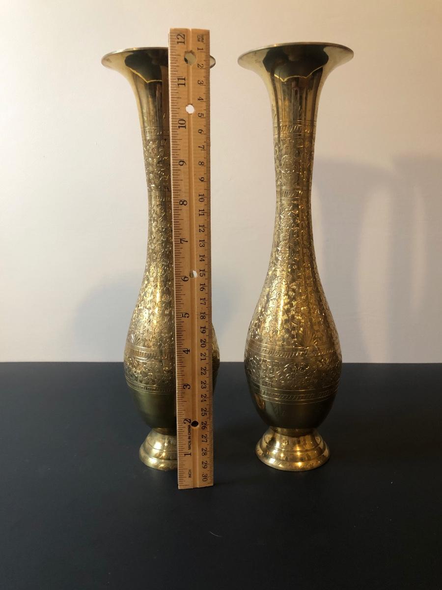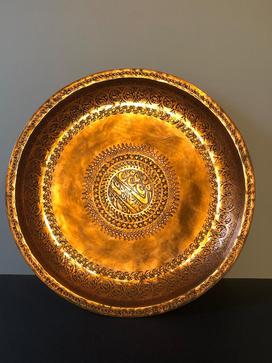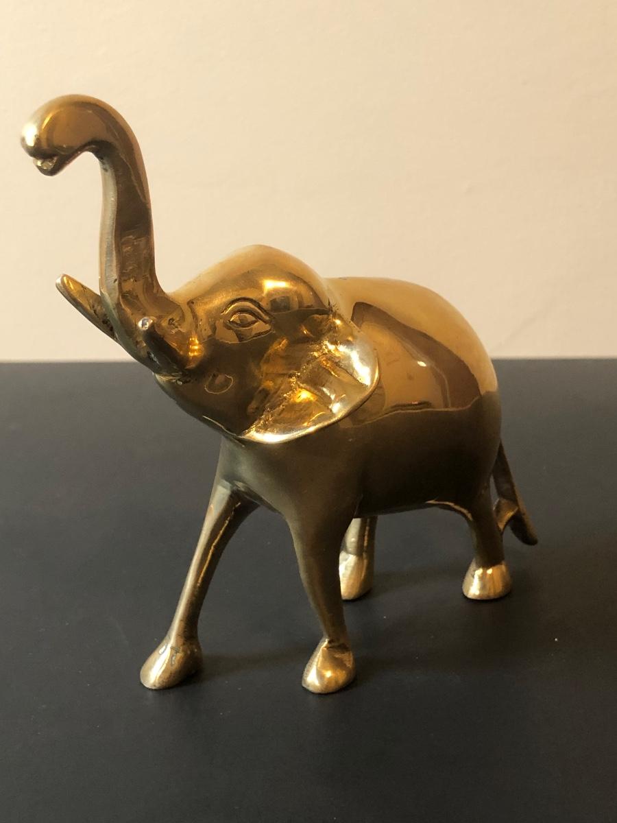 This collection includes a large etched bronze plate, two etched vases, and a small elephant statue.