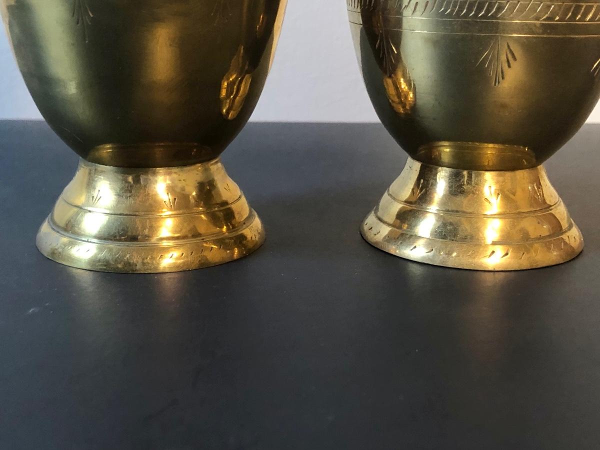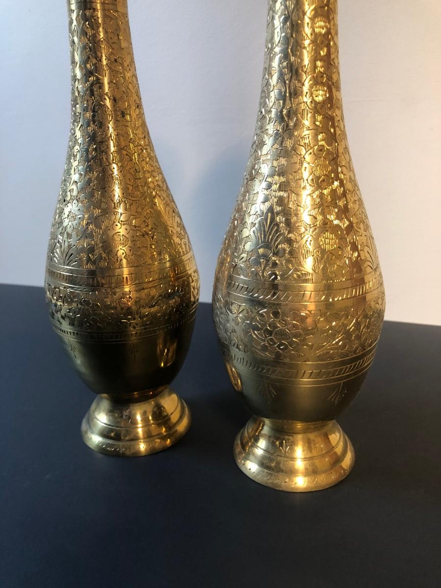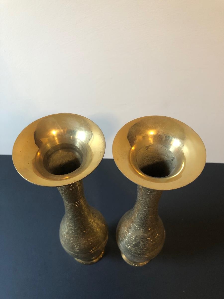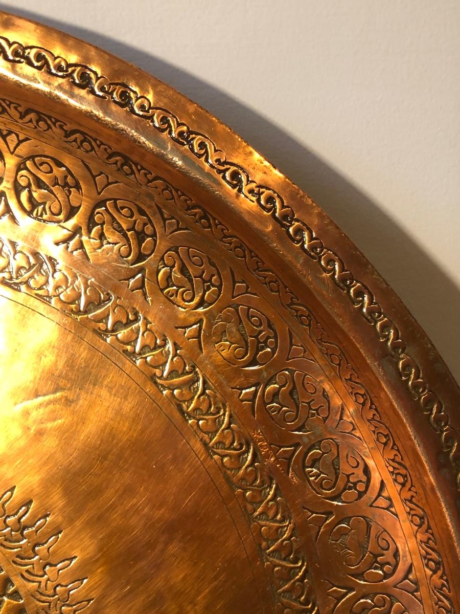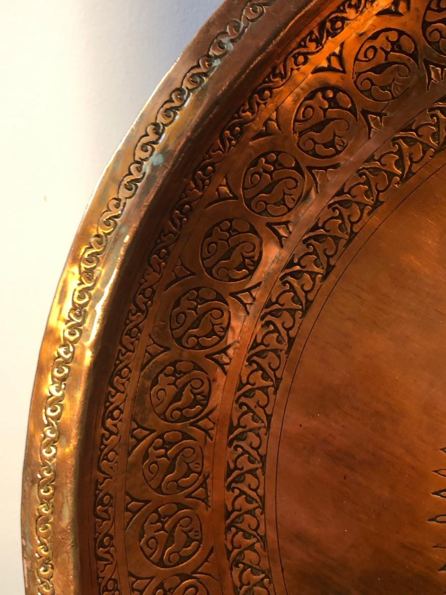 This collection includes a large etched bronze plate, two etched vases, and a small elephant statue.
