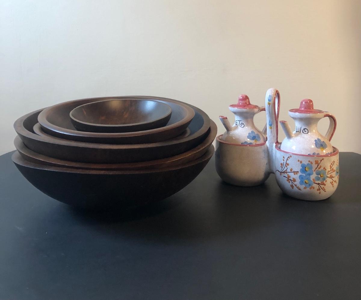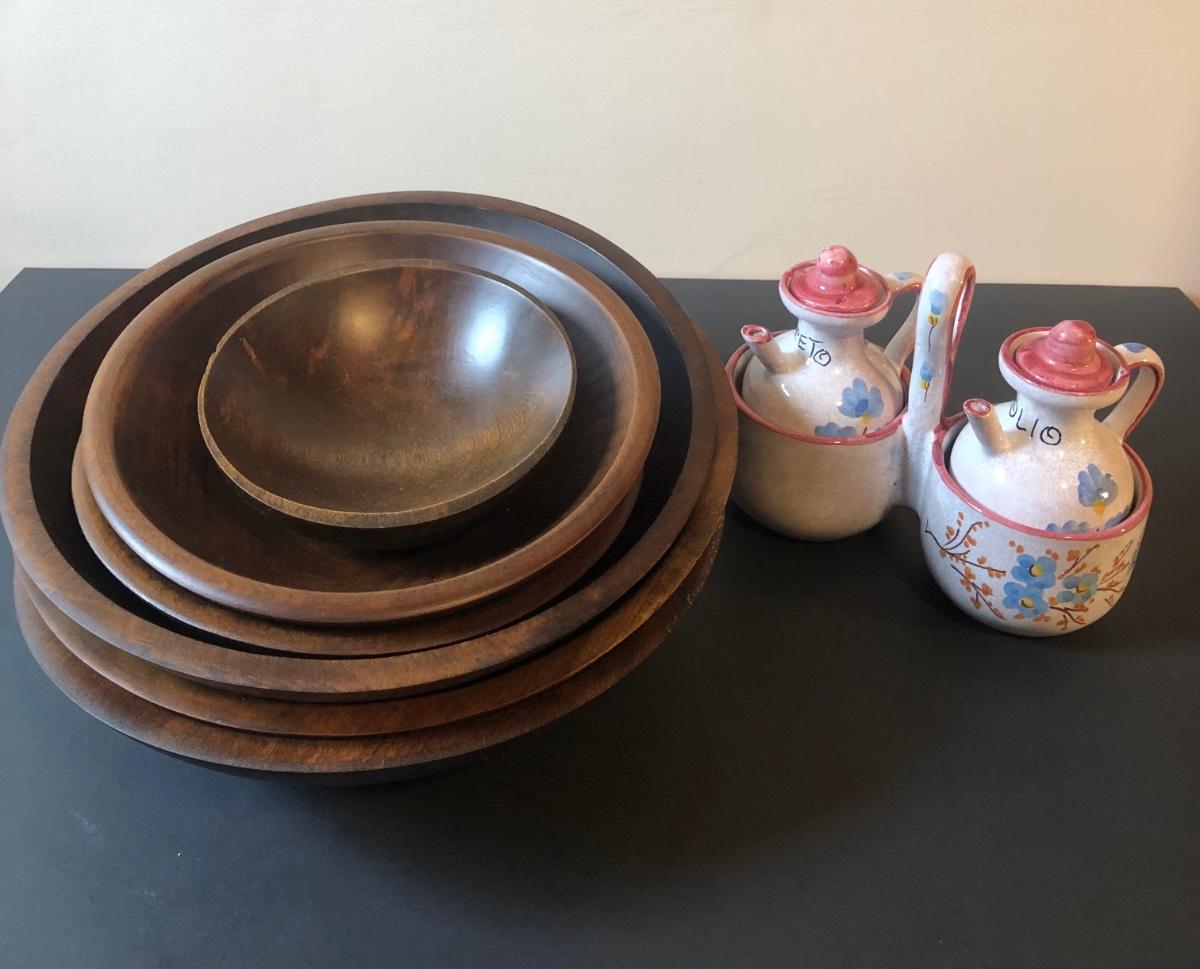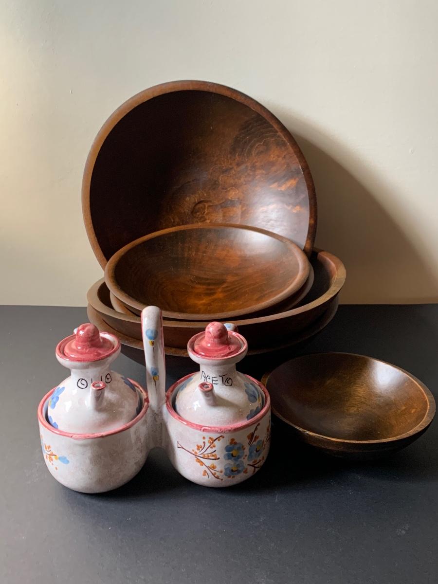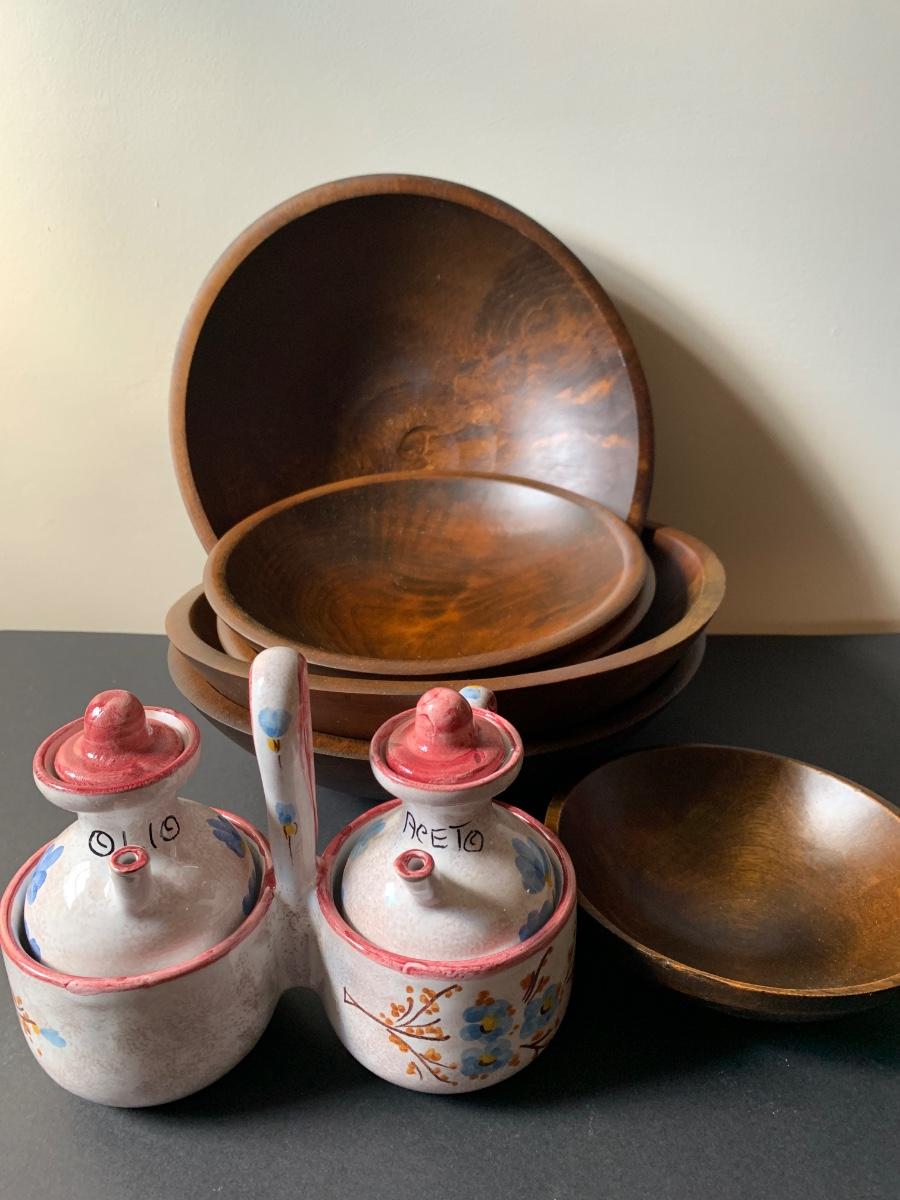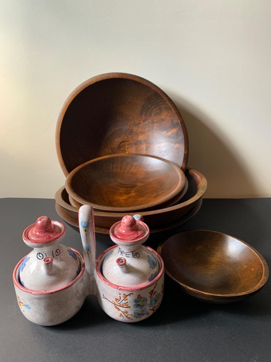 LOT59M: Wooden Bowls, Signed Pottery Oil & Vinegar Set