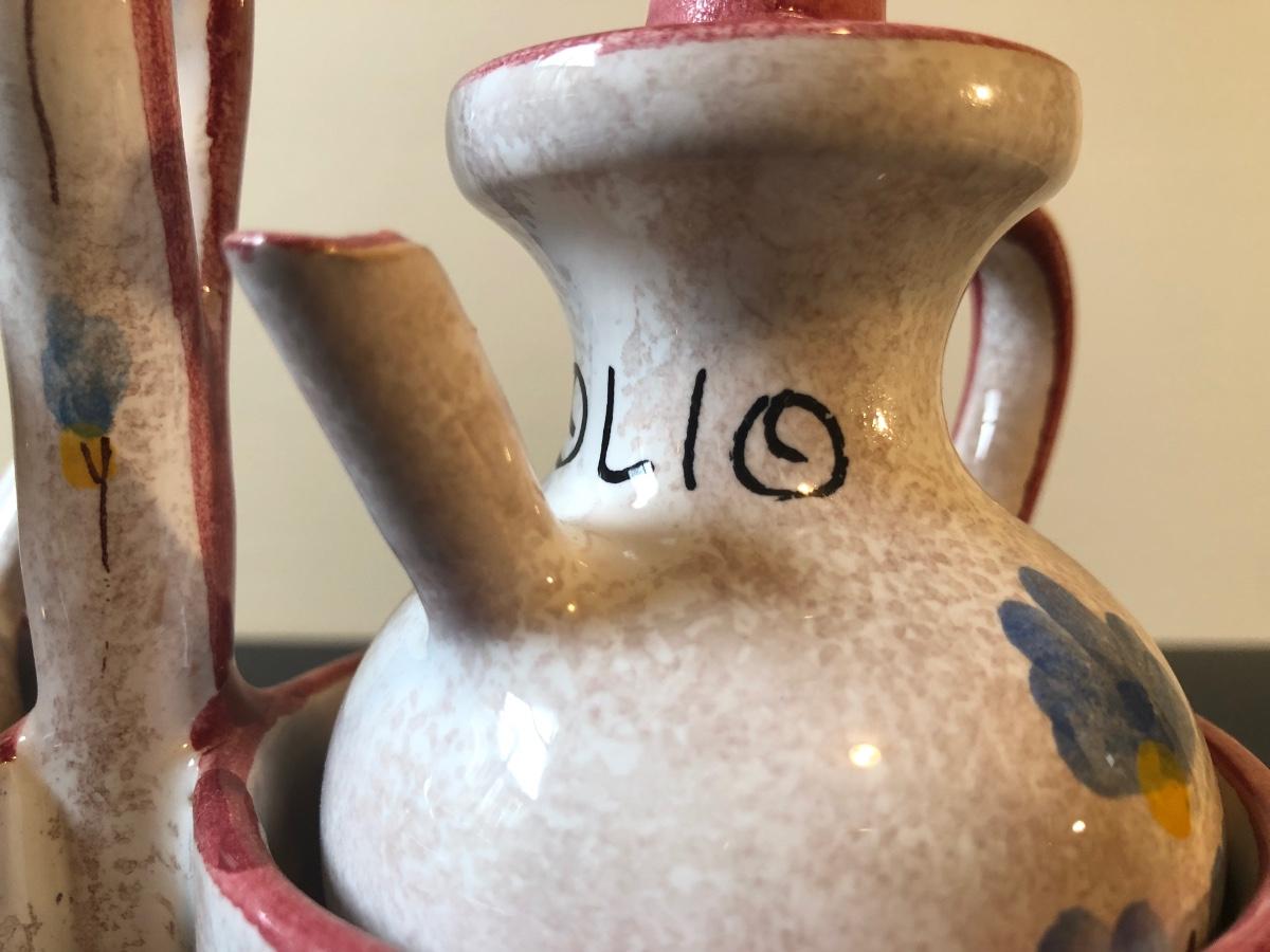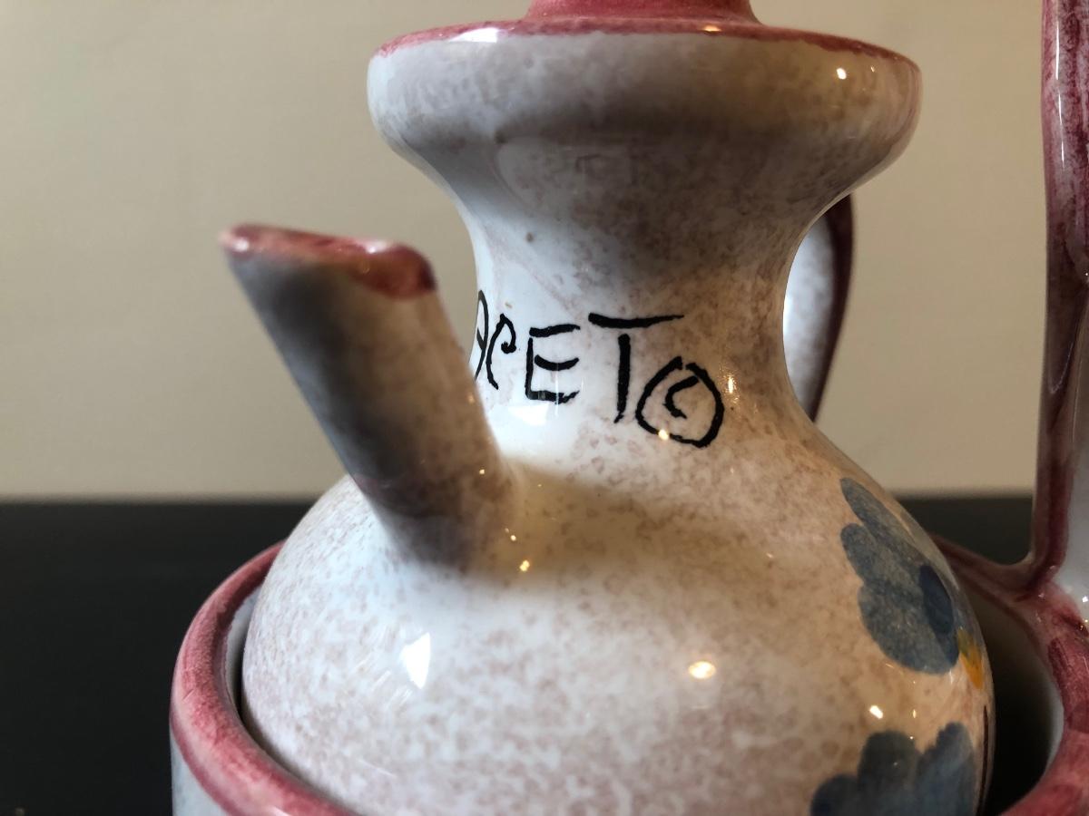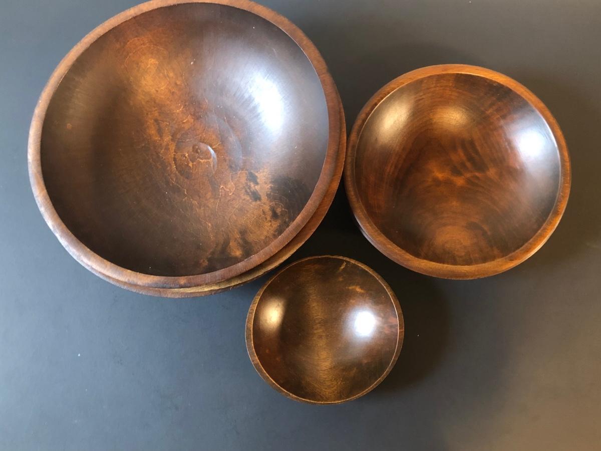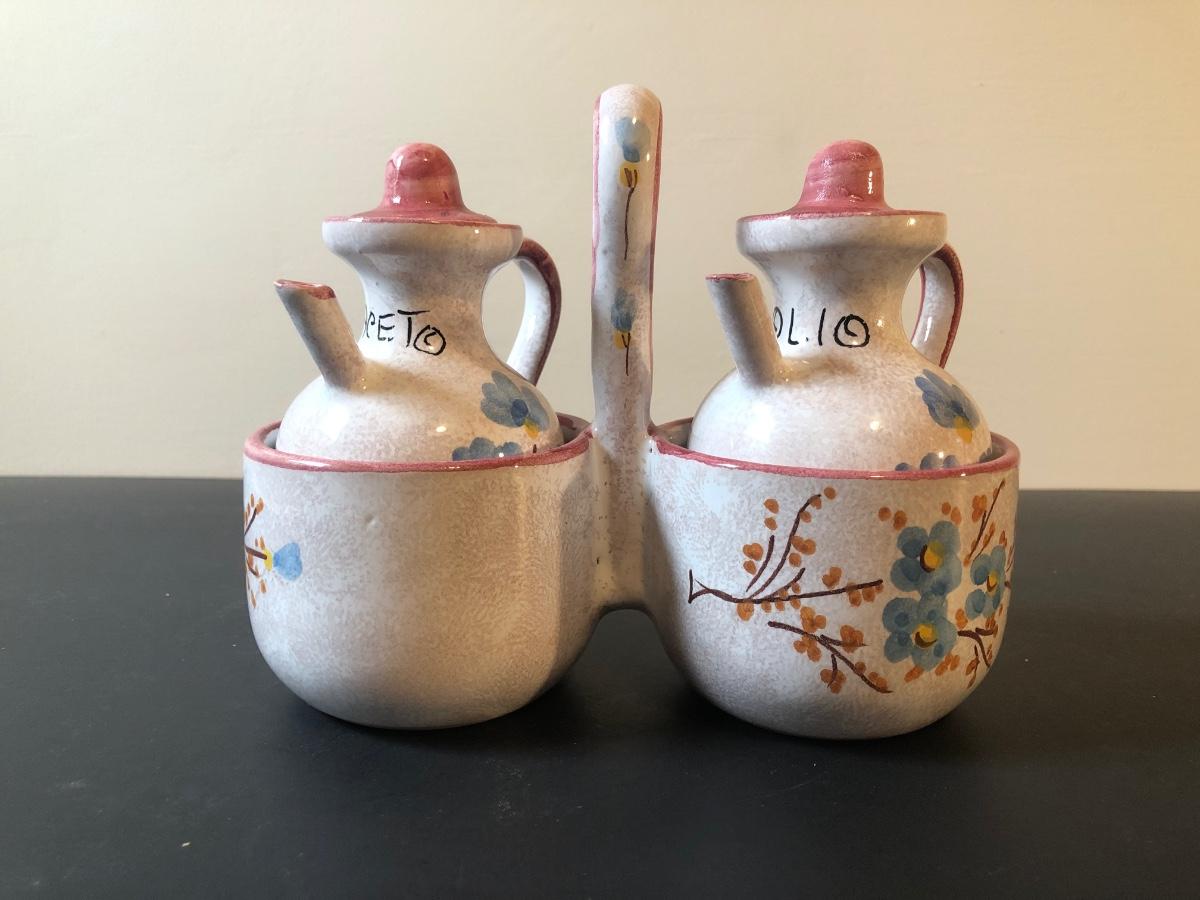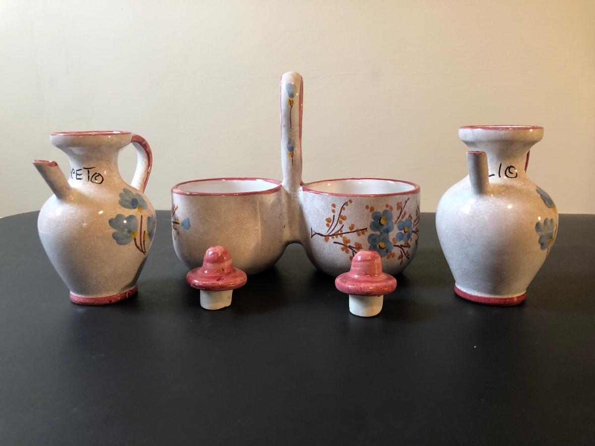LOT59M: Wooden Bowls, Signed Pottery Oil & Vinegar Set