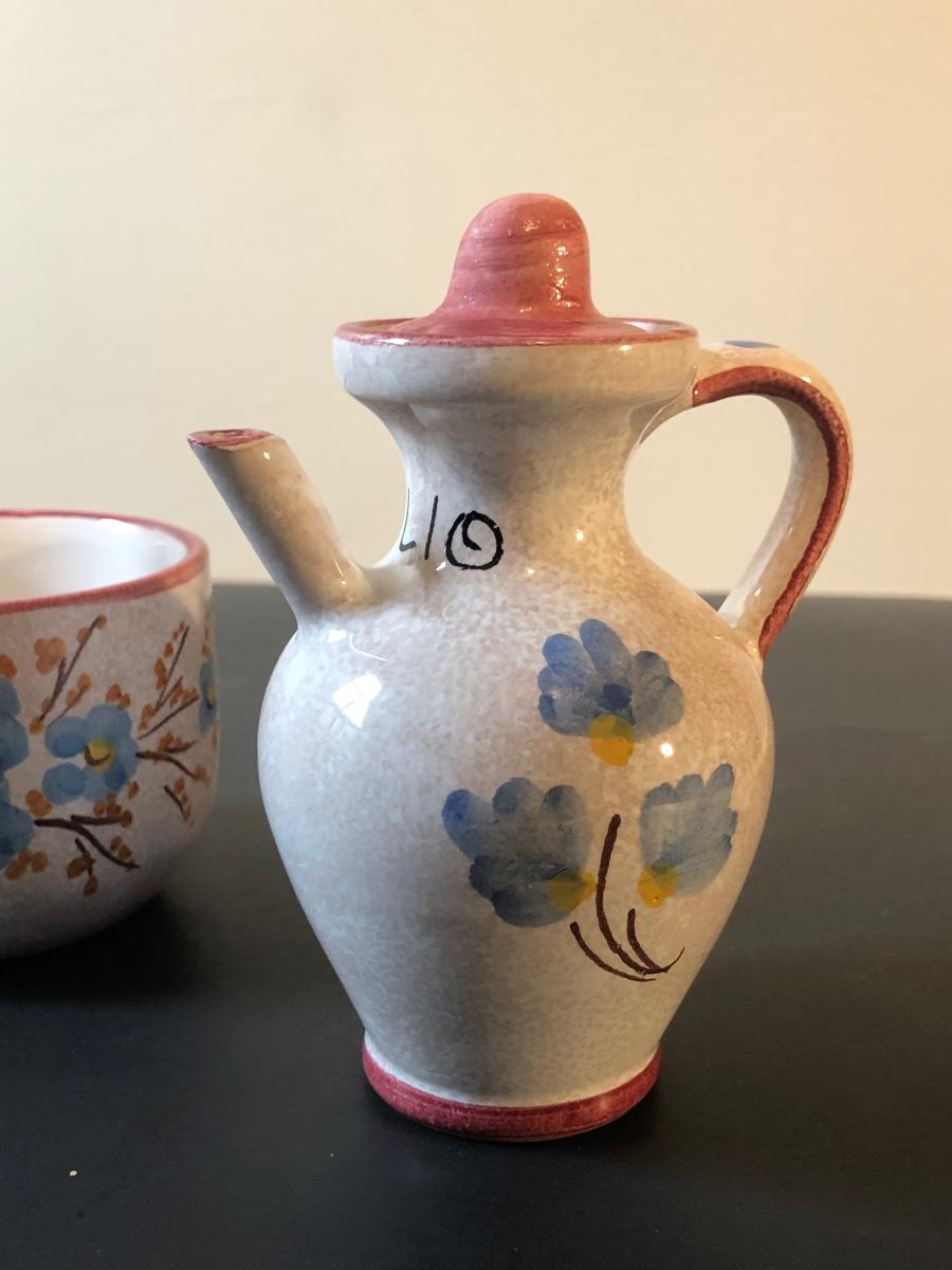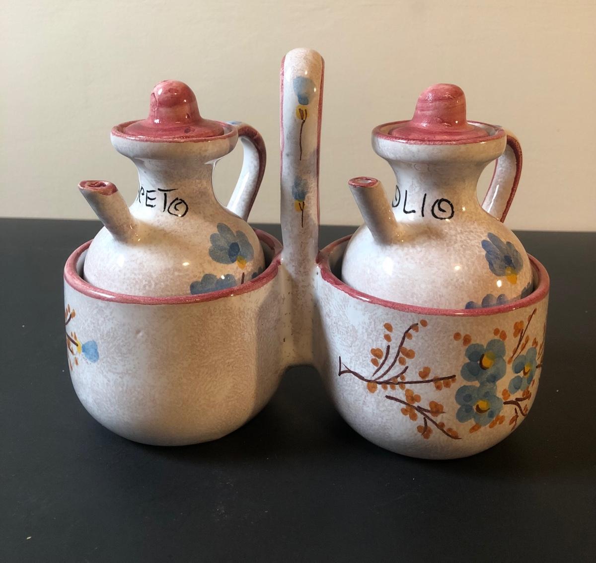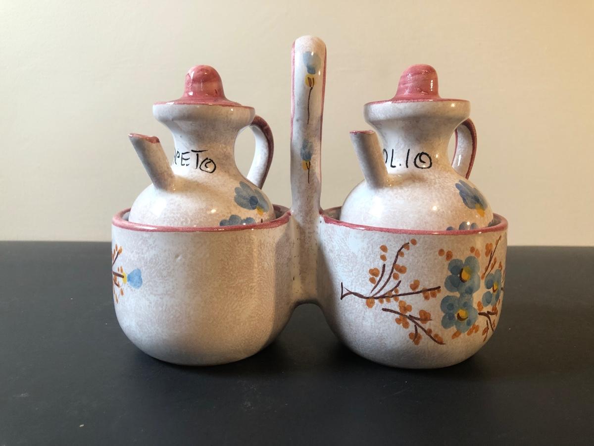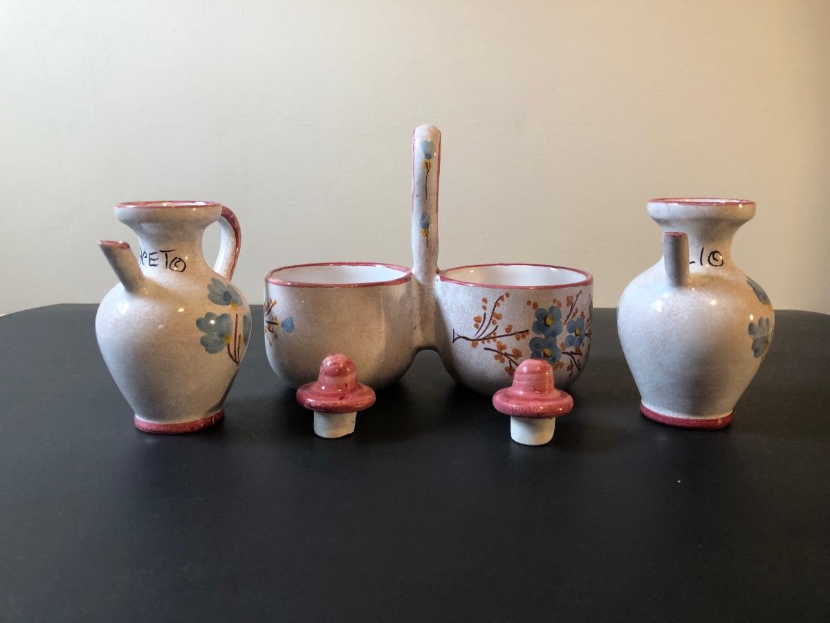 This set includes three 11" bowls, two 8" bowls, and one 6" bowl. Oil and vinegar containers are light colored with flower details and pink accents.