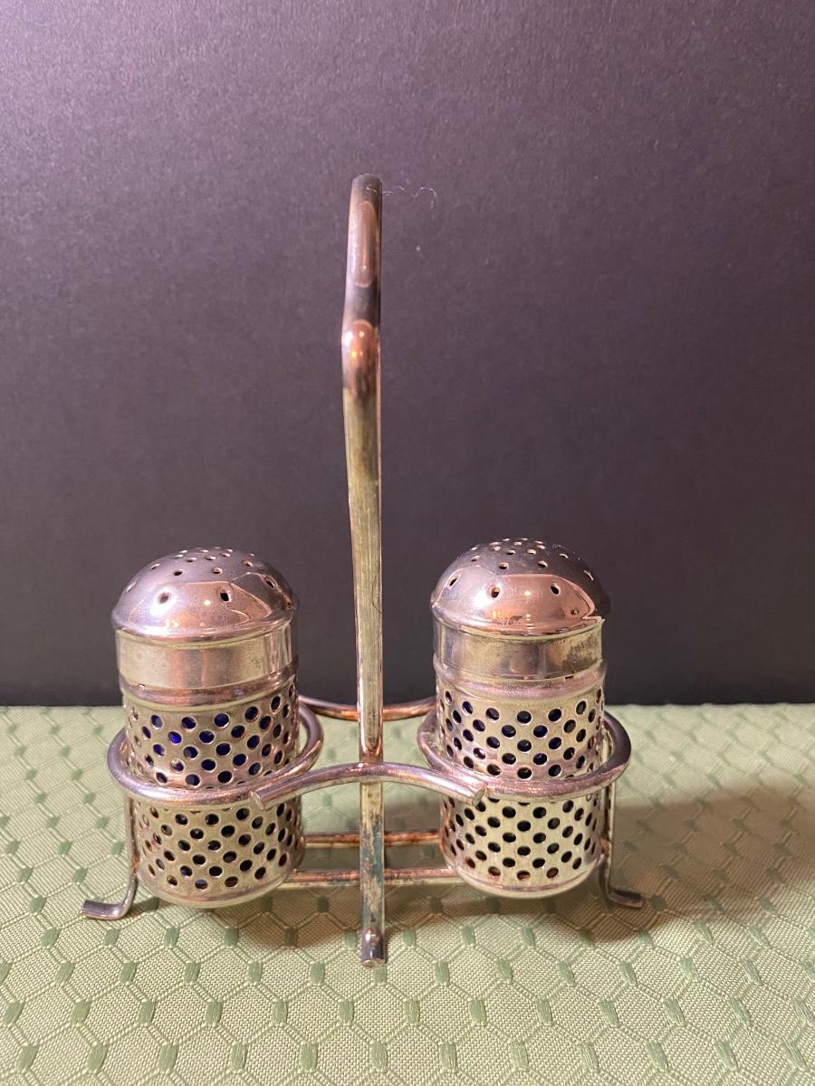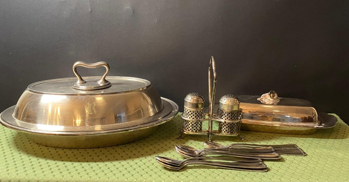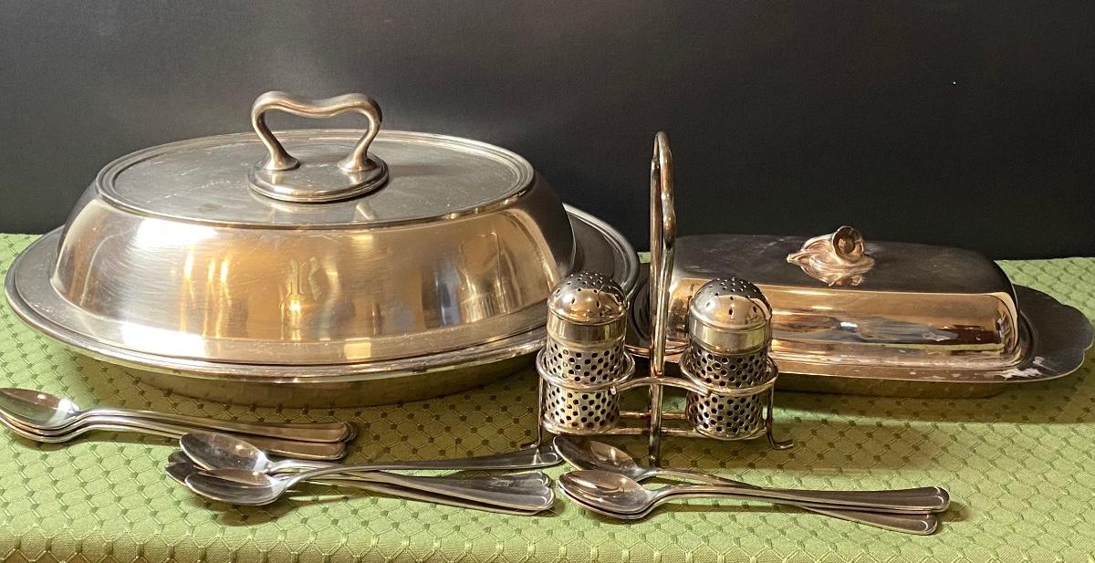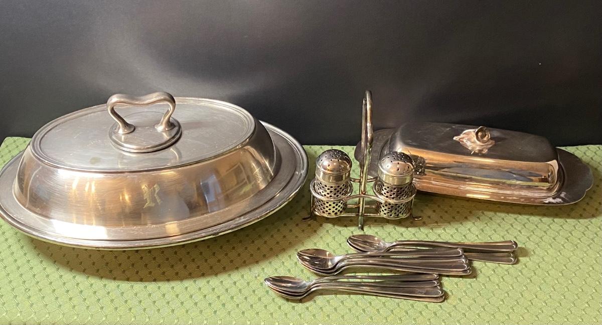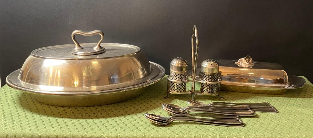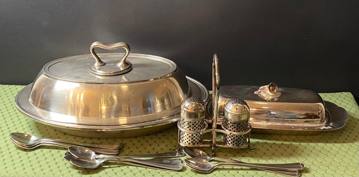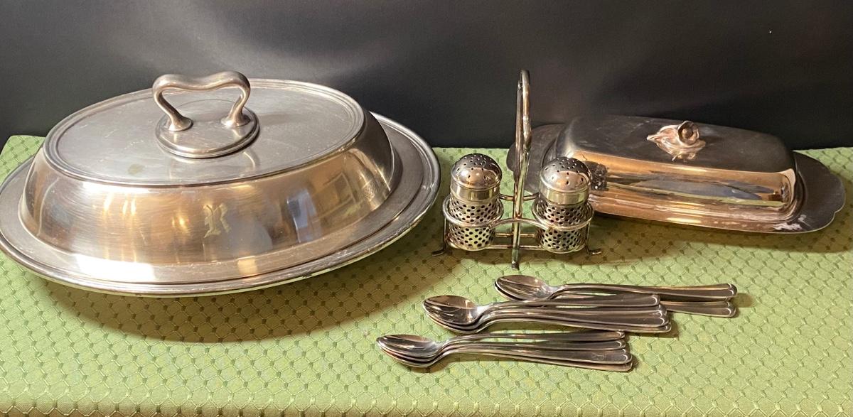 LOT 66C: Stainless Steel Covered Serving & Butter Dish, Salt & Pepper w/Cobalt Blue Inserts