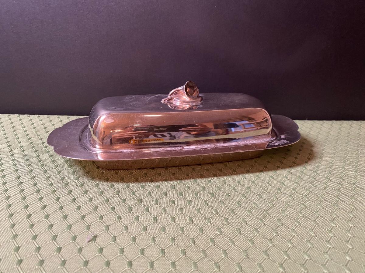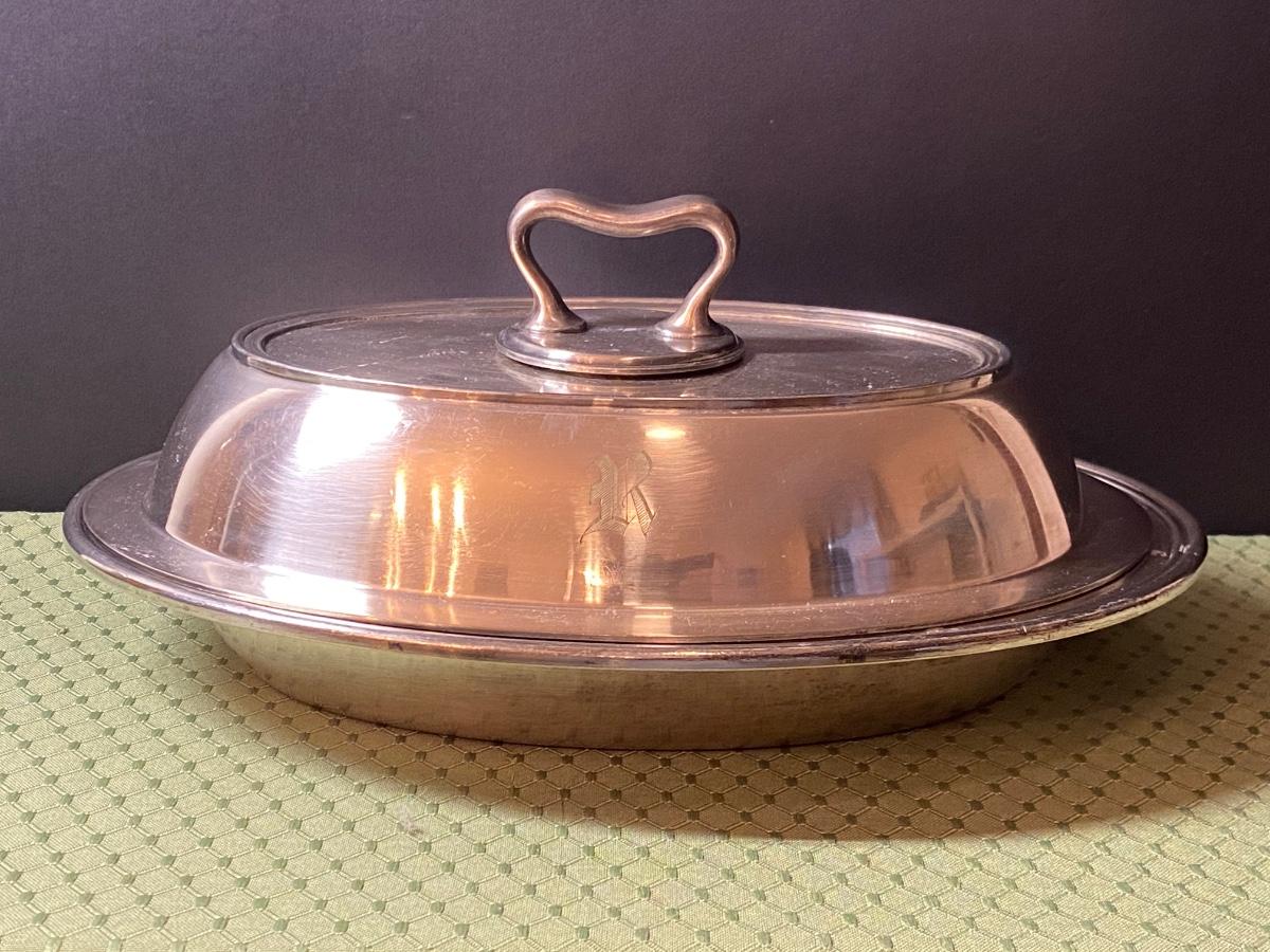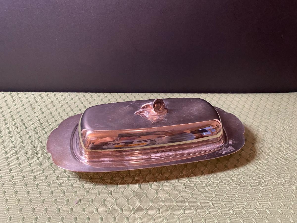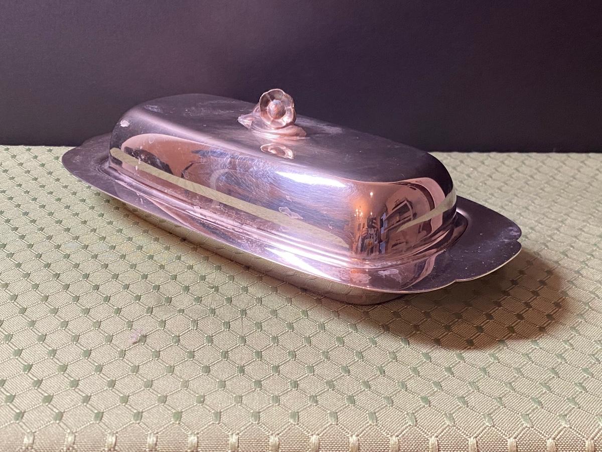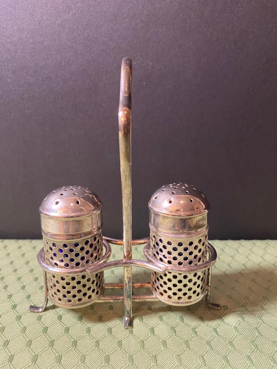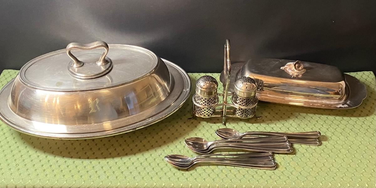 LOT 66C: Stainless Steel Covered Serving & Butter Dish, Salt & Pepper w/Cobalt Blue Inserts