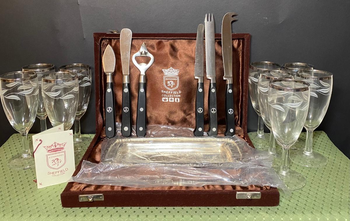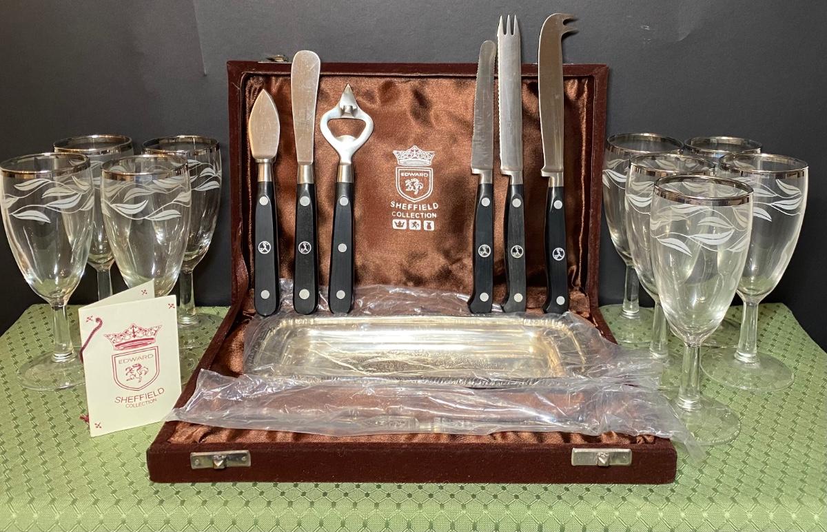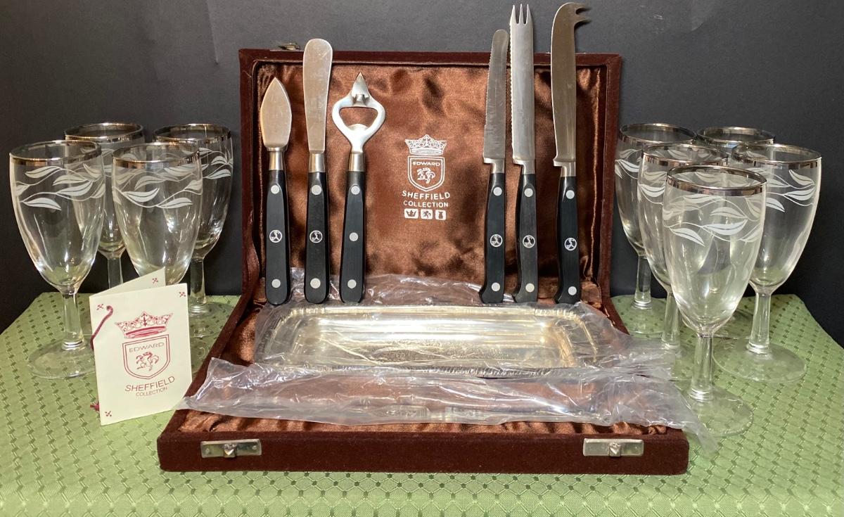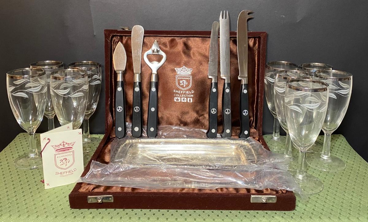 Edward Sheffield Collection serving set in original box. Coricama serving set flatware. 9 Glasses with vintage silver trim. Please see all pictures as they are the best representation of the items. The pictures show condition, measurements if taken, and what is included in the lot. Due to the large amount that we photograph and the time frame, we are not always able to take measurements. All items unless noted, are pre-owned and have been used. If you purchased furniture, you must bring help. We do not allow one person to carry large furniture out on their own. Bring help, tools and a truck for the safety of our client’s homes, and your personal safety. Any damages that result to the property including walls, and floors due to moving of the furniture will be charged to the buyer. Company policy. Thank you.
